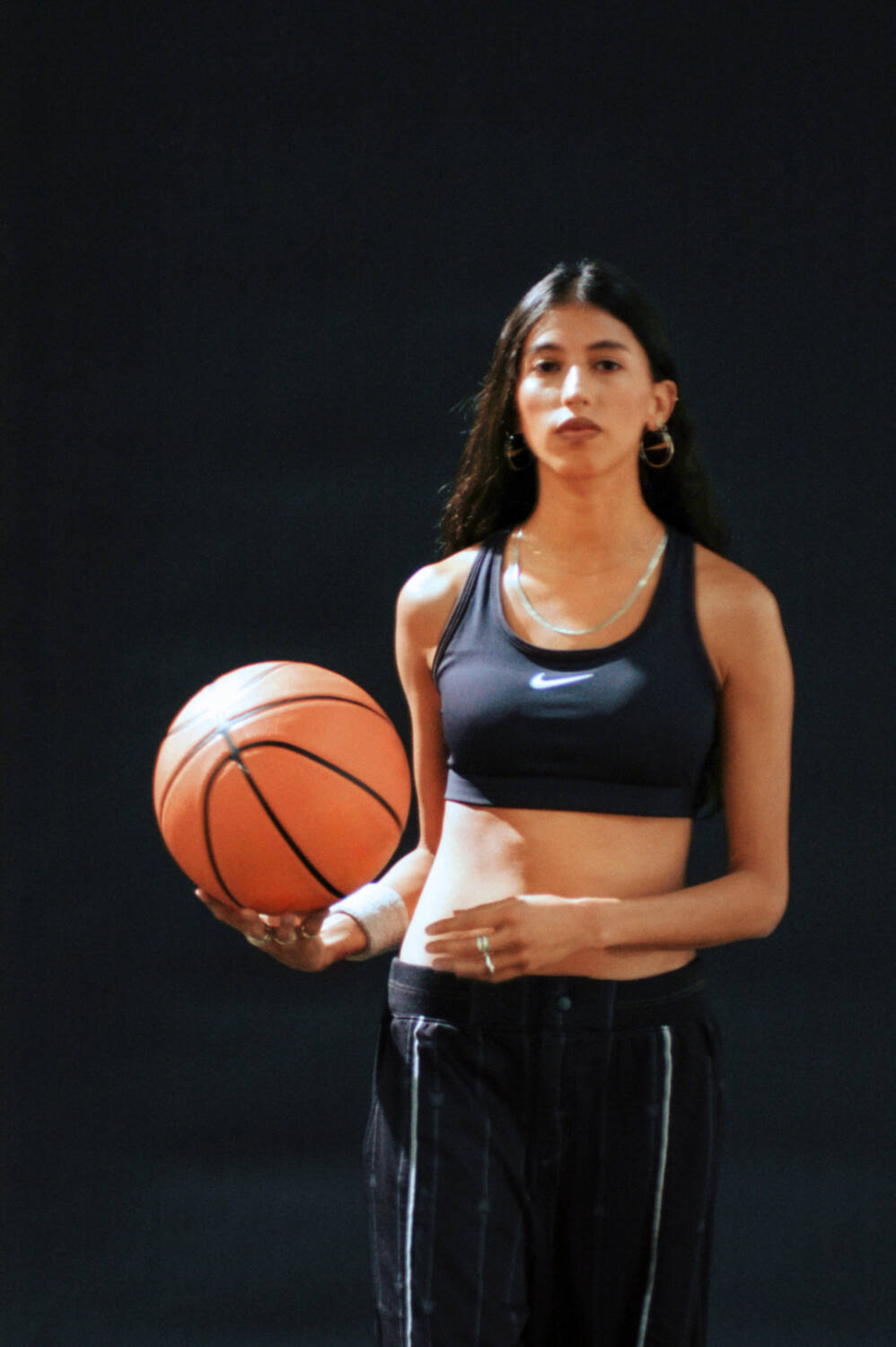 Fernanda wears sports bra by NIKE SWOOSH, pants by NIKE X SWDC, her own jewelry