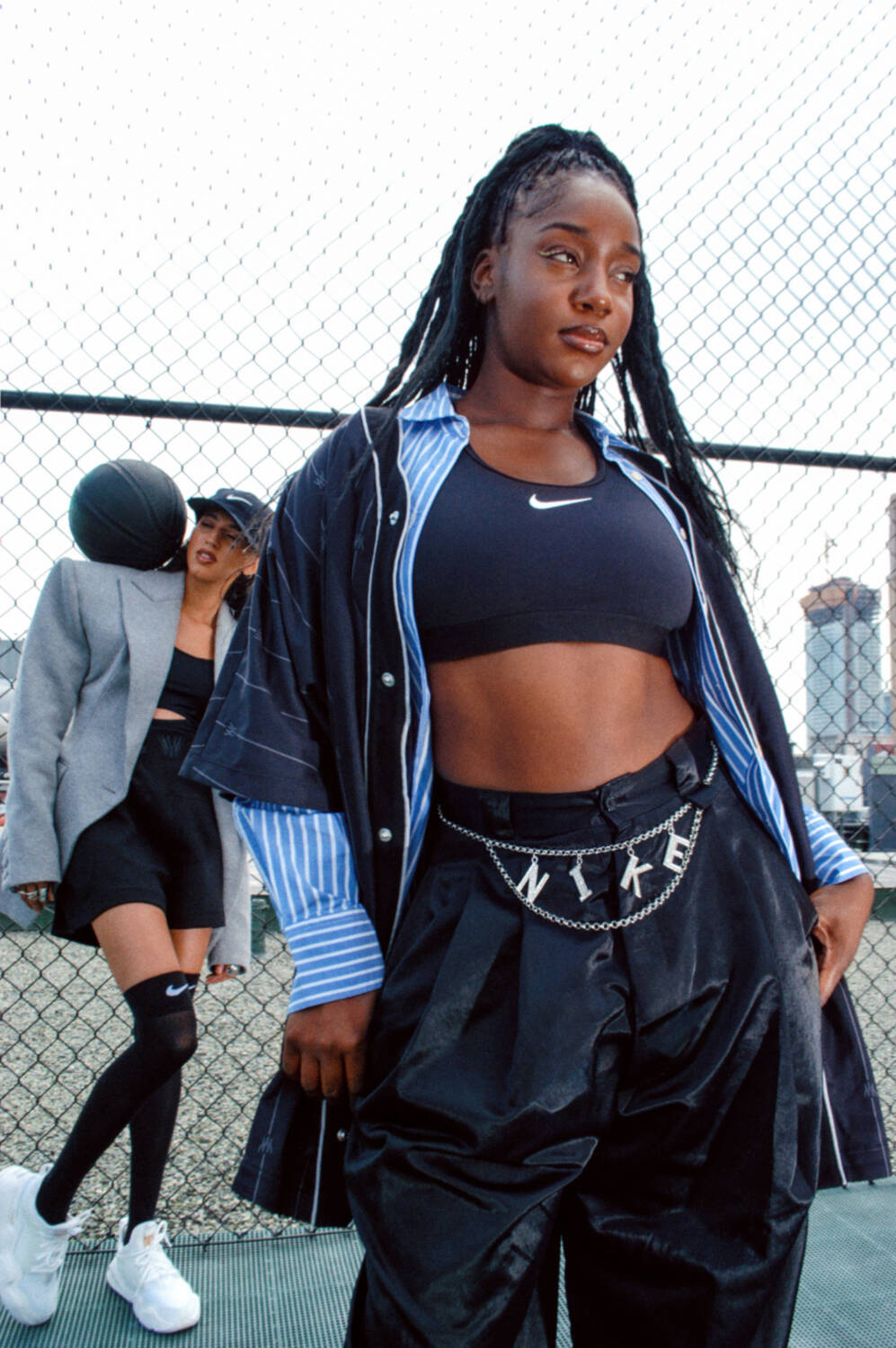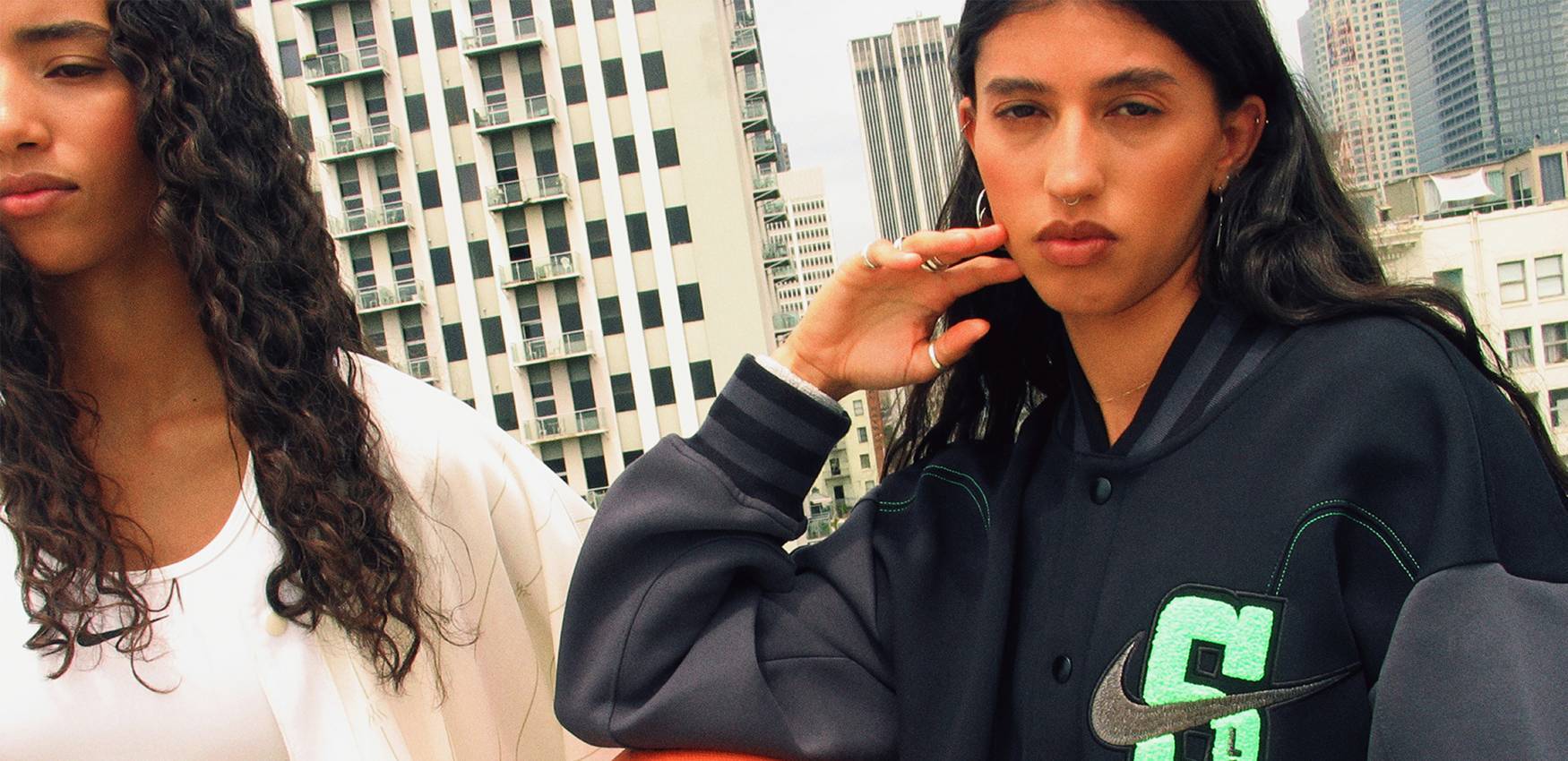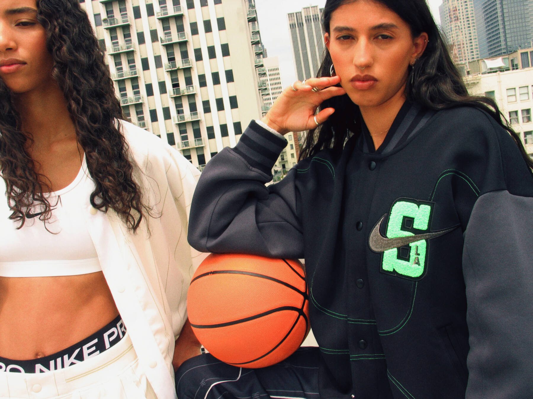 from left: Kenady wears shirt and pants by NIKE X SWDC, sports bra by NIKE SWOOSH, shorts (underneath) by NIKE PRO; Fernanda wears jacket by NIKE X SWDC, her own jewelry
