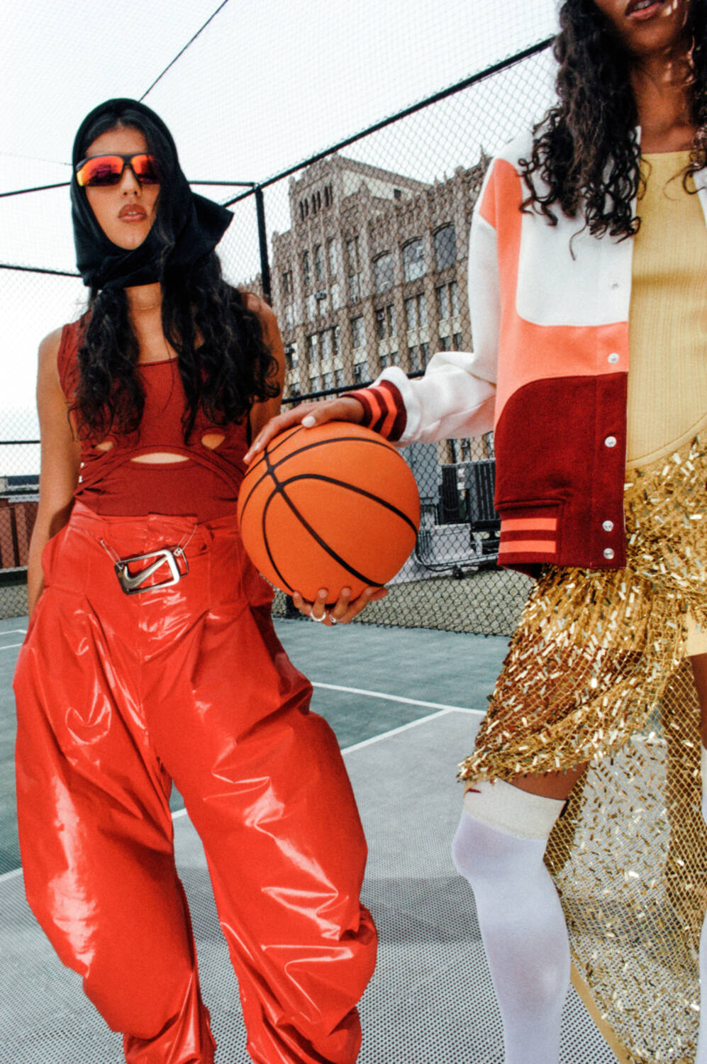 from left: Fernanda wears top by NIKE X SWDC, pants by ESQUINA, scarf by MISS CLAIRE SULLIVAN, sunglasses by NIKE, belt buckle stylist’s own; Kenady wearsjacket and socks by NIKE X SWDC, dress by CPLUS SERIES