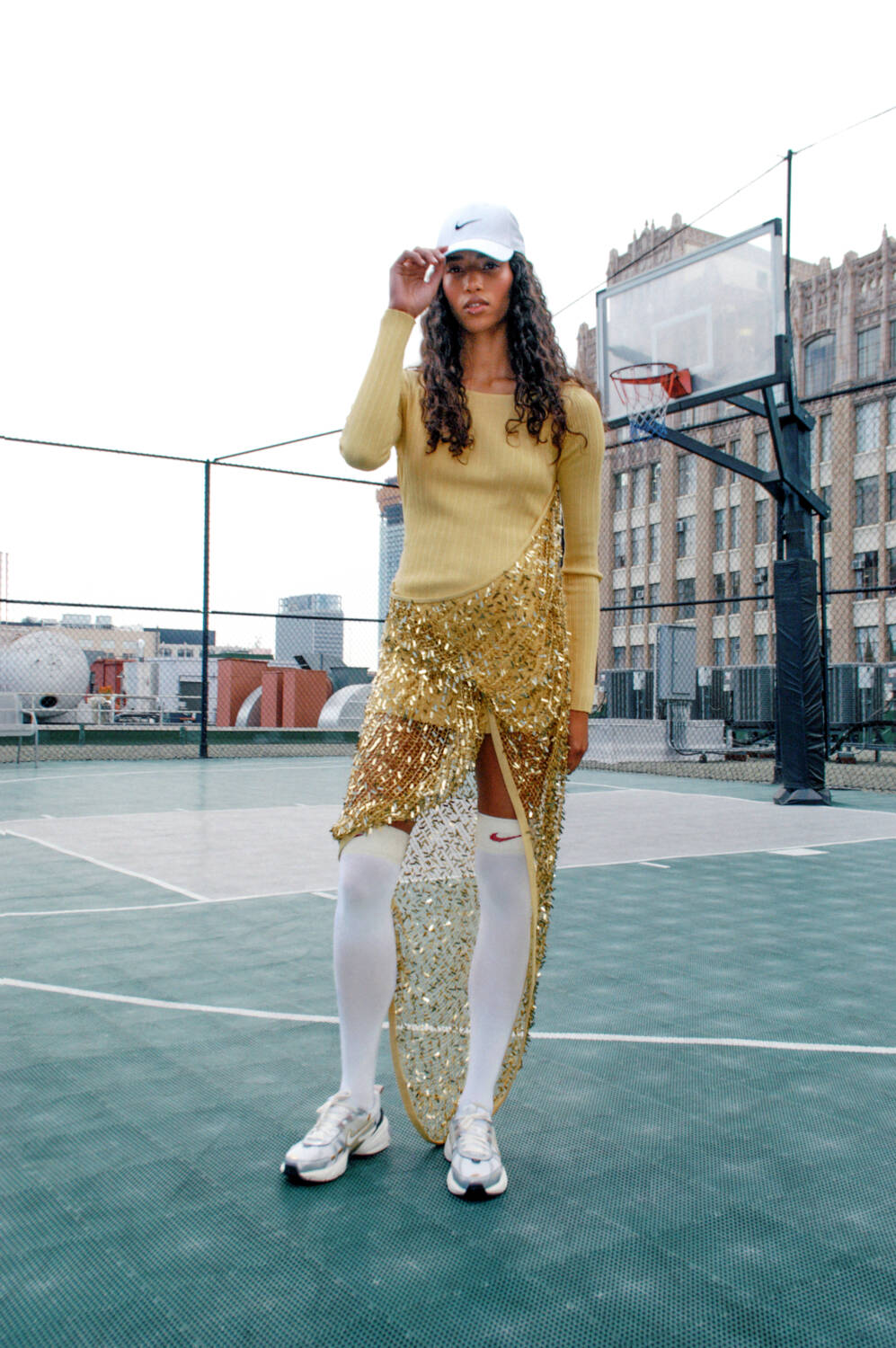 Fernanda wears jacket by MARK GONG, top and shorts by NIKE X SWDC, cap by NIKE, her own jewelry