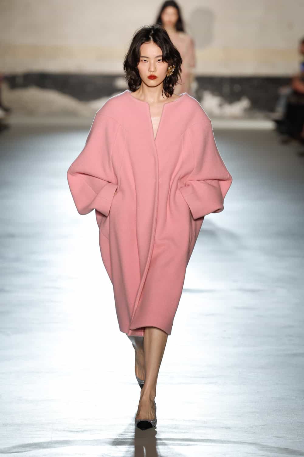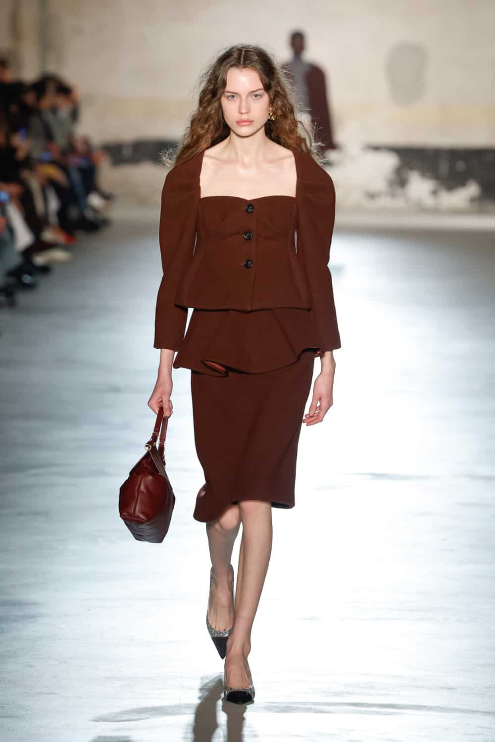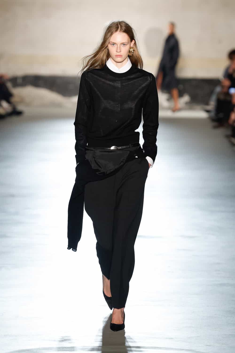 Dell’Acqua’s message? Femininity, but make it real. He wanted to propose an everyday expression of womanhood; one that is rooted in shared lived experiences. Loosely based on dress aesthetics of the 1940s, the show begins with a series of black, intentionally minimal looks. Progressing in shape and volume – think wide sack-dresses with textured white collars and encapsulating kimono-style overcoats with loose form – the garments speak Dell’Acqua’s language of minimalism whilst cocooning the body in layers which demand space. The chosen bag of the season, the medium-sized Cabiria, adorns hands with a look-finishing touch.