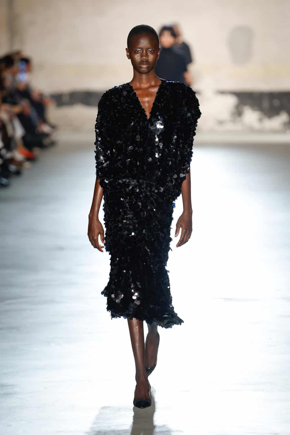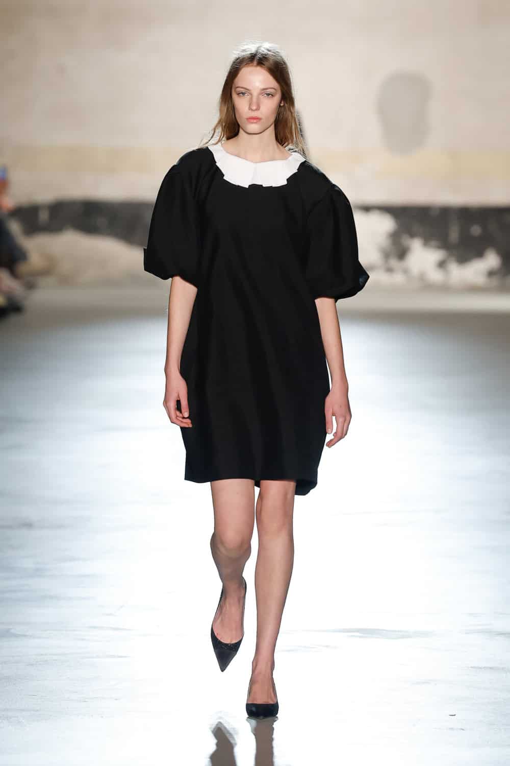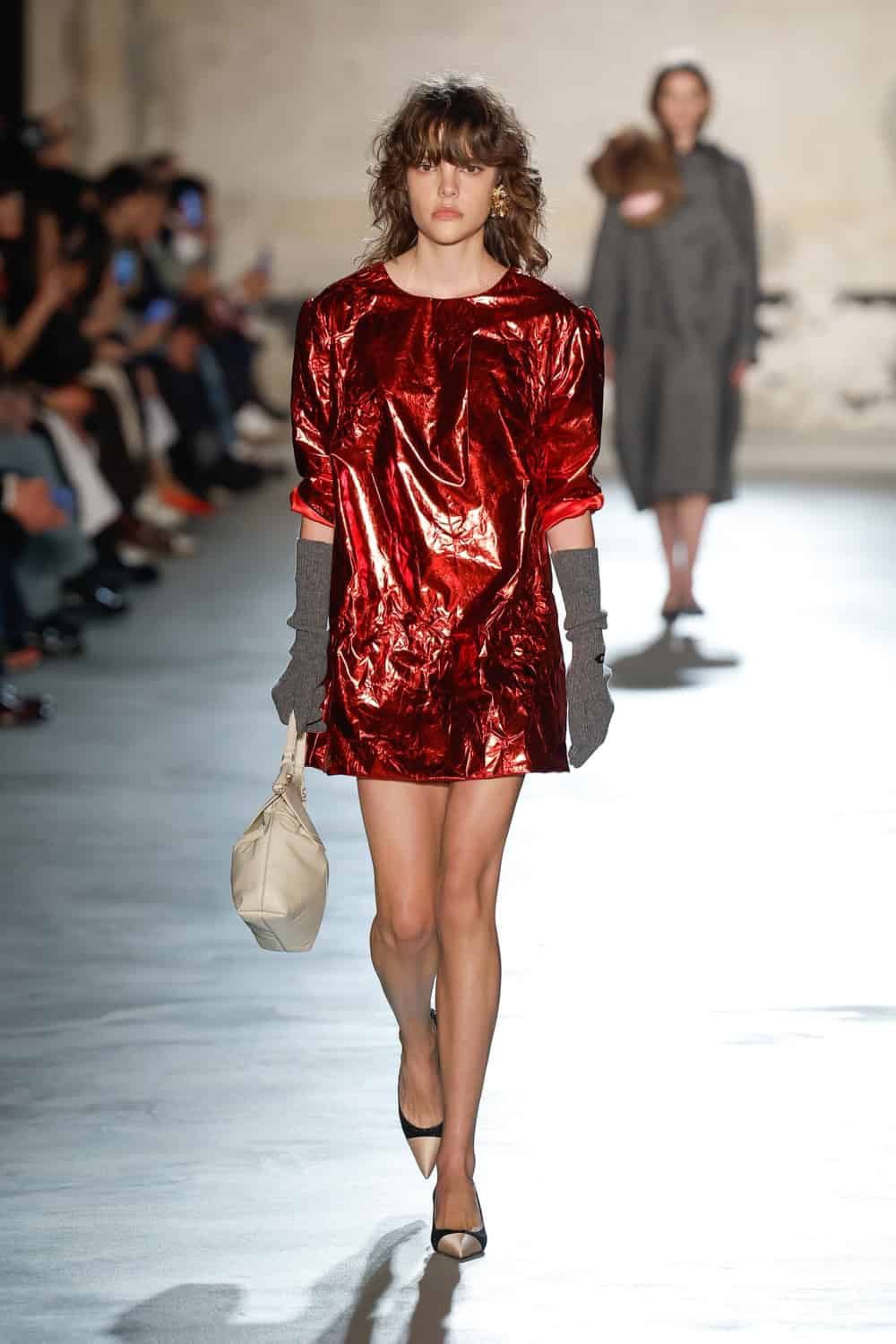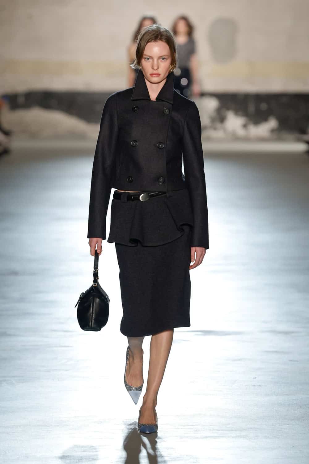Dell’Acqua’s message? Femininity, but make it real. He wanted to propose an everyday expression of womanhood; one that is rooted in shared lived experiences. Loosely based on dress aesthetics of the 1940s, the show begins with a series of black, intentionally minimal looks. Progressing in shape and volume – think wide sack-dresses with textured white collars and encapsulating kimono-style overcoats with loose form – the garments speak Dell’Acqua’s language of minimalism whilst cocooning the body in layers which demand space. The chosen bag of the season, the medium-sized Cabiria, adorns hands with a look-finishing touch.