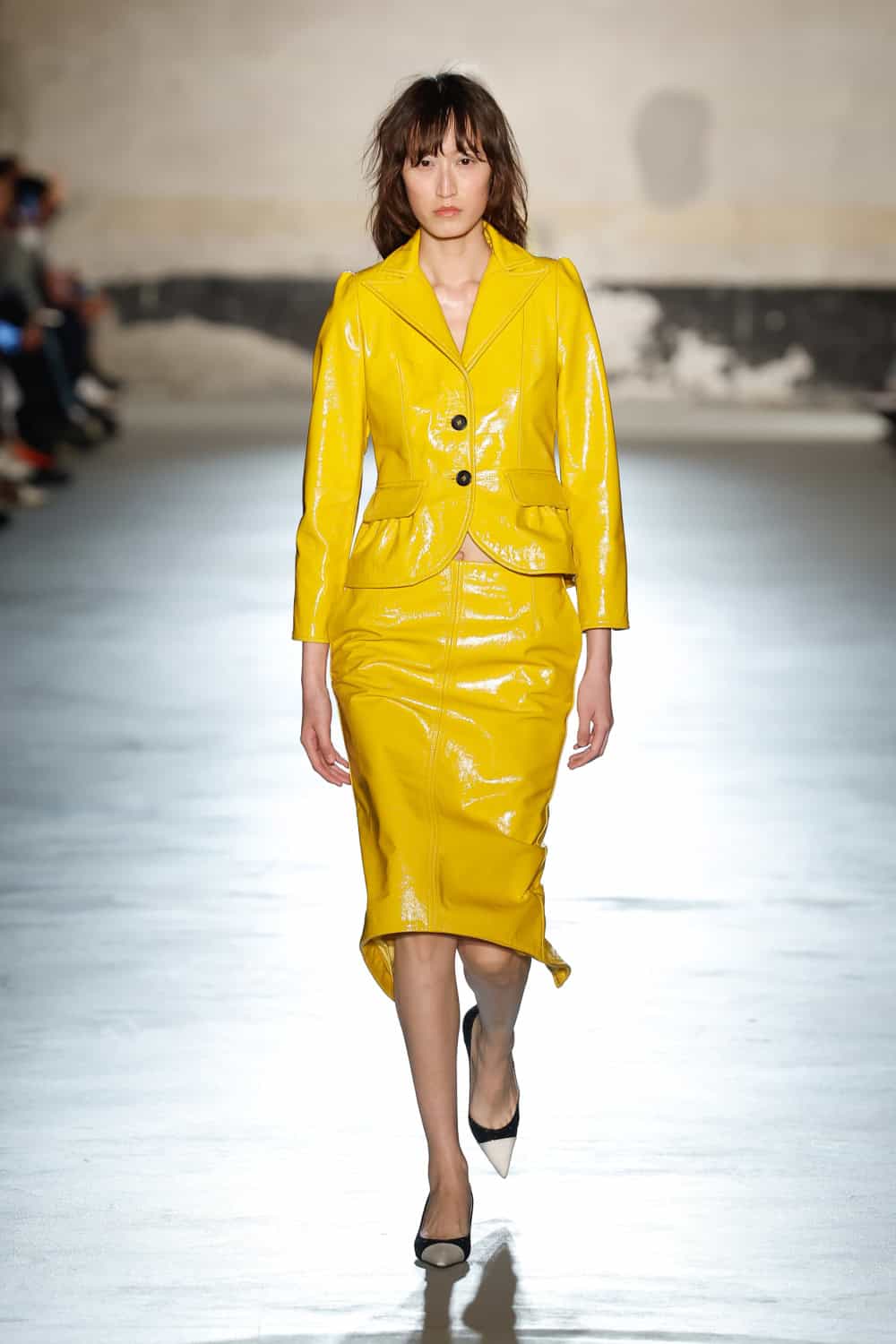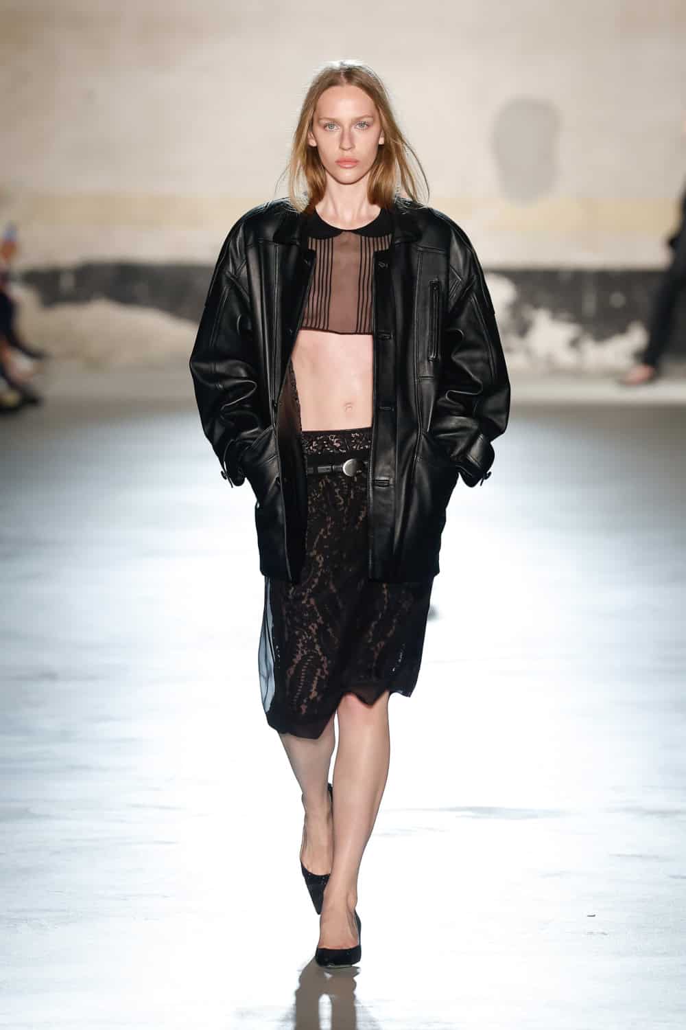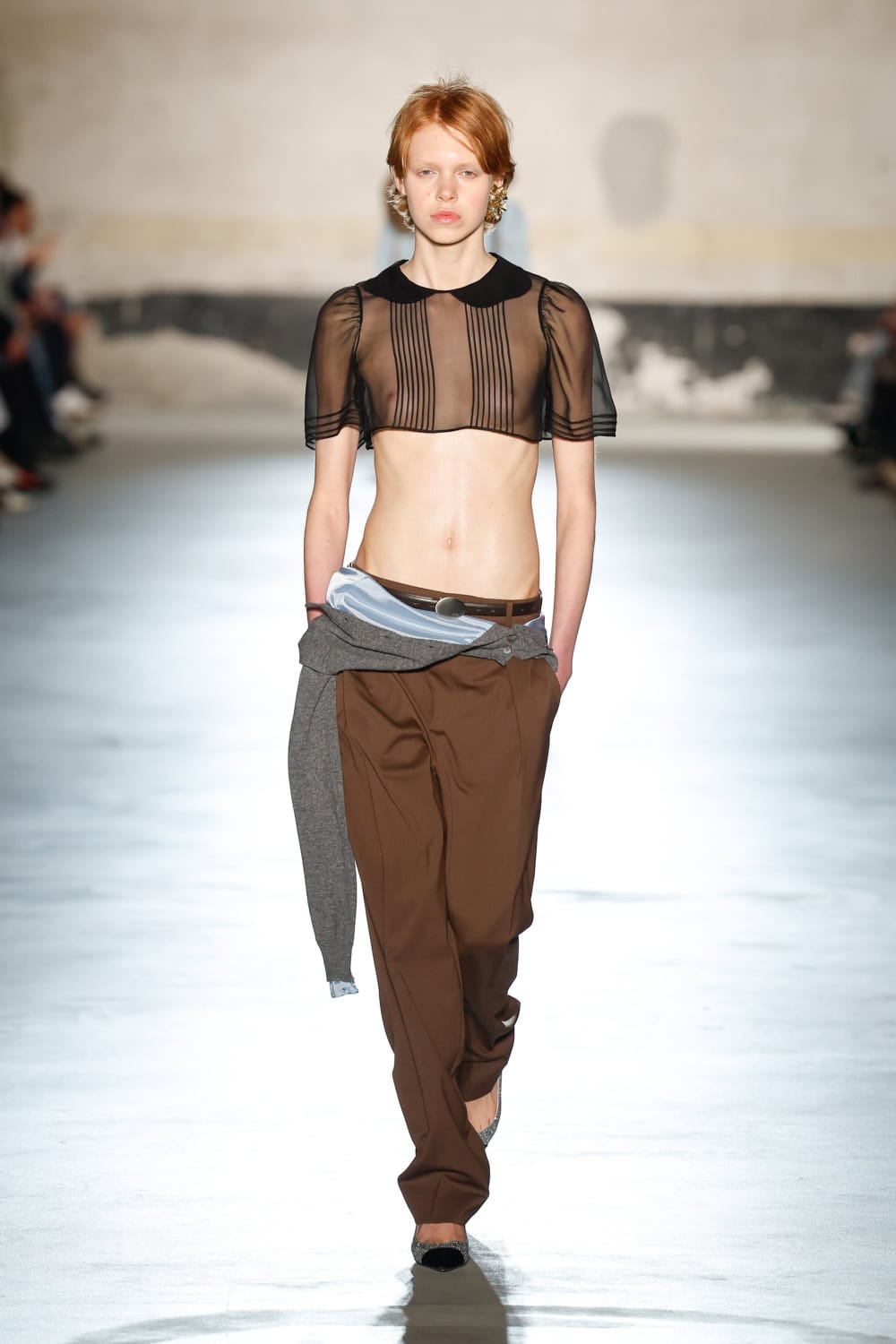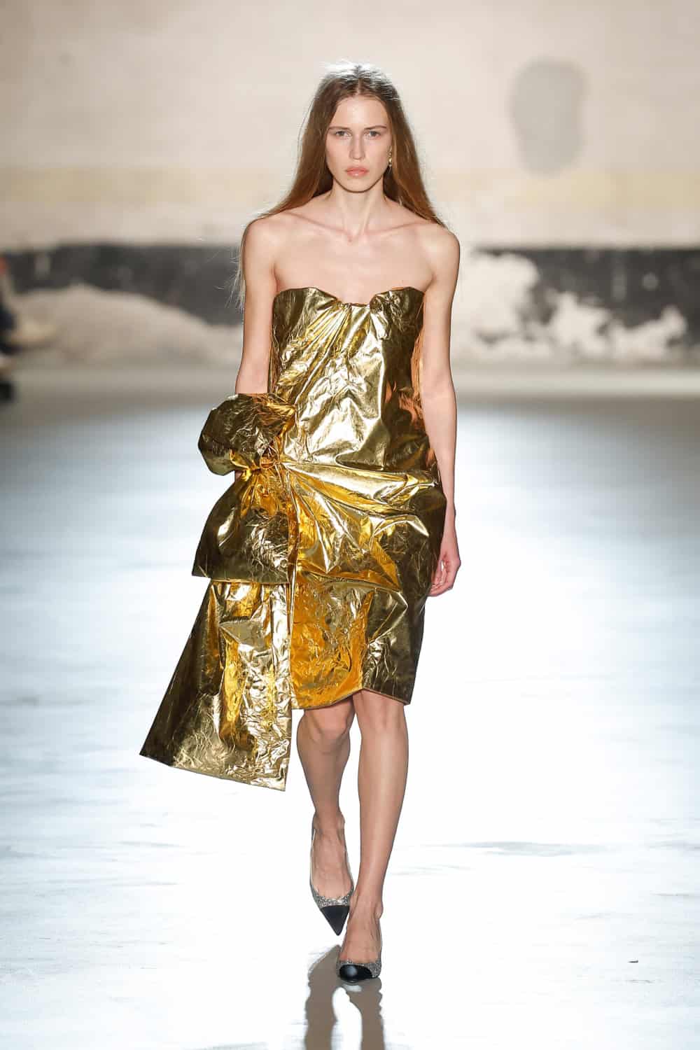 But the devil really lives in the details; bedazzled collars bleed into structured shoulders, skin is bared with cropped transparent shirts and bodysuits, skirts and mini dresses are completed with utilitarian bombers and slouchy knit gloves. Unbuttoned blazers with low rise suit trousers were paired with slightly wind-swept yet perfectly positioned hairstyles. Metallic features are flirted with through skirts and jackets until being loudly announced in the finale of the show via a molten gold, gathered gown – large bow tied at the side. Composed is out. Slightly unhinged (but still undeniably chic) is in.