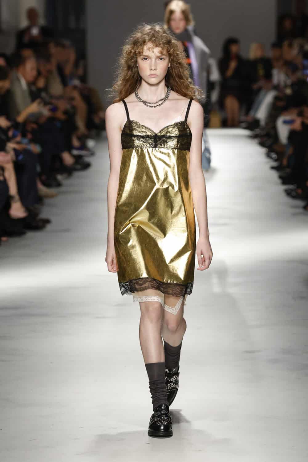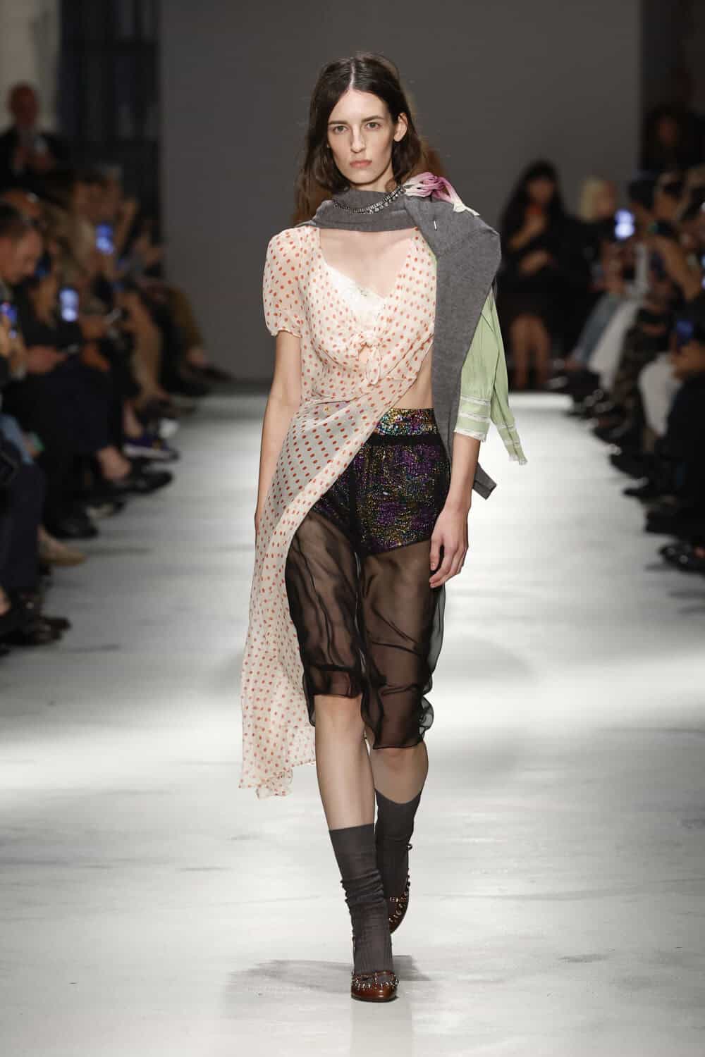 Models appeared as if they’d thrown their clothes on in a hurry, emphasised by their bedhead hair. A sheer polka-dot dress with a slit reaching under the arm exposed a 1920s-esque embroidered lace bra. Multi-coloured brocade shorts were visible under a black sheer chiffon pencil skirt and jumpers with wilted flowers pinned onto the shoulder were tied around models’ necks.