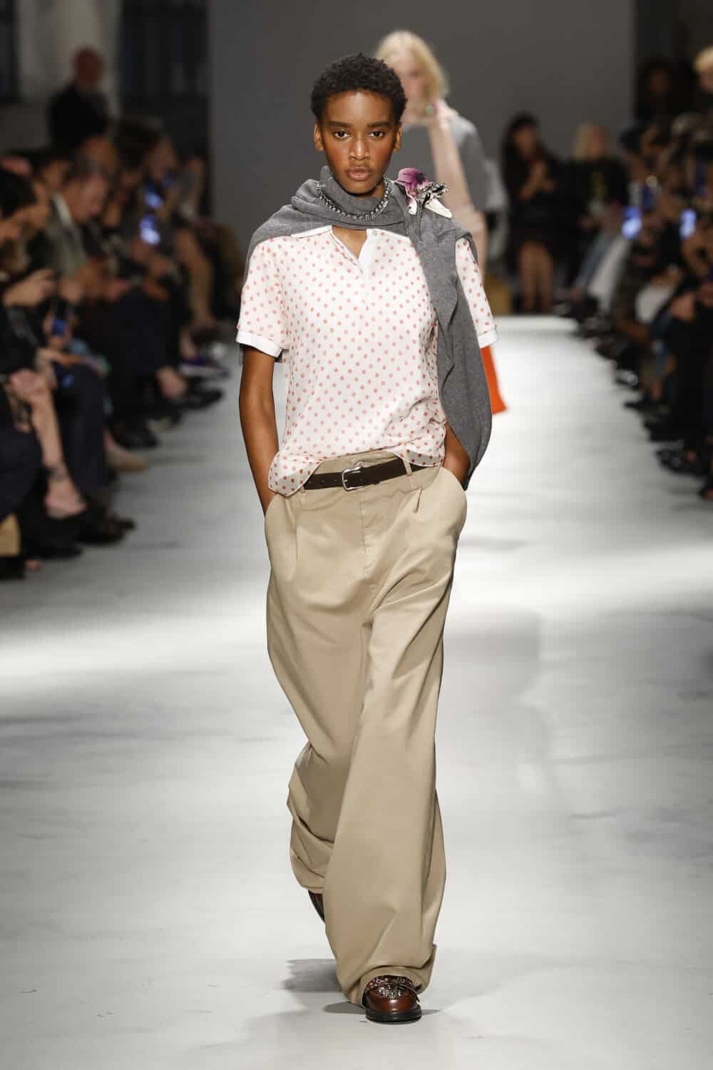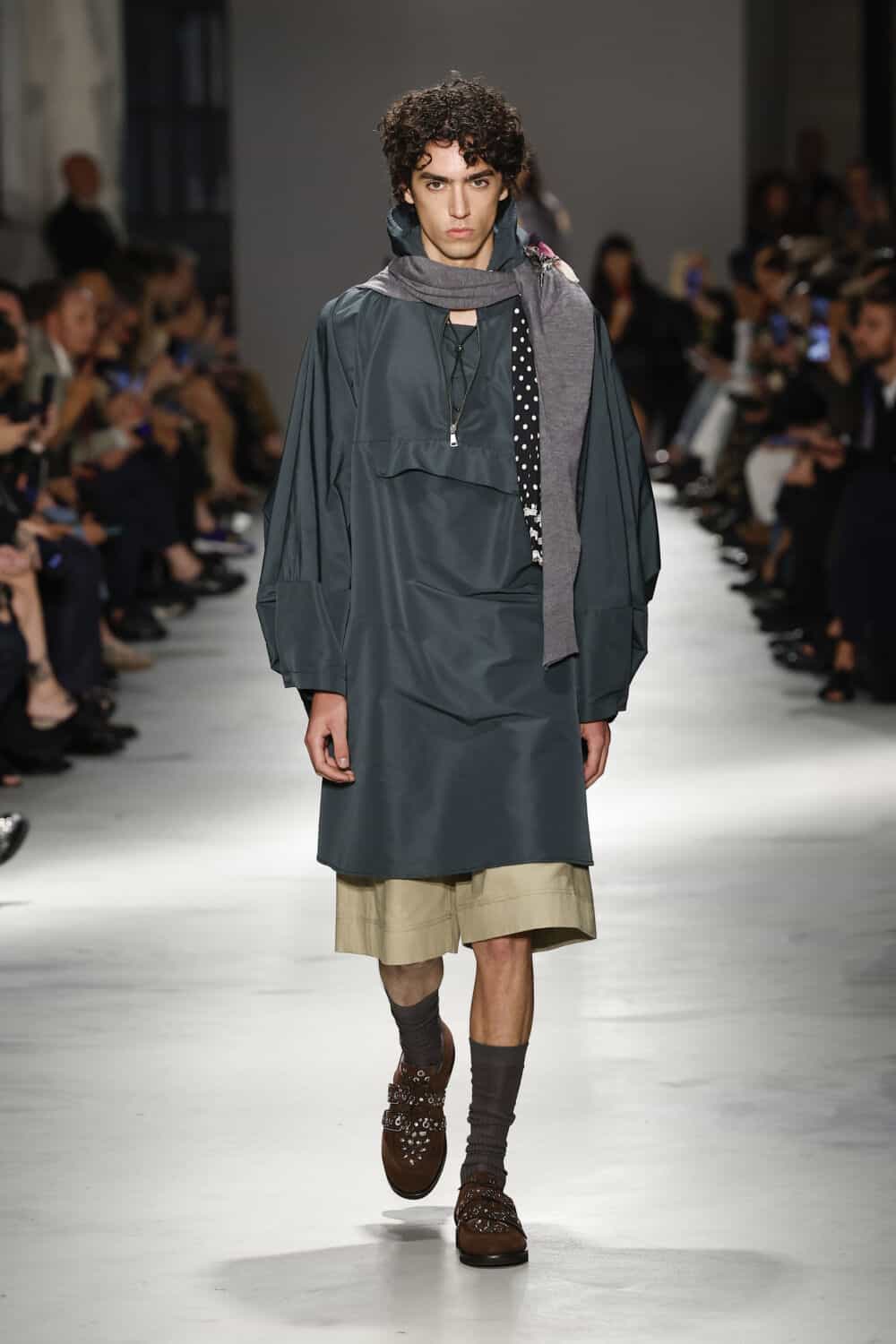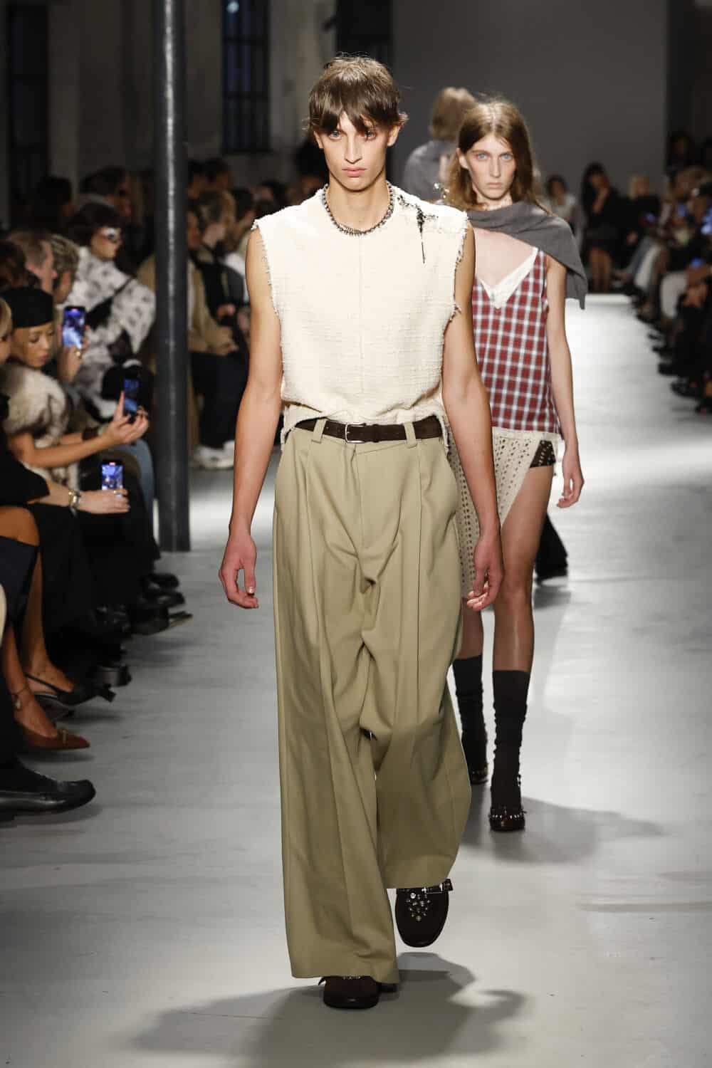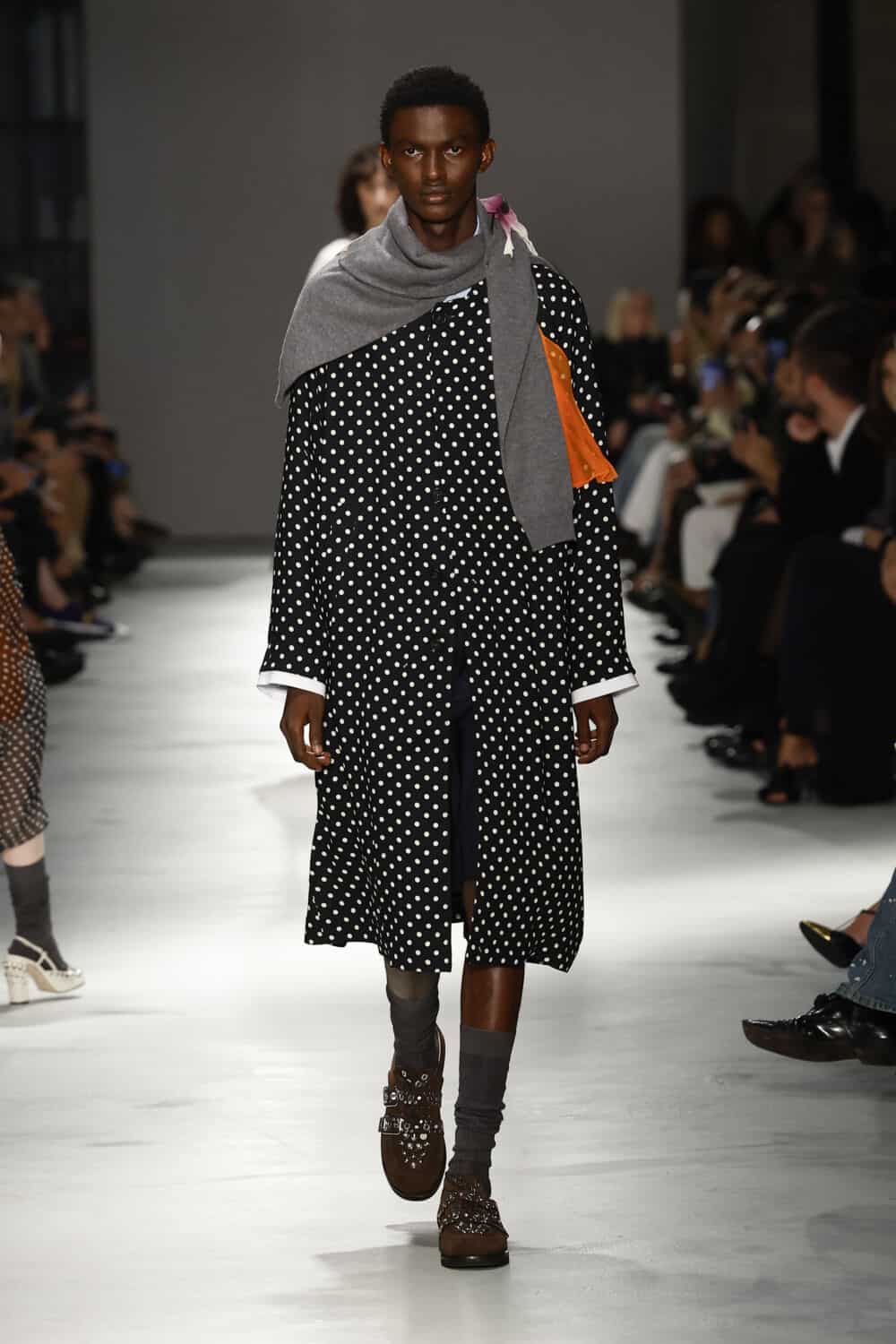 Since founding the brand in 2010, Dell’Acqua has frequently designed collections that combine conflicting shapes and silhouettes, creating an elegant and contemporary blend of feminine and masculine energies. This season, Dell’Acqua peppered parts of his menswear collection throughout, merging his collections in a vibrant display of patterns and textures.