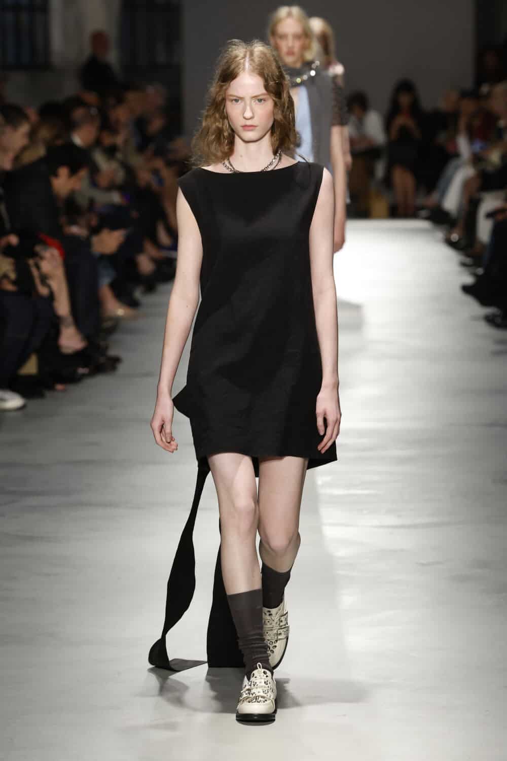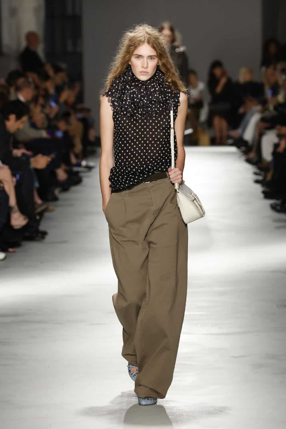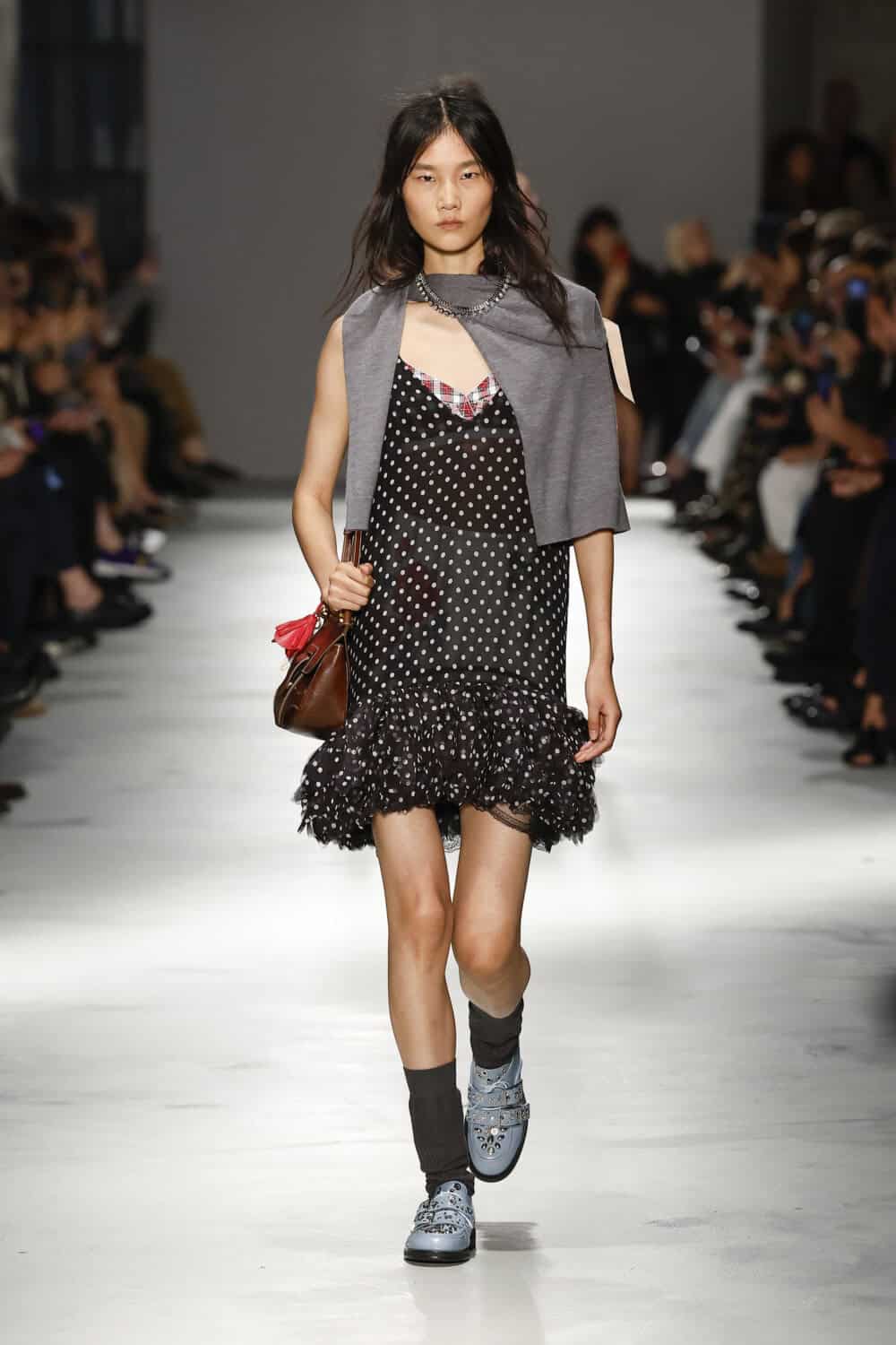 Amidst the light and airy chiffon garments, appearances were misleading. Chiffon petals rippled through the air, resembling plumes of feathers, the red stiff plissé-pleated duchesse skirt surprisingly moved in tune with the body and a dotted T-shirt featured cut-out holes instead of printed designs. Looks were coupled with studded and charm-adorned Cabiria Bags in pony skin and canvas, while footwear included double-buckle derby shoes and rounded toe slingbacks.