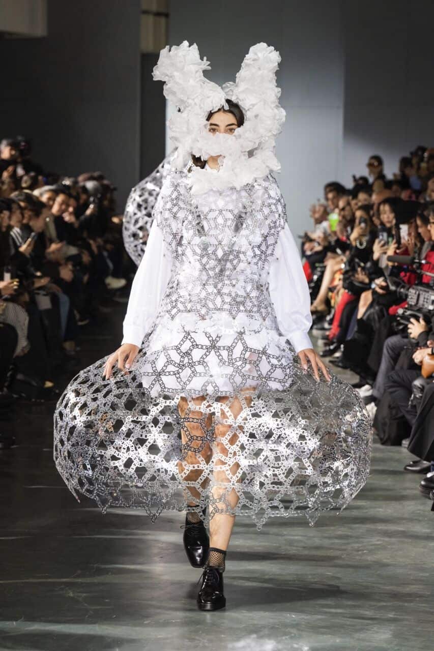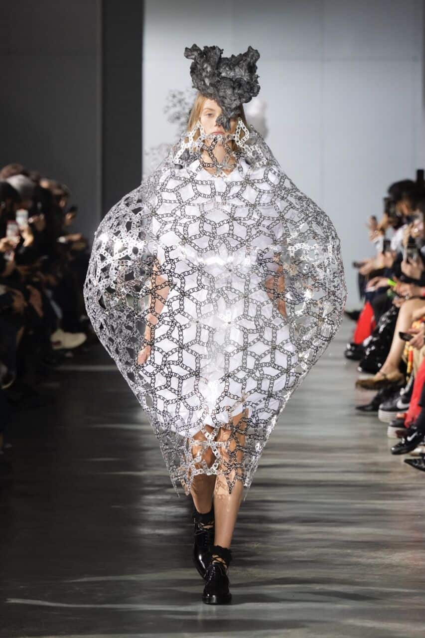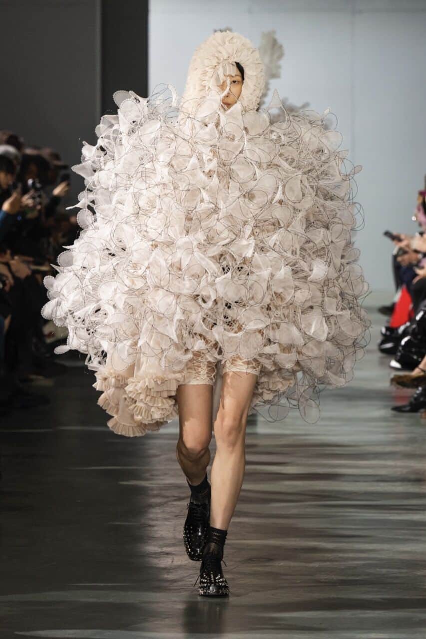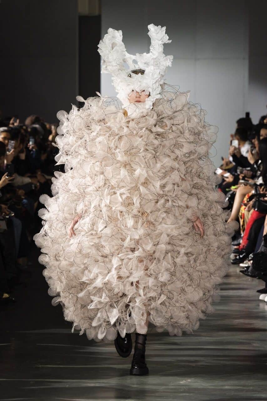 From there the show unfolded to include dresses with protrusions that ended in delicate stars. Part fantastical creature, part marine-life inspired, it turns out these observances weren’t too far-fetched of an assumption: Serving as the soundtrack to the show was a poem read by Aoyagi Natsumi which included a listing sealife. After all, what is the one animal with a similar shape but a starfish? As the tentacle-like creations  bobbed with every step, you could easily imagine a young child dreaming up humans who merged with aquatic beings on paper and finding these sketches brought into reality. Perhaps the looks that most embodied joy and naivete came later, as the three-dimensional pieces came to fill the runway. Resembling tinsel or sparkly pipecleaners, the geometrical designs were arts and crafts hour ratched up to 1000%, in the most luxurious and creative manner possible.