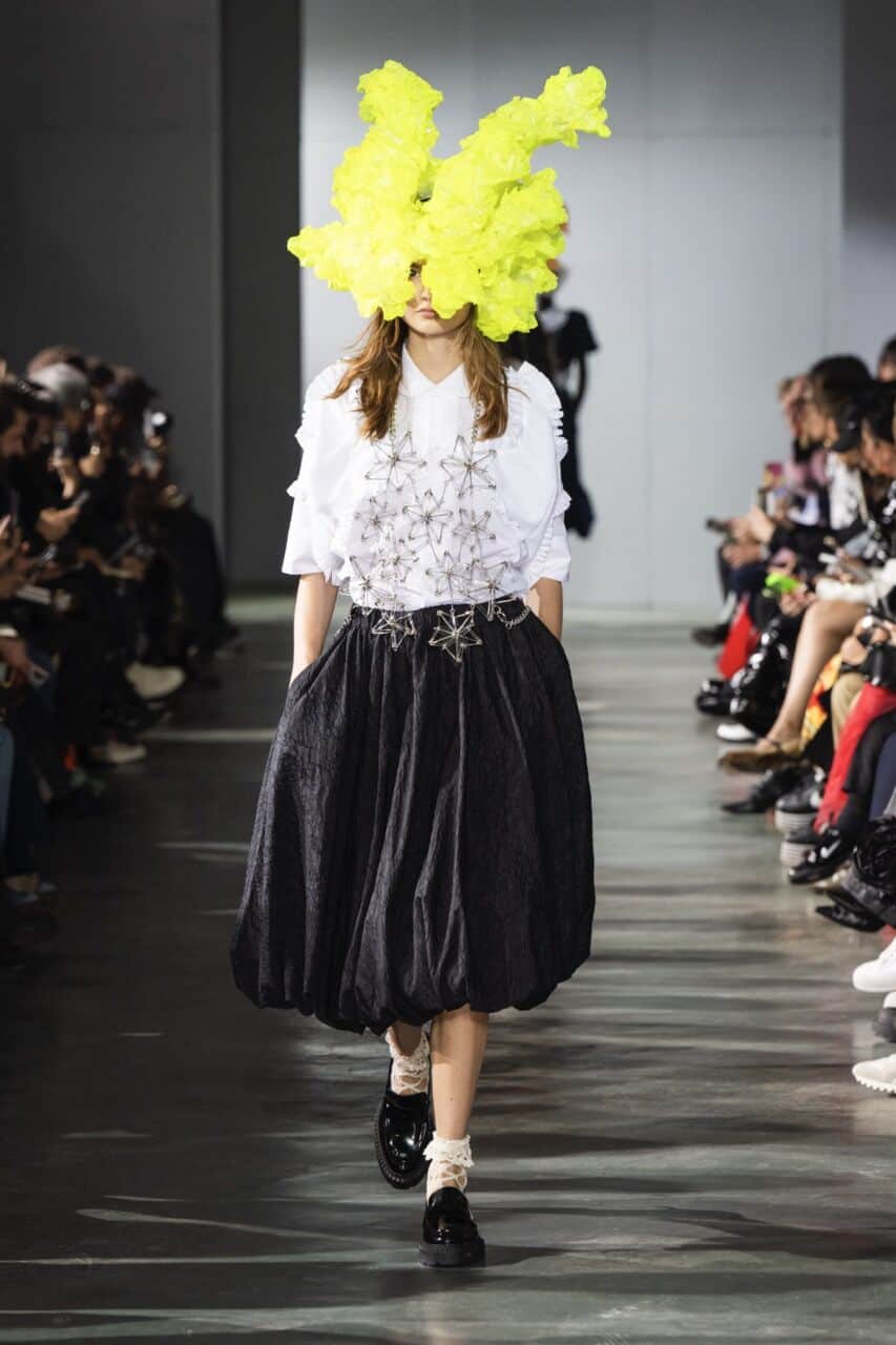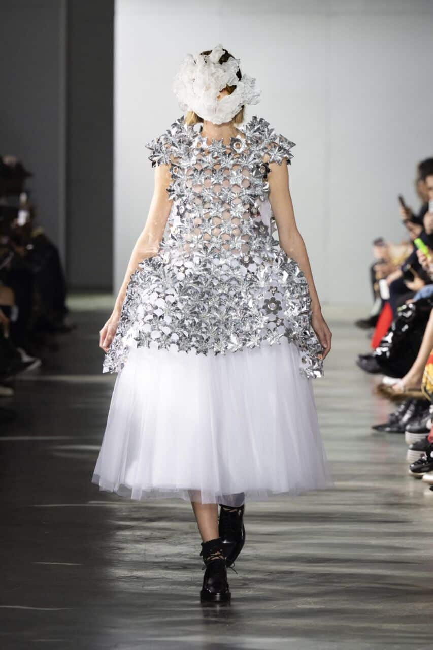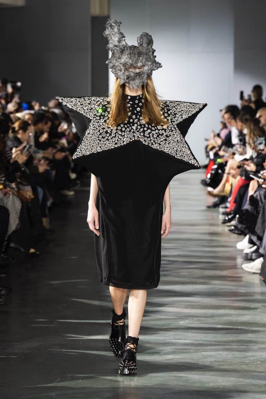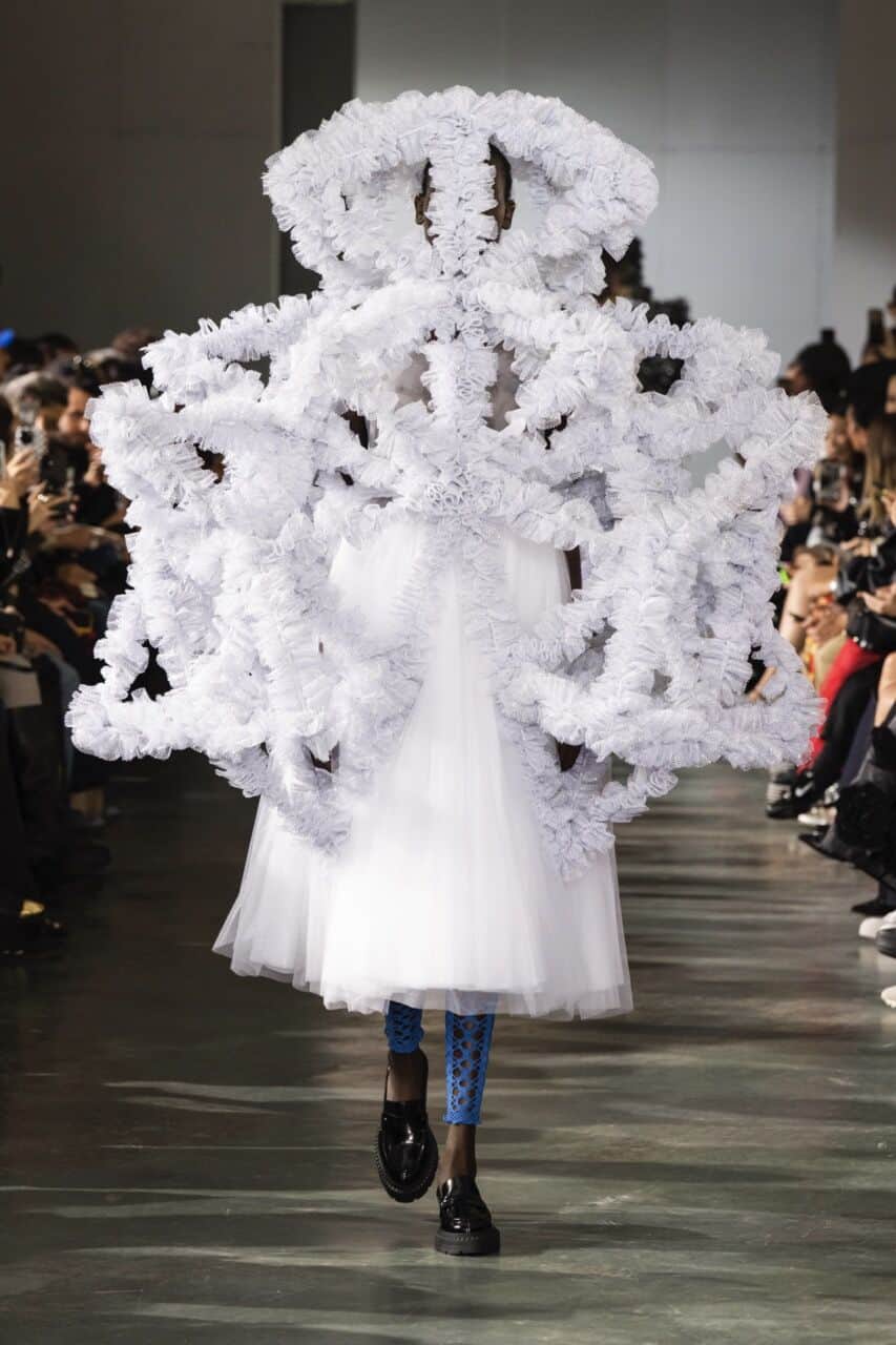 From there the show unfolded to include dresses with protrusions that ended in delicate stars. Part fantastical creature, part marine-life inspired, it turns out these observances weren’t too far-fetched of an assumption: Serving as the soundtrack to the show was a poem read by Aoyagi Natsumi which included a listing sealife. After all, what is the one animal with a similar shape but a starfish? As the tentacle-like creations  bobbed with every step, you could easily imagine a young child dreaming up humans who merged with aquatic beings on paper and finding these sketches brought into reality. Perhaps the looks that most embodied joy and naivete came later, as the three-dimensional pieces came to fill the runway. Resembling tinsel or sparkly pipecleaners, the geometrical designs were arts and crafts hour ratched up to 1000%, in the most luxurious and creative manner possible.