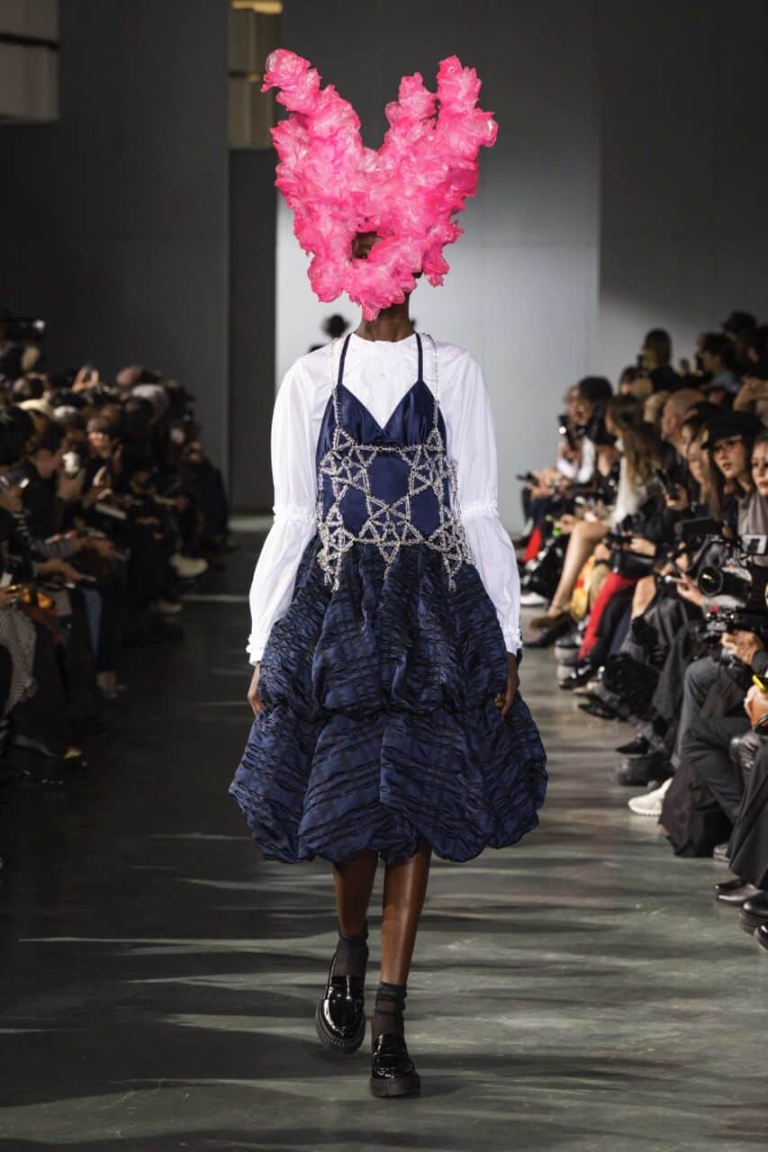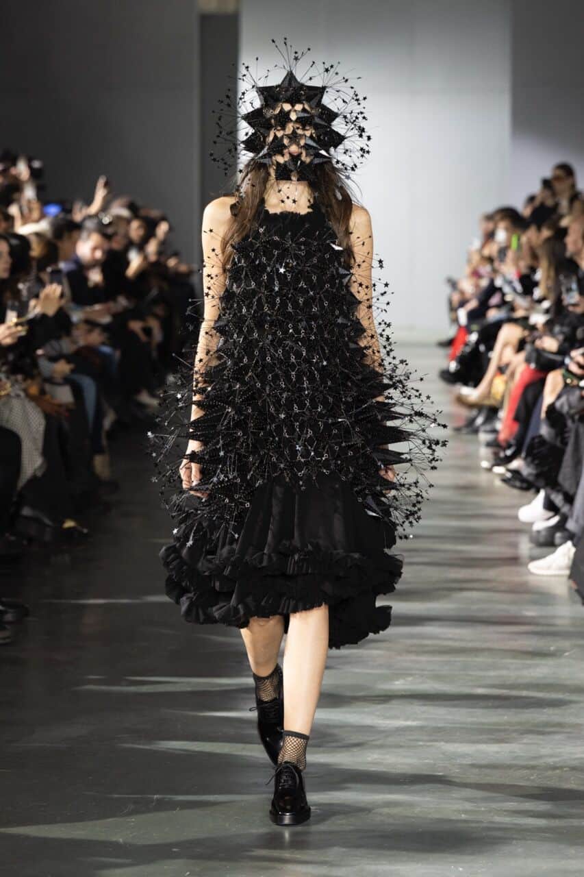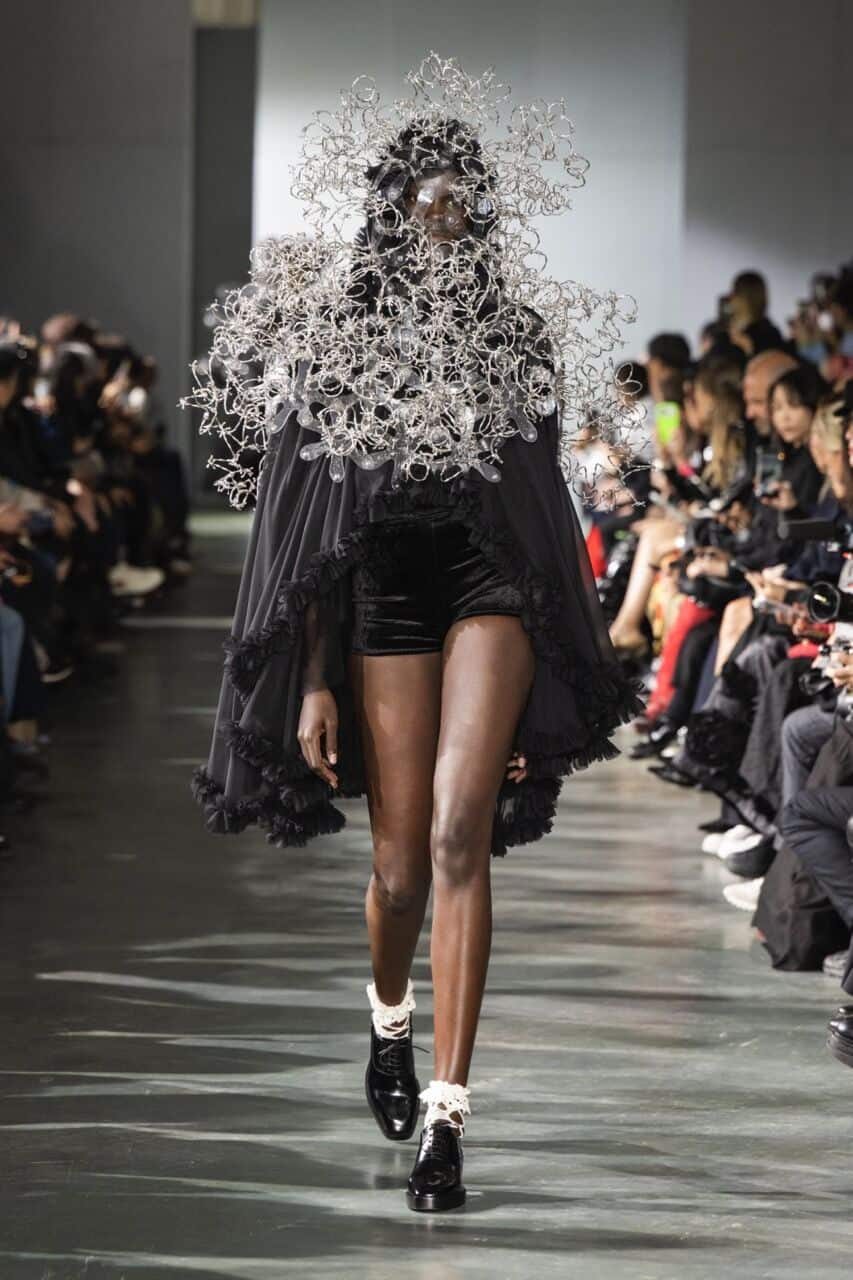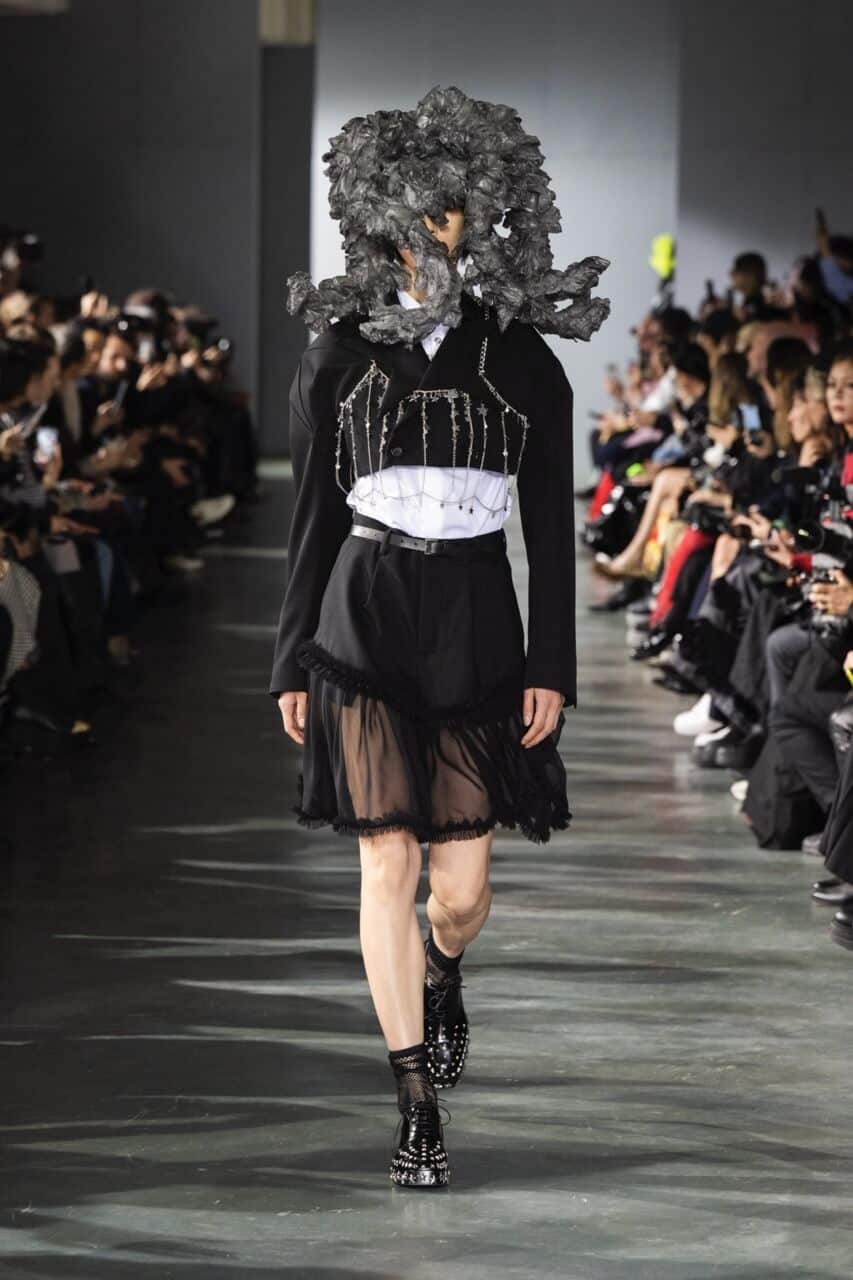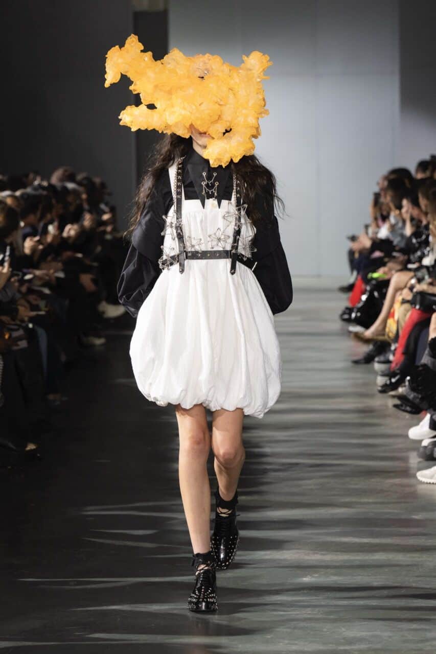 A few things are certain when attending a Noir Kei Ninomiya show: there will be harnesses, headdresses, and three dimensional looks that span the width of a runway. For spring 2026, the designer checked all these items off the list with ease, creating a starry-eyed collection that felt fit for dreamers. The designer told Vogue backstage via translator that this was the intention. “It was something very playful. Happiness. Like childhood, the first drawing. And it makes this idea of the collection.” The result was joyful indeed, opening with a spangly chest piece worn over a midi white tulle dress coupled with a matching mask by Shinji Konishi.