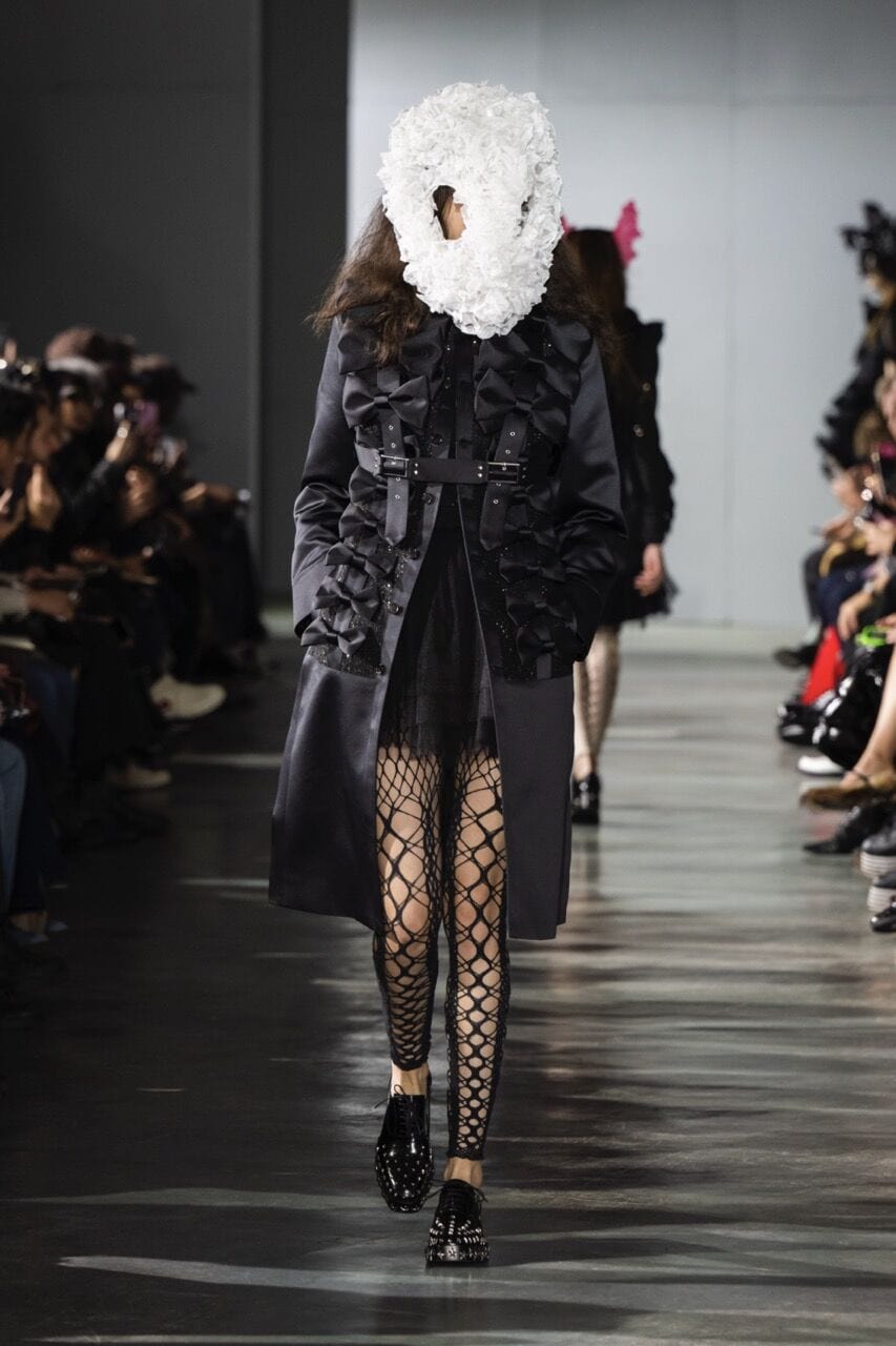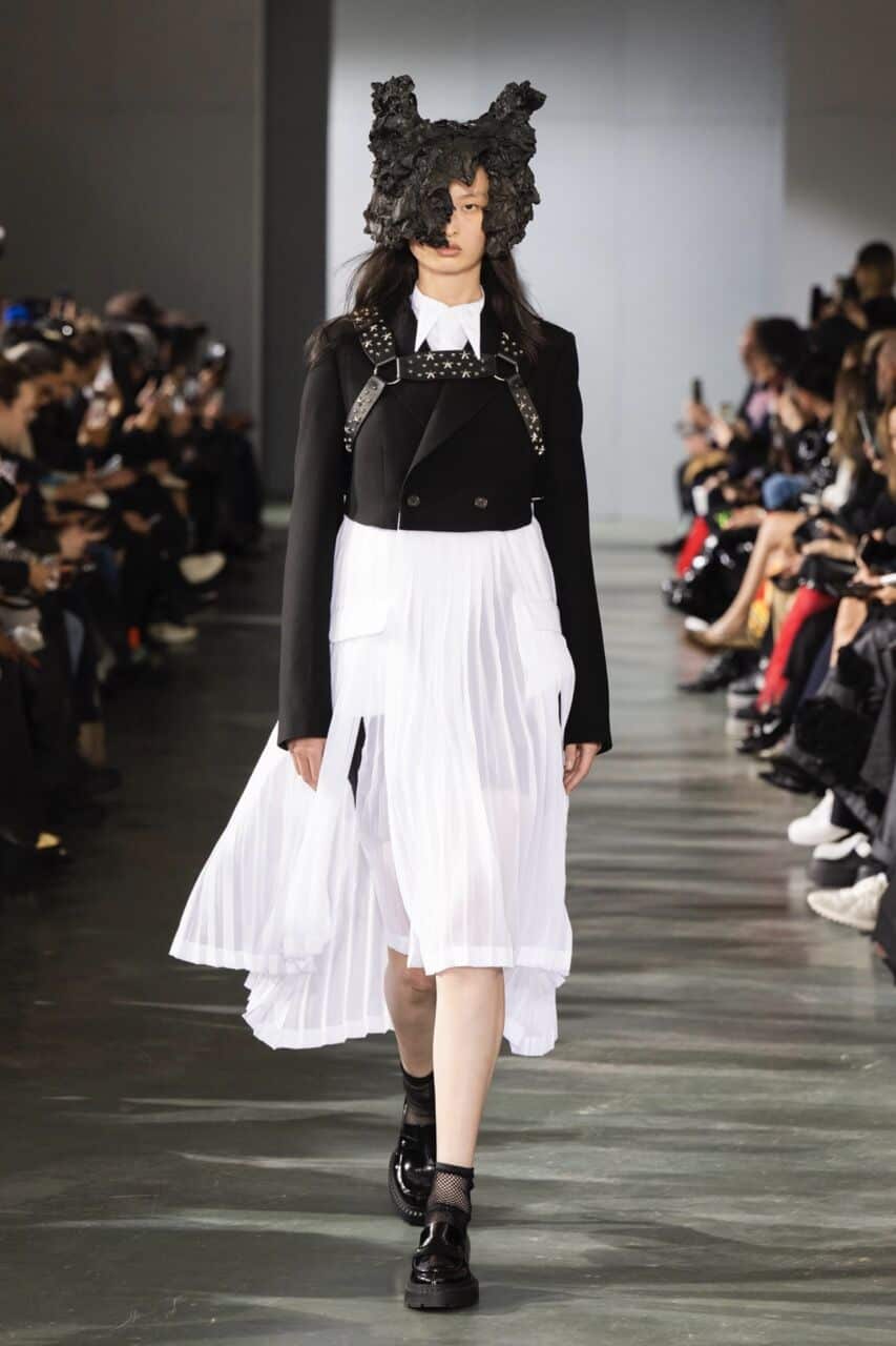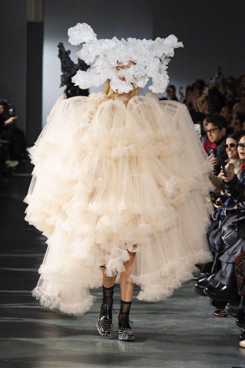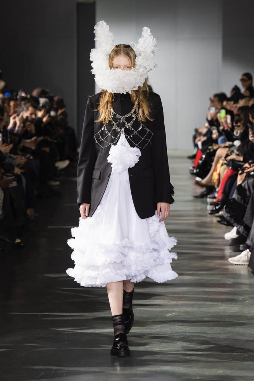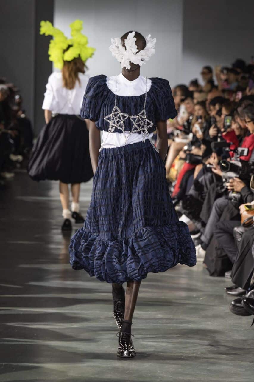 A few things are certain when attending a Noir Kei Ninomiya show: there will be harnesses, headdresses, and three dimensional looks that span the width of a runway. For spring 2026, the designer checked all these items off the list with ease, creating a starry-eyed collection that felt fit for dreamers. The designer told Vogue backstage via translator that this was the intention. “It was something very playful. Happiness. Like childhood, the first drawing. And it makes this idea of the collection.” The result was joyful indeed, opening with a spangly chest piece worn over a midi white tulle dress coupled with a matching mask by Shinji Konishi.