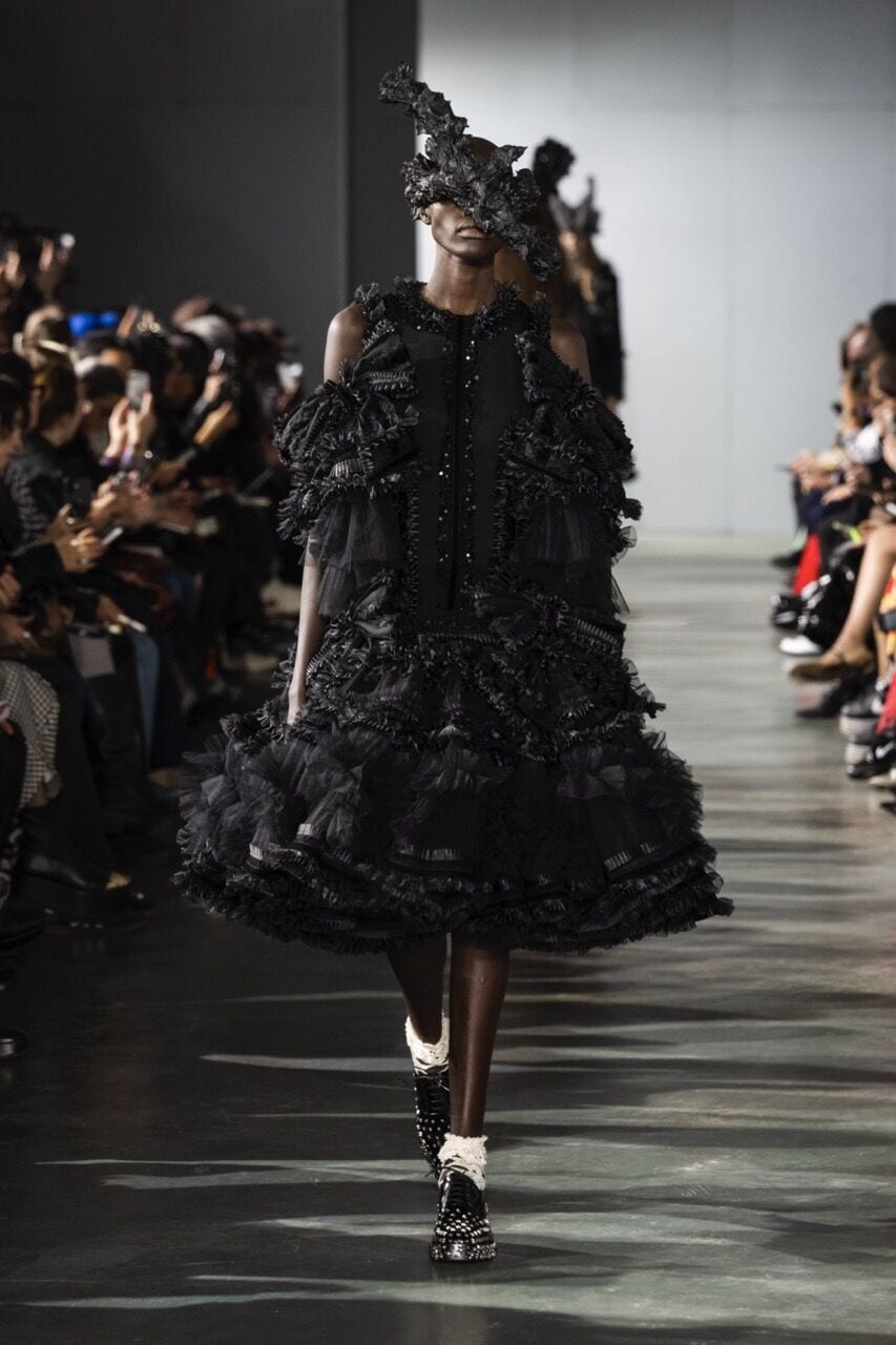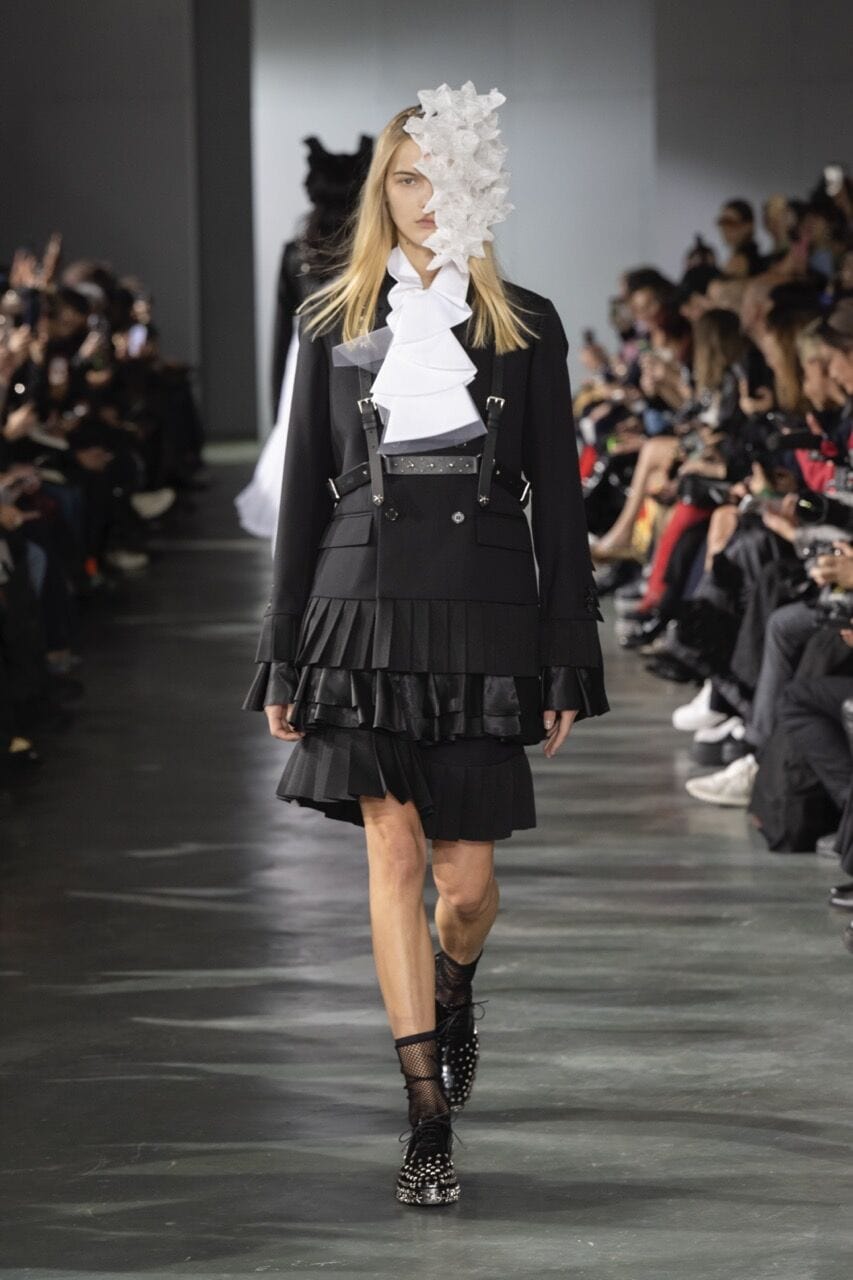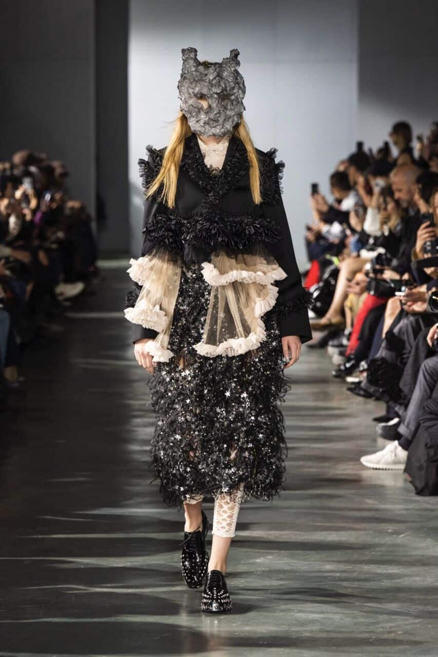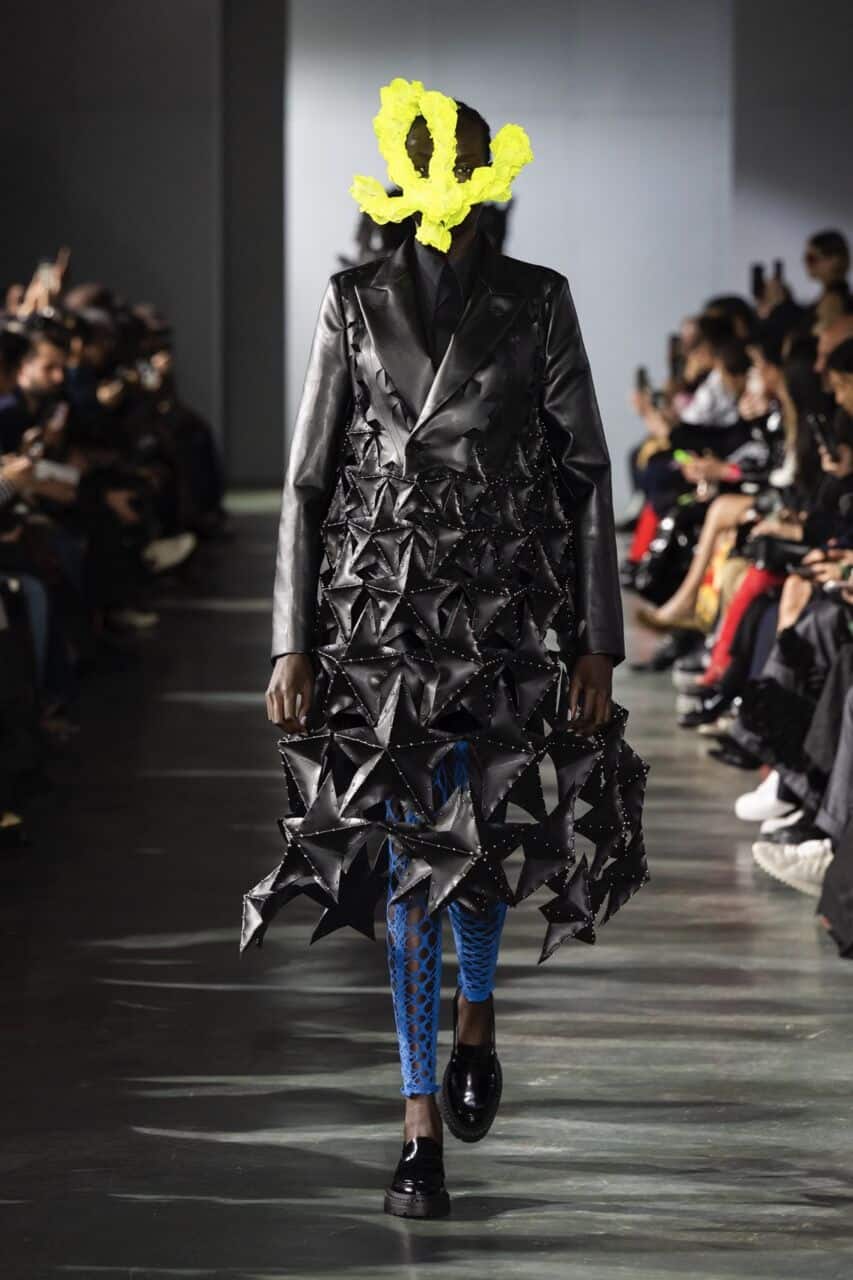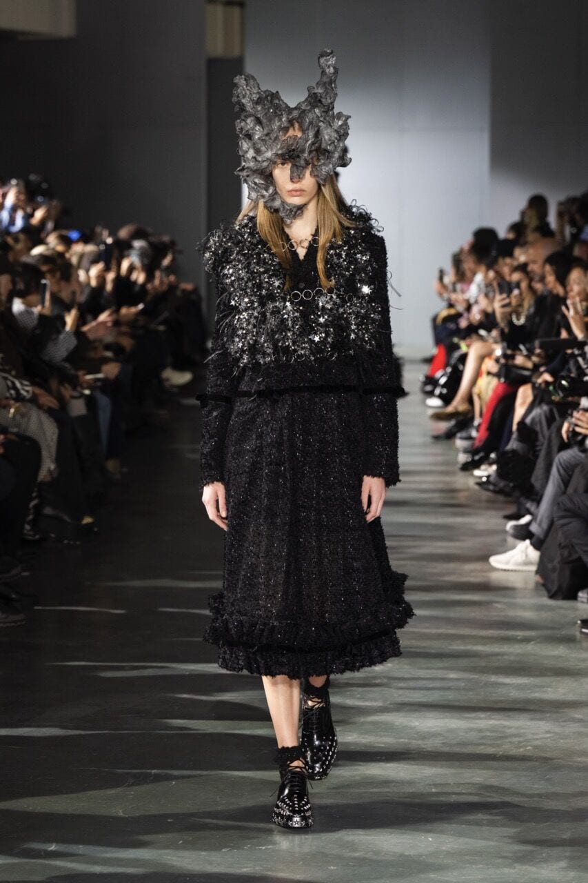 A few things are certain when attending a Noir Kei Ninomiya show: there will be harnesses, headdresses, and three dimensional looks that span the width of a runway. For spring 2026, the designer checked all these items off the list with ease, creating a starry-eyed collection that felt fit for dreamers. The designer told Vogue backstage via translator that this was the intention. “It was something very playful. Happiness. Like childhood, the first drawing. And it makes this idea of the collection.” The result was joyful indeed, opening with a spangly chest piece worn over a midi white tulle dress coupled with a matching mask by Shinji Konishi.