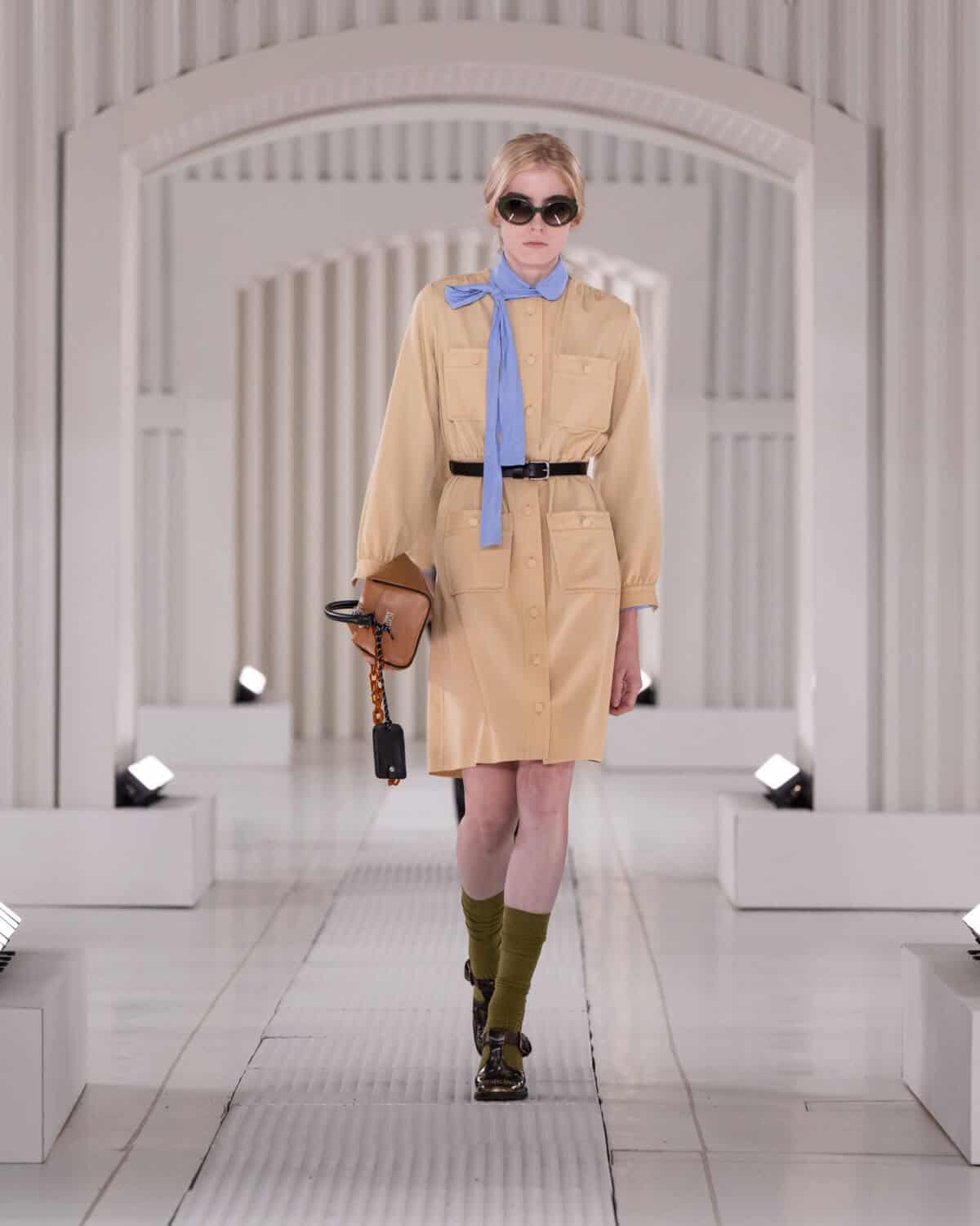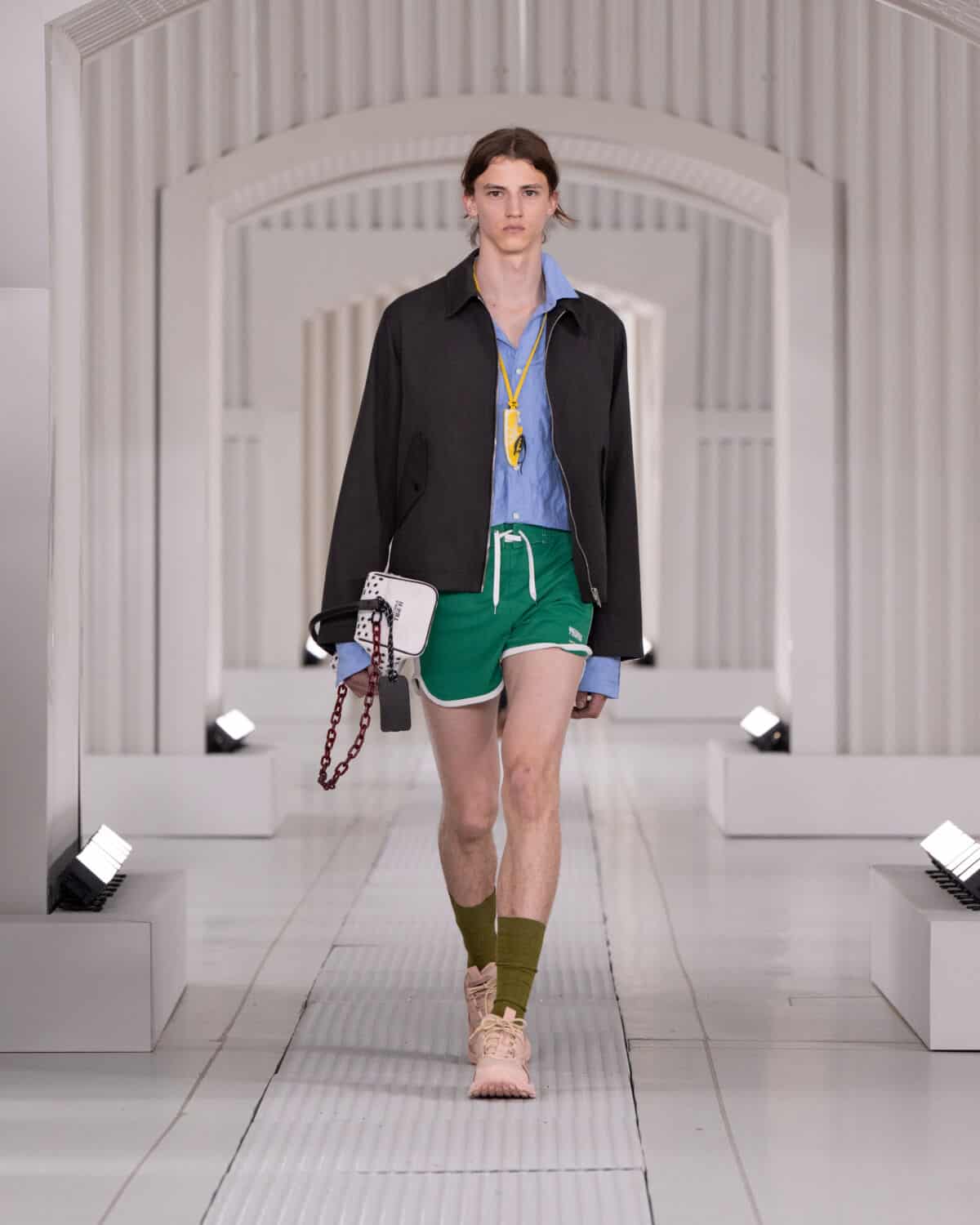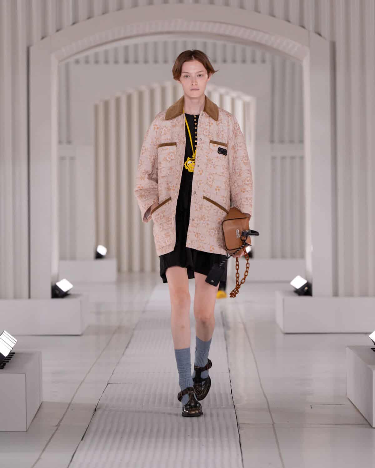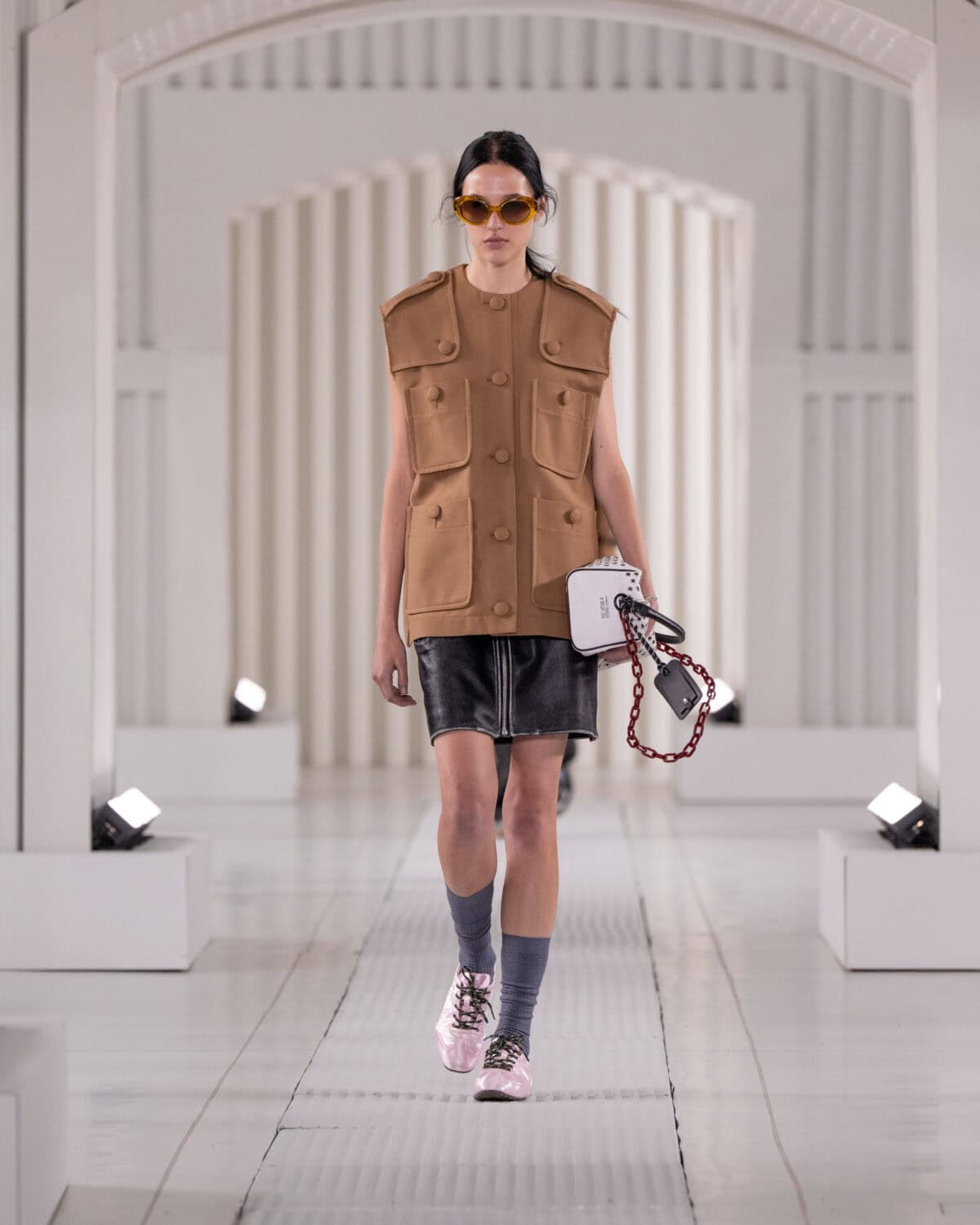 Accessories played up the playful mood. Bug-eye sunnies, graphic bags strung with charms and tiger necklaces balanced the demure palette of beige, khaki, grass green and plum with a cheeky attitude. Rare golden pearl jewellery was created in collaboration with Japanese brand Mikimoto. Footwear pushed contrasts even further, from Kaber mules and shimmering satin ballet-style trainers that reinterpreted the Mexico 66 sneaker to buckle heels riffing on the Mary Jane. A pair of leather moto jacket-and-skirt sets – one styled for men, one for women – stood out as the clearest nod to genderless dressing, though nearly every look carried a sense of fluidity.