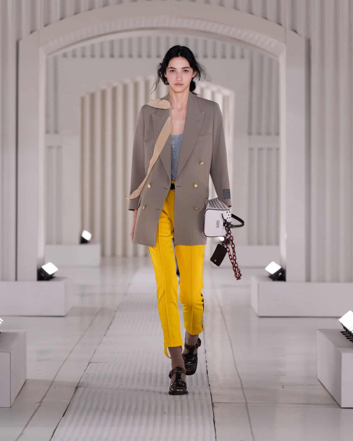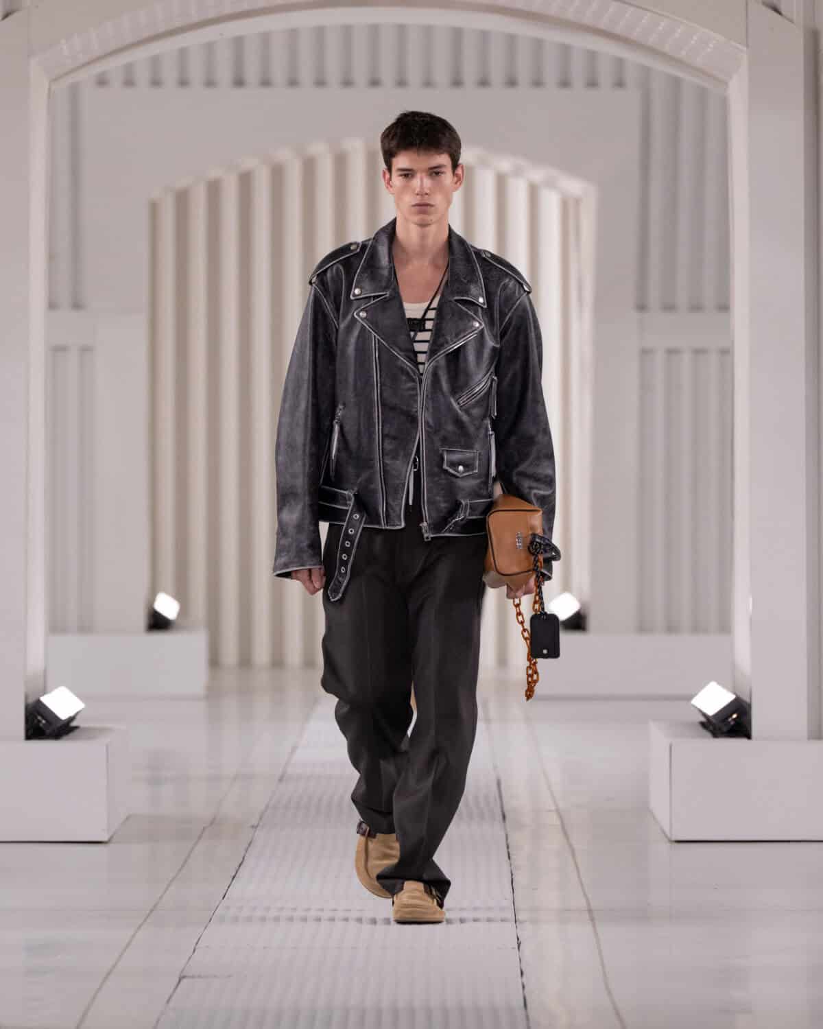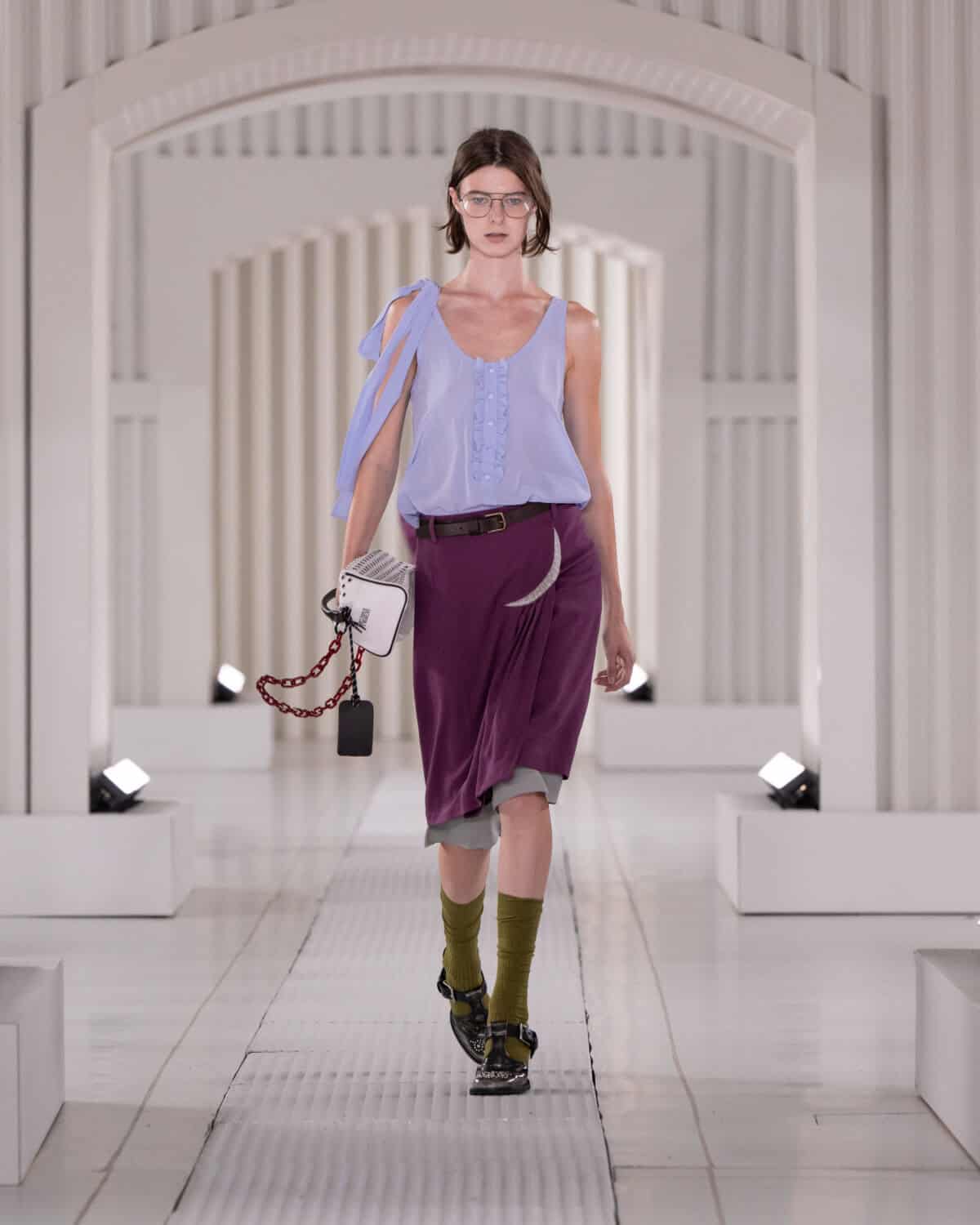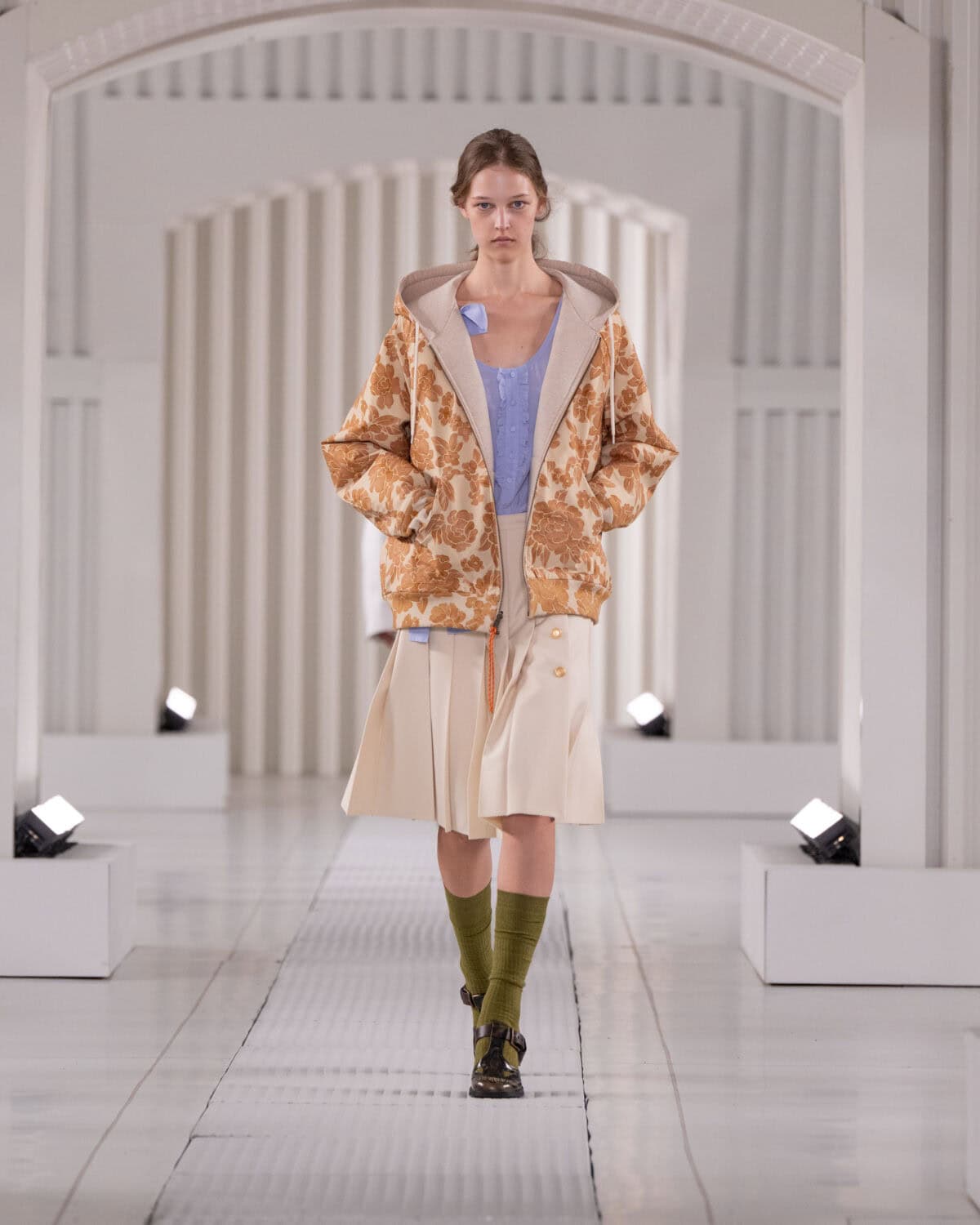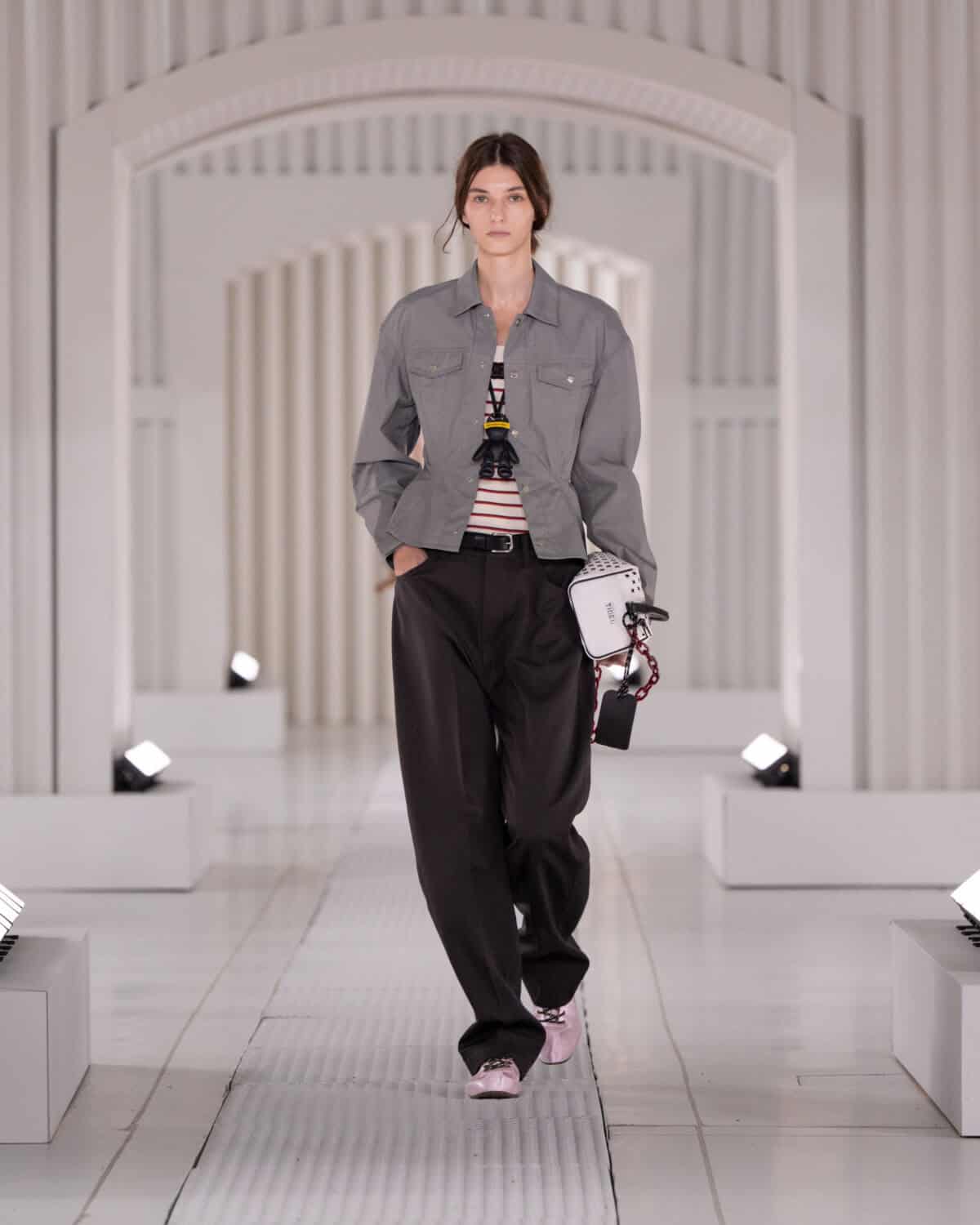 Accessories played up the playful mood. Bug-eye sunnies, graphic bags strung with charms and tiger necklaces balanced the demure palette of beige, khaki, grass green and plum with a cheeky attitude. Rare golden pearl jewellery was created in collaboration with Japanese brand Mikimoto. Footwear pushed contrasts even further, from Kaber mules and shimmering satin ballet-style trainers that reinterpreted the Mexico 66 sneaker to buckle heels riffing on the Mary Jane. A pair of leather moto jacket-and-skirt sets – one styled for men, one for women – stood out as the clearest nod to genderless dressing, though nearly every look carried a sense of fluidity.