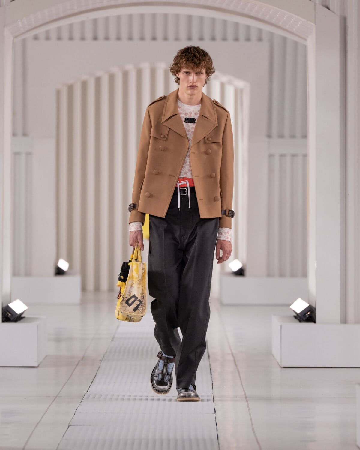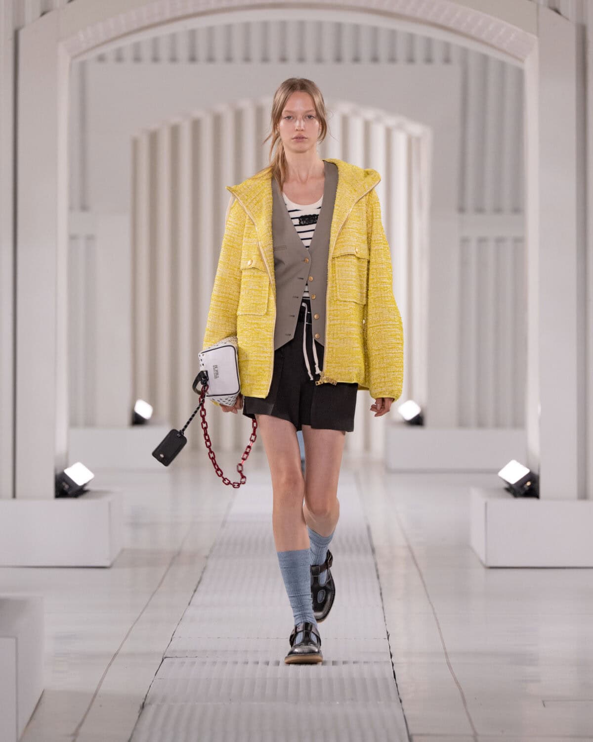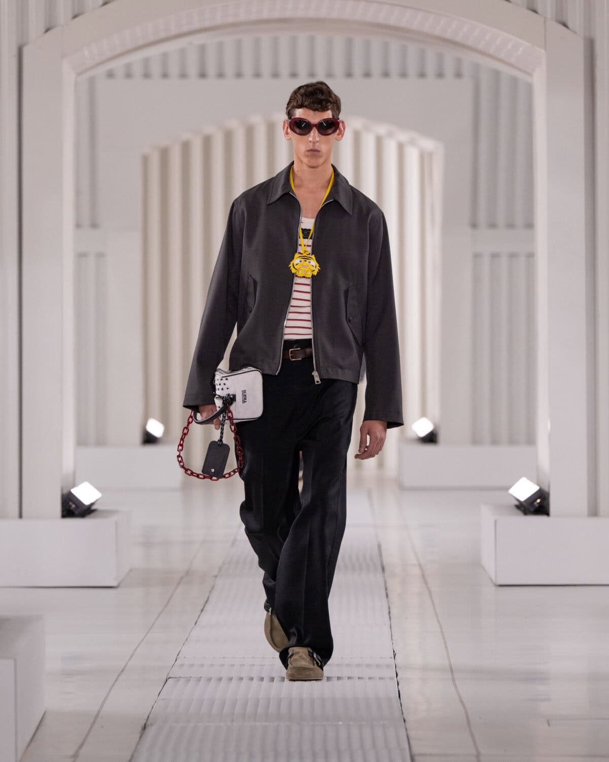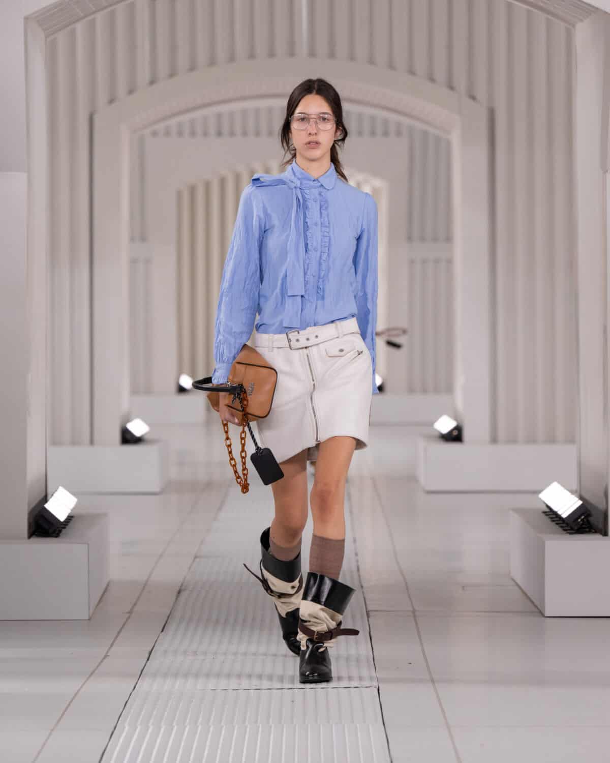 Accessories played up the playful mood. Bug-eye sunnies, graphic bags strung with charms and tiger necklaces balanced the demure palette of beige, khaki, grass green and plum with a cheeky attitude. Rare golden pearl jewellery was created in collaboration with Japanese brand Mikimoto. Footwear pushed contrasts even further, from Kaber mules and shimmering satin ballet-style trainers that reinterpreted the Mexico 66 sneaker to buckle heels riffing on the Mary Jane. A pair of leather moto jacket-and-skirt sets – one styled for men, one for women – stood out as the clearest nod to genderless dressing, though nearly every look carried a sense of fluidity.