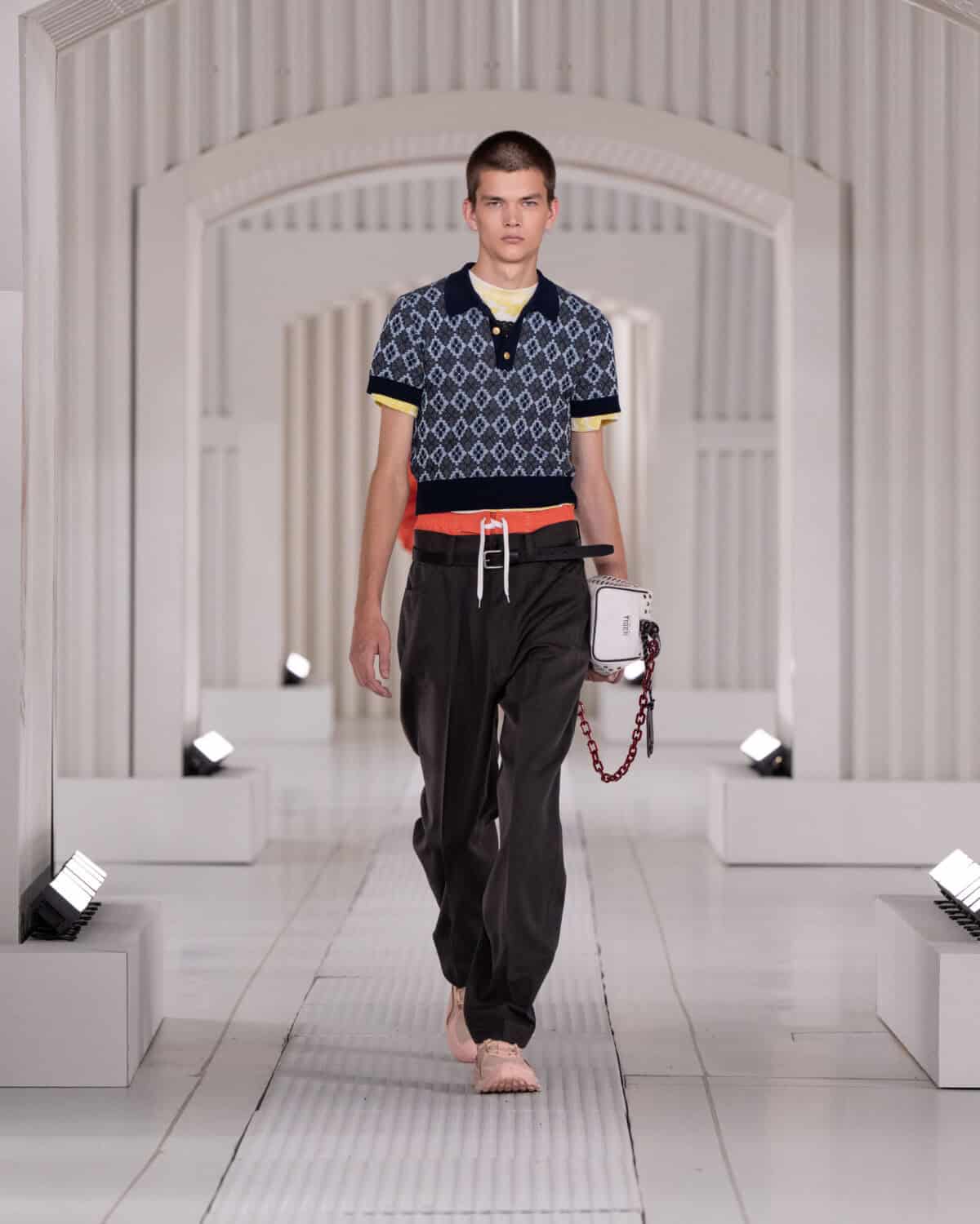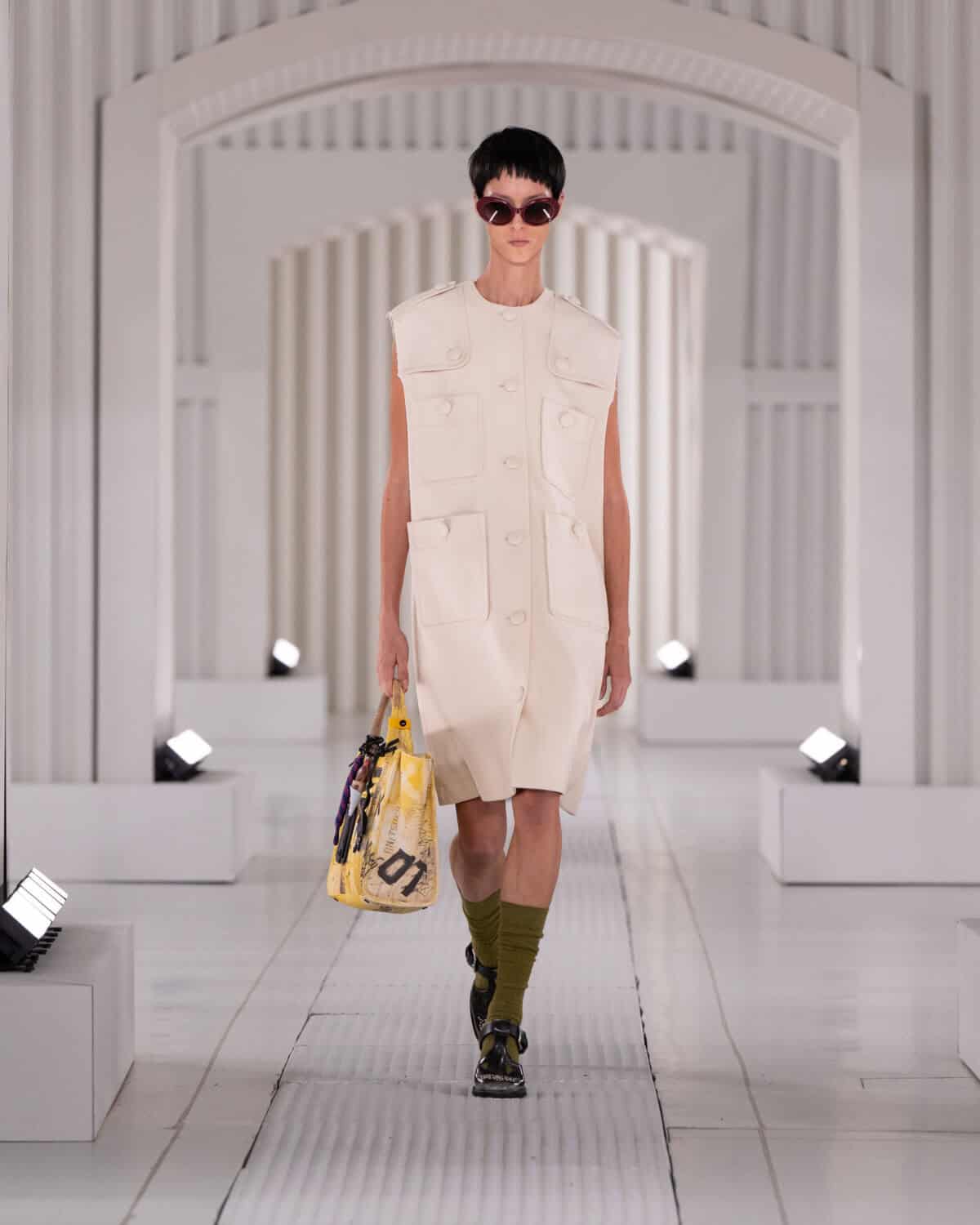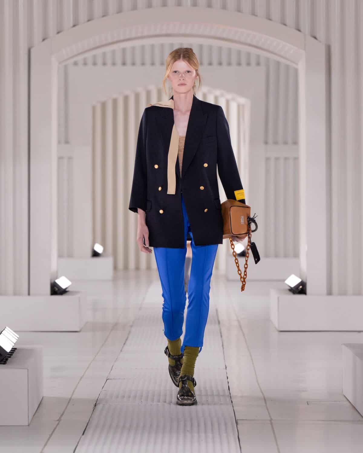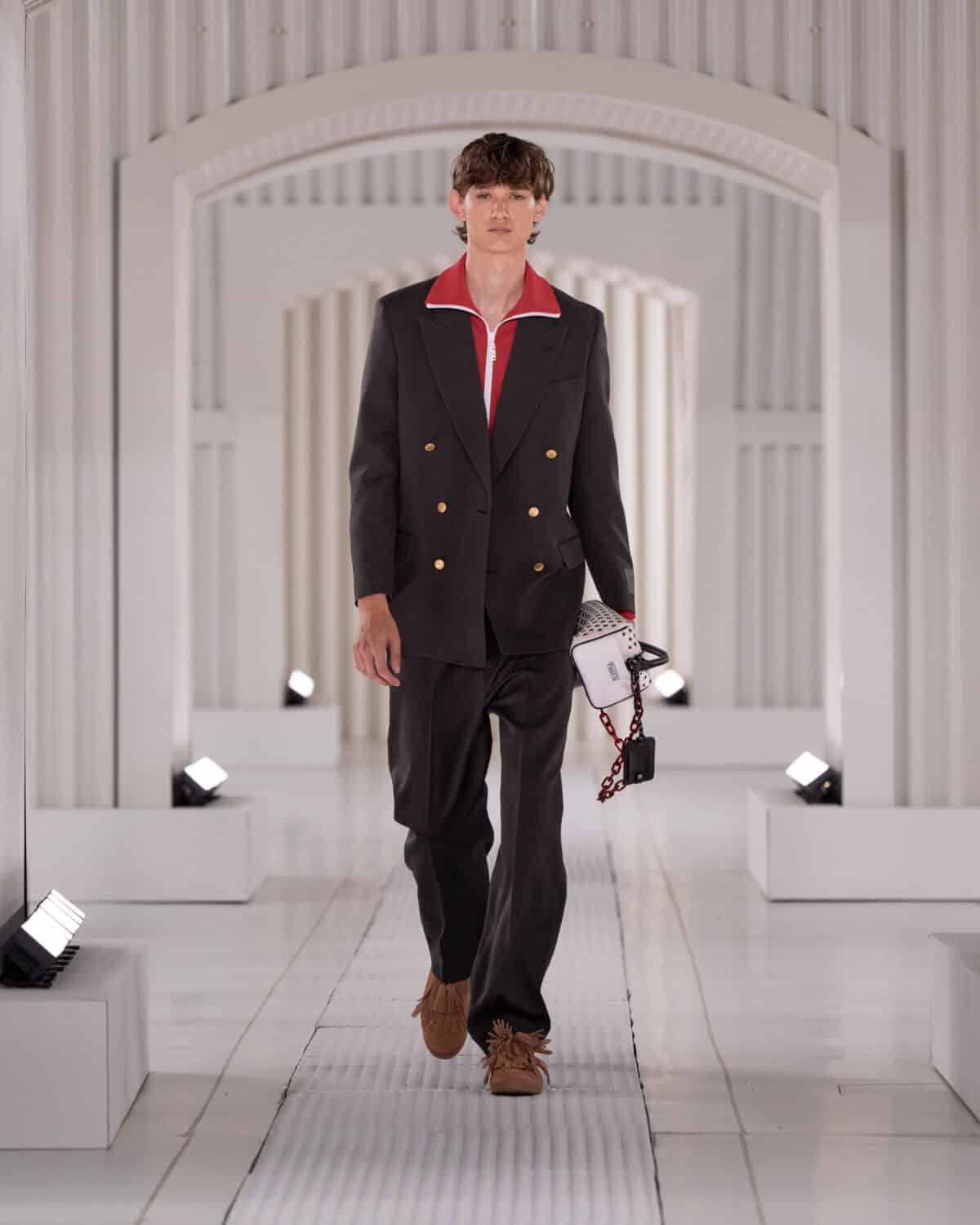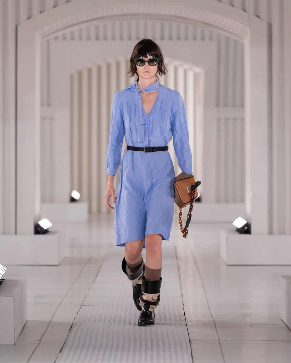 Accessories played up the playful mood. Bug-eye sunnies, graphic bags strung with charms and tiger necklaces balanced the demure palette of beige, khaki, grass green and plum with a cheeky attitude. Rare golden pearl jewellery was created in collaboration with Japanese brand Mikimoto. Footwear pushed contrasts even further, from Kaber mules and shimmering satin ballet-style trainers that reinterpreted the Mexico 66 sneaker to buckle heels riffing on the Mary Jane. A pair of leather moto jacket-and-skirt sets – one styled for men, one for women – stood out as the clearest nod to genderless dressing, though nearly every look carried a sense of fluidity.