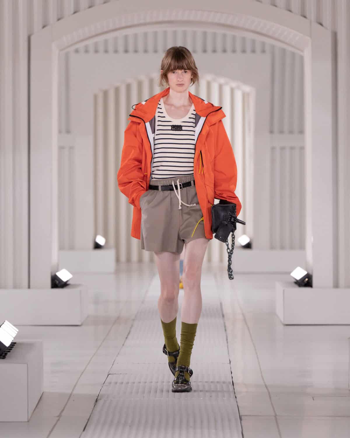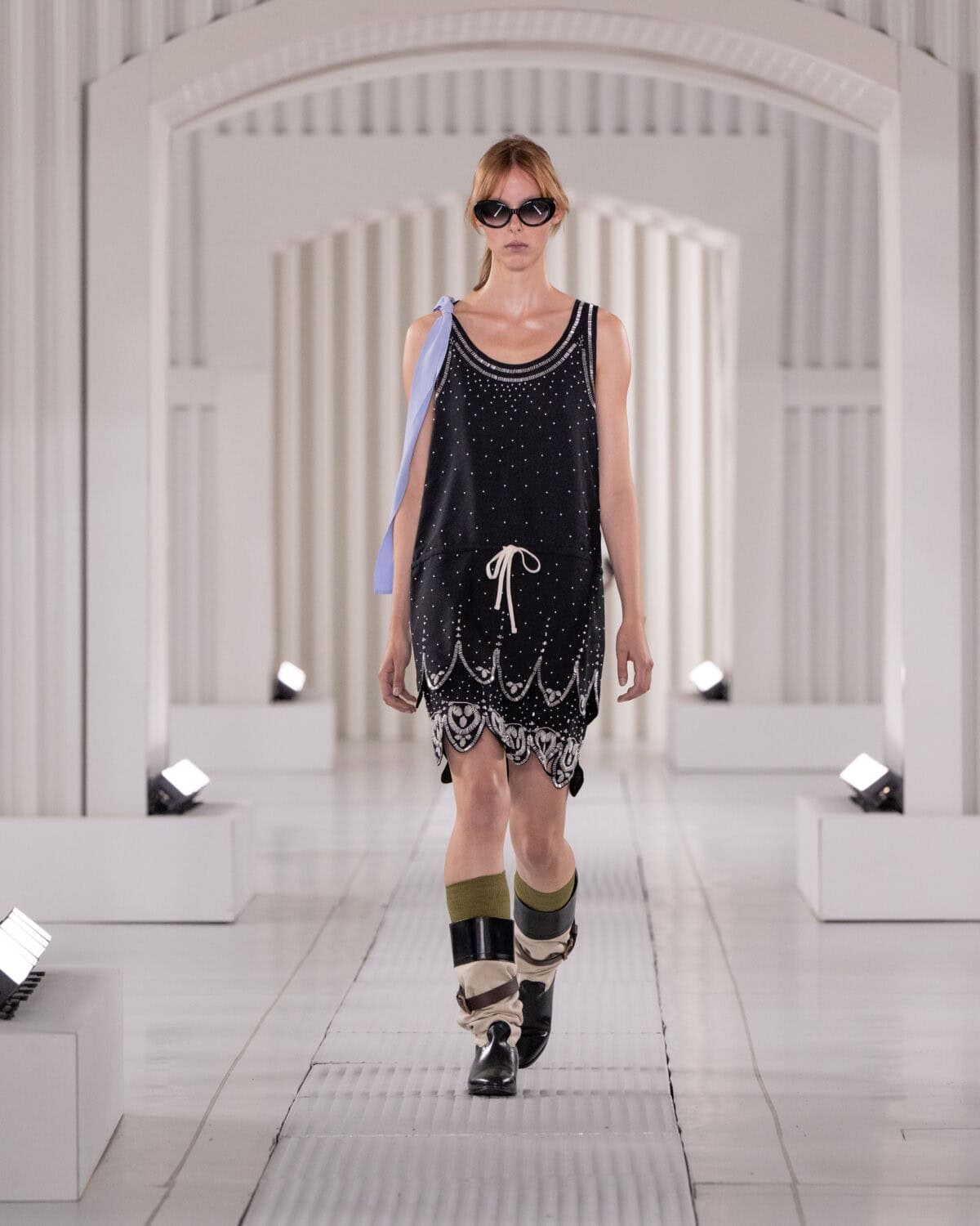 The Onitsuka Tiger SS26 show delivered a confident mash-up of nostalgia and experimentation, transforming familiar school-day codes into something distinctly modern. The collection opened with a back-to-school spirit – pleated skirts, striped tops and skinny scarves – before swiftly spiraling into a collage of flapper sparkle and track-ready ease. Tailoring collided with athleisure: trench coats layered over gym shorts, cargo pockets reimagined across structured frocks and slim stirrup track pants tucked into slouchy boots. The theme was Urban Fantasy, and the execution was strong.