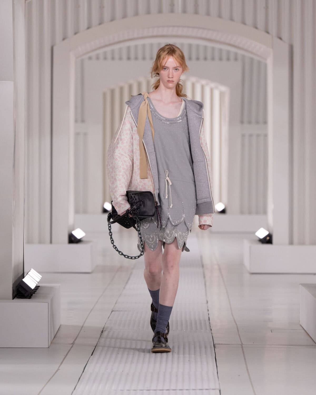 Flashes of bedazzled fringe and shimmering fabrics gave the collection its glamour, while oversized hoodies thrown over mini dresses and moccasin-like slip-ons grounded it in comfort. With its studded bags – the Tiger Tote and Karate –, sharp white zippers and relaxed-yet-elevated layering, Onitsuka Tiger’s SS26 show felt like a fresh reminder that style can be both disciplined and delightfully unruly.
