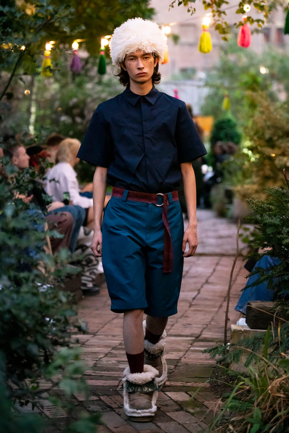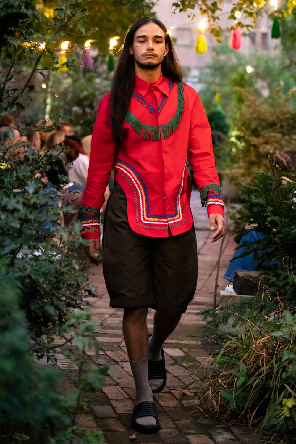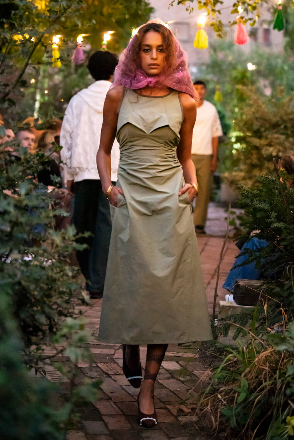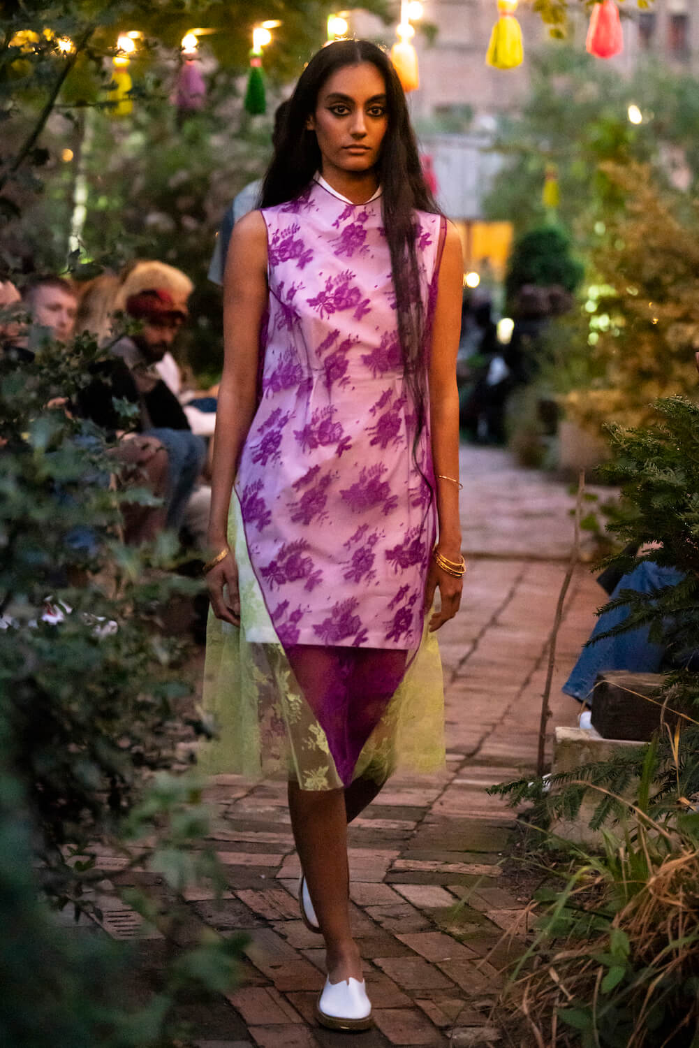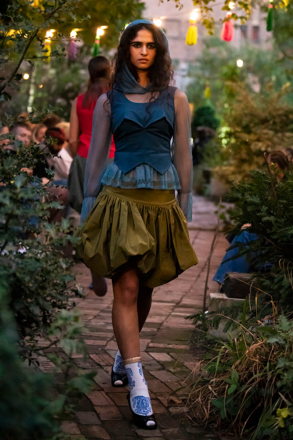 Today’s outing was a little closer to home. Staged in a community garden hidden just behind Tottenham Court Road, with neighbouring tenants watching from their balconies, Farzaneh dedicated her latest outing to Iranian nomad tribes. The country has one of the biggest nomadic populations in the world – around 1.2 million people. “Although facing many challenges of the modern world, nomadic tribes in Iran still refuse to give up their life on the go and settle down, as many have done before,” penned the designer in her show notes.