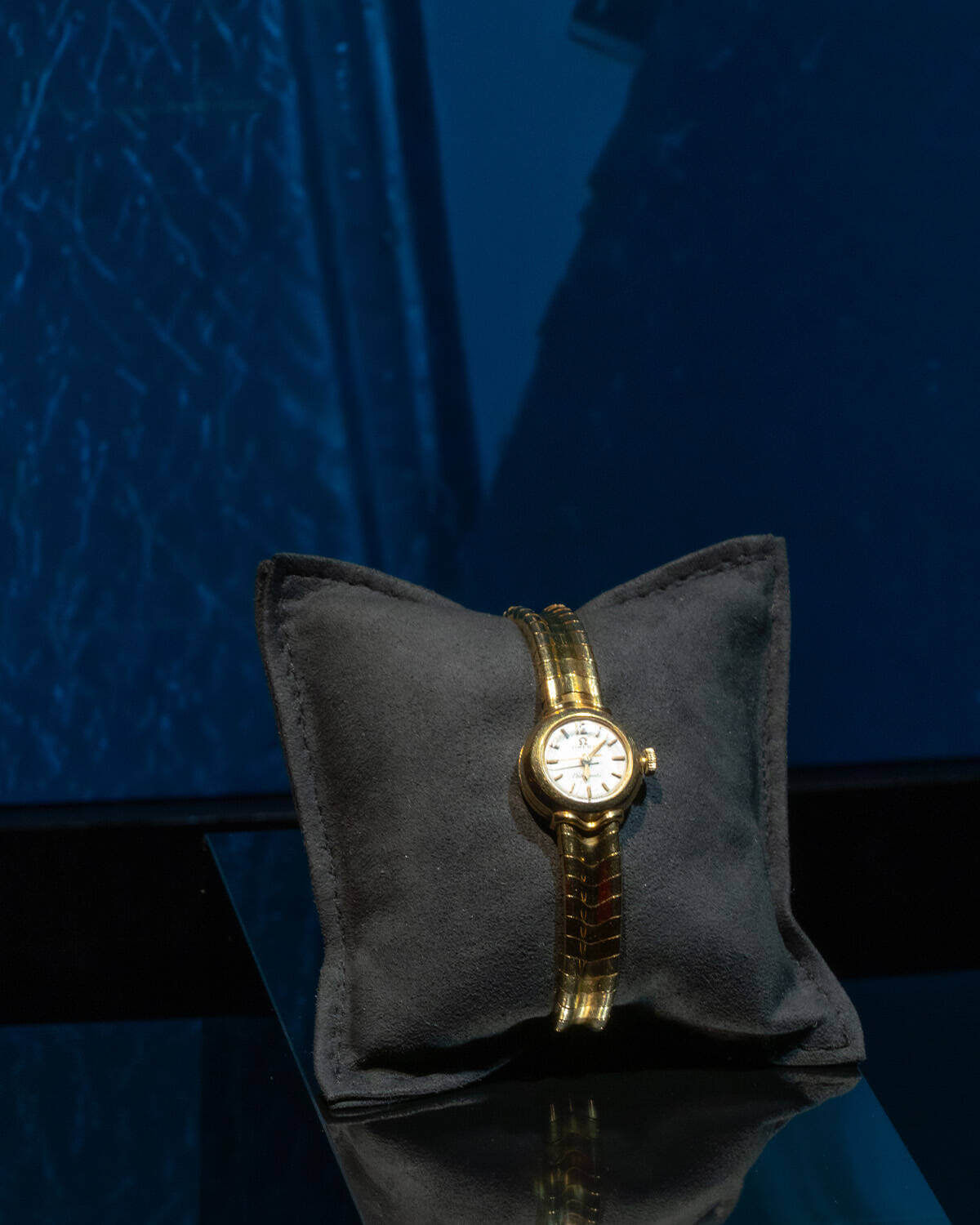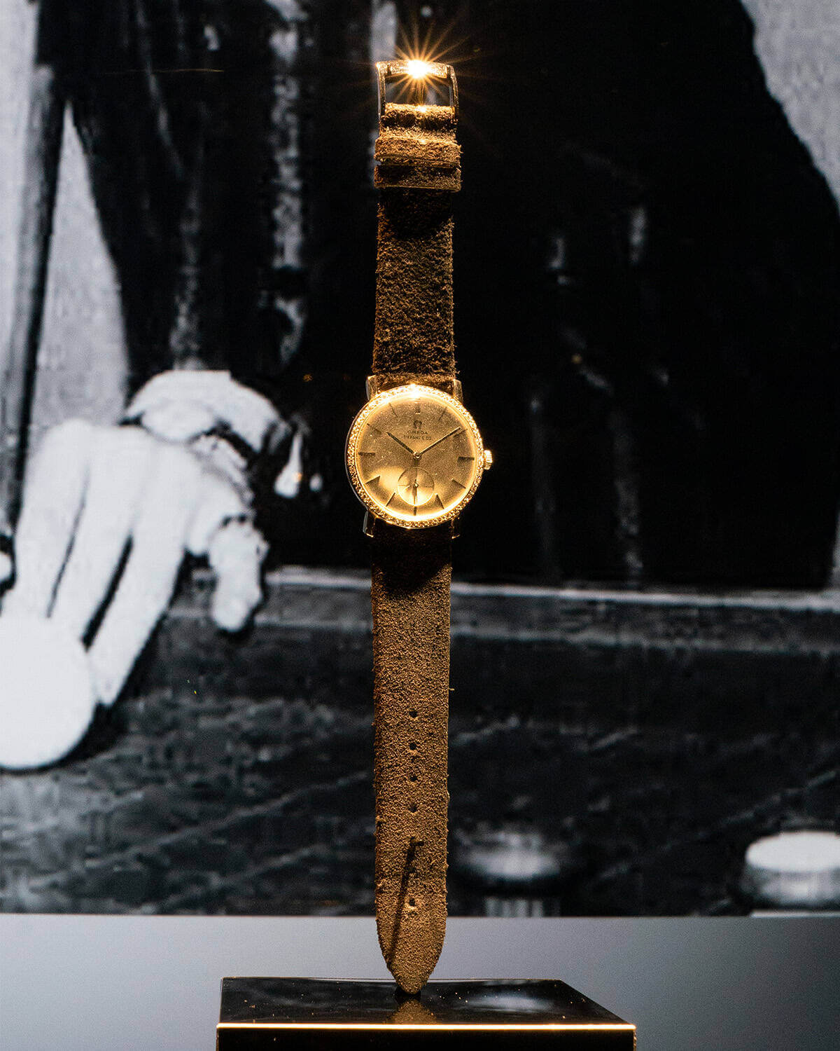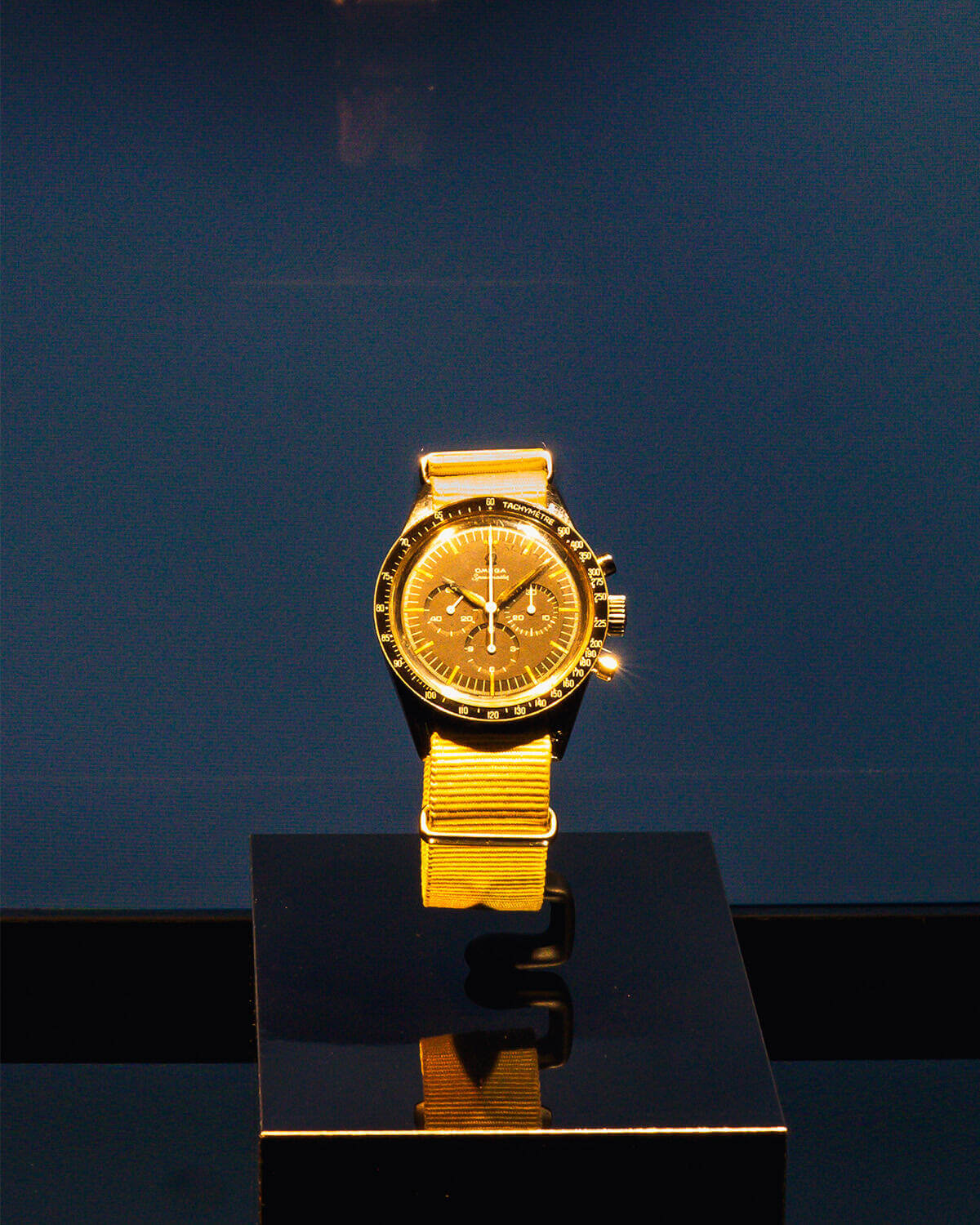 Upon entry you’ll notice a giant golden astronaut, a nod to Omega’s impact on space travel but more on that later, as it’s one of the latter sections of the exhibit. Once you take the requisite photo of the larger than life spaceman, you’ll see an area devoted to vintage Omega timepieces, on loan from the brand’s museum in Biel, Switzerland. Among the items includes Elvis’ watch, a gift from RCA Records in 1960 that features 44 brilliant-cut diamonds on the bezel. The reverse has the inscription, “To Elivs, 75 Million Records, RCA Victor, 12-25.60.” Next to that case is the Slimline, which was worn by Kennedy during his presidential inauguration. Like the Presley watch it also has an inscription on the back and reads, ““President of the United States John F. Kennedy from his friend Grant.” The prescient message was from a friend of Kennedy’s, who gifted him the design months before the election. To round it out, there’s an original Ladymatic from 1955 which was considered to be revolutionary for its time due to its ability to be both feminine and precise as any men’s design.