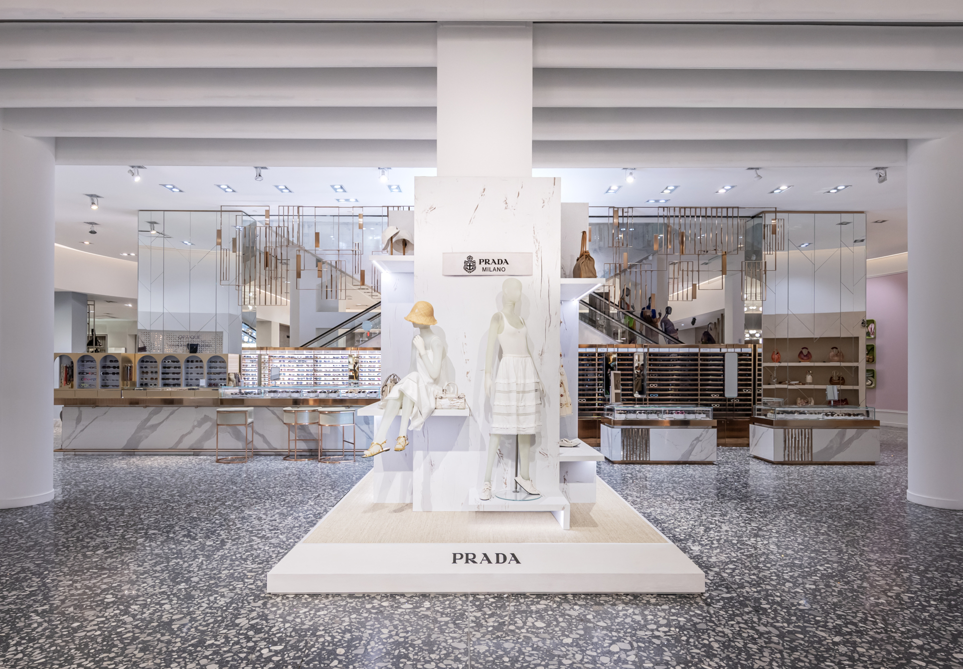 Just in time for New York City temperatures to hit 80 degrees next week comes Prada’s takeover at Saks Fifth Avenue. Like they’ve done before, six of the windows will be devoted to the brand’s Days of Summer collection from now through April 27th. Sleek and clean, the all-white looks feel like a breath of fresh air against an equally as pale background. To lend warmth you’ll find touches of wood, in the form of furniture as well as a natural fiber flooring. As for the clothes, it’s exactly what you want to wear when the weather warms up: lace-insert sundresses, short silhouettes, and a bit of khaki as well, for heft. Accompanied by the brand’s latest handbags like the Route, Carry, and Fold, plus classics like the Bonnie alongside Re-Nylon designs, the range has exclusively launched early at Saks FIfth Avenue stores in New York, Boston, Greenwich, and Neiman’s Beverly Hills plus online.