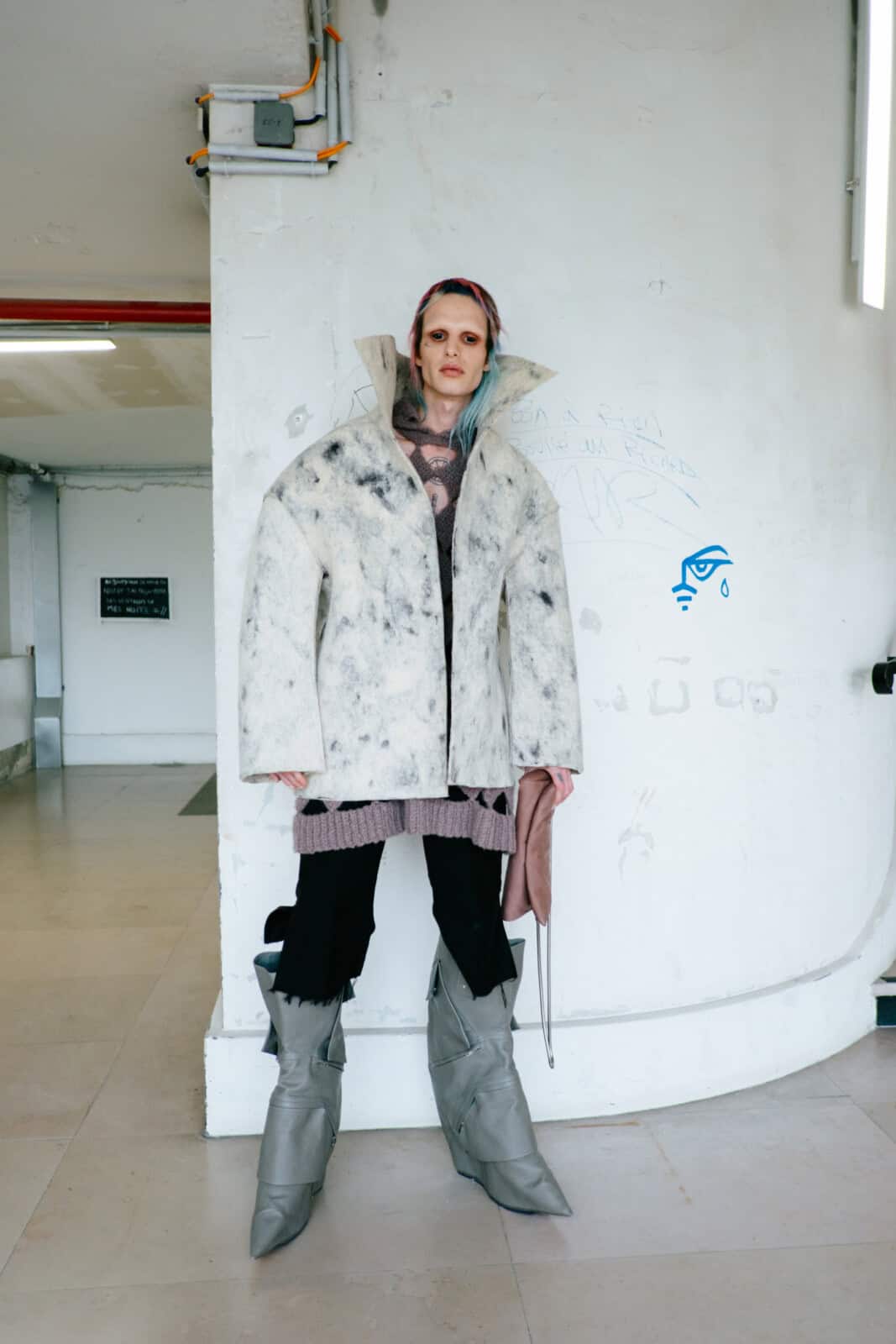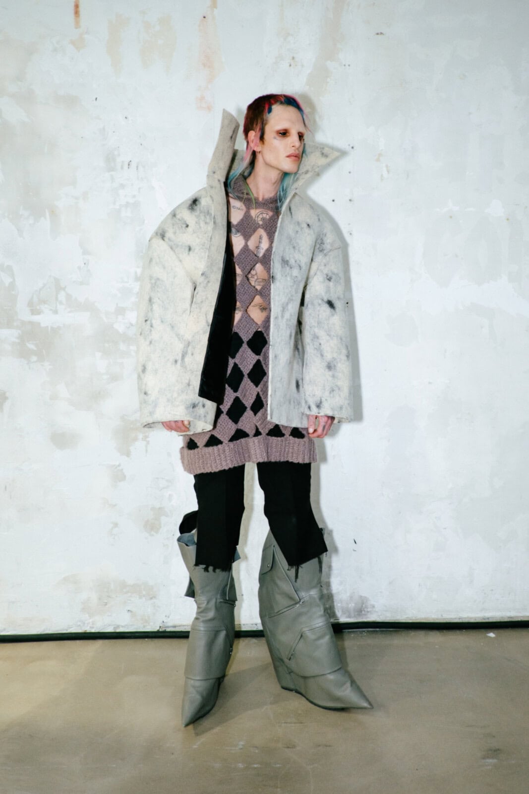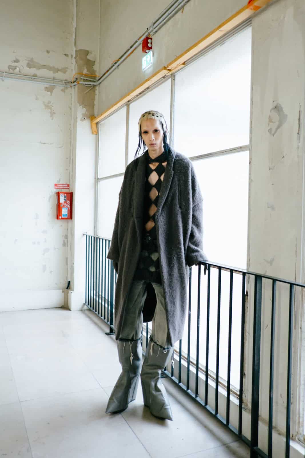 Set to ominous electronic noise in a smoke-choked Palais de Tokyo, the models advanced slowly, towering over the audience on sky-high, round-toed cargo boots inspired by policemen’s shoes. Aptly titled Tower, the idea landed not just in the literal height of the footwear, but in the bulk and authority of the silhouettes themselves. Nothing wobbled or teetered despite the altitude; everything felt planted, heavy and totally controlled.
