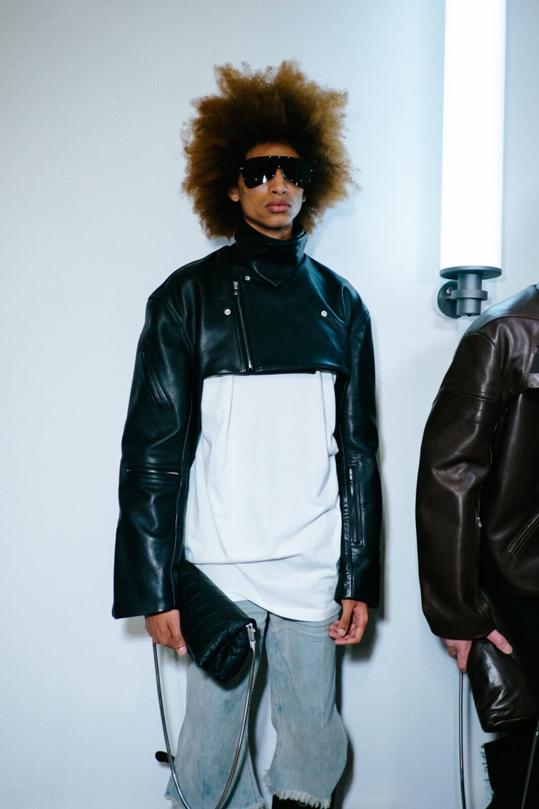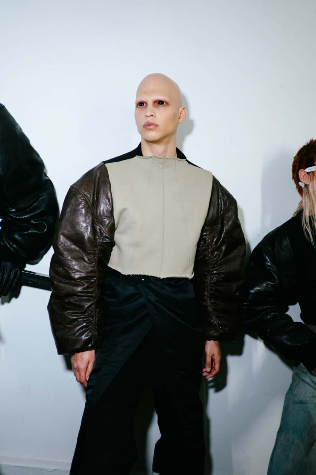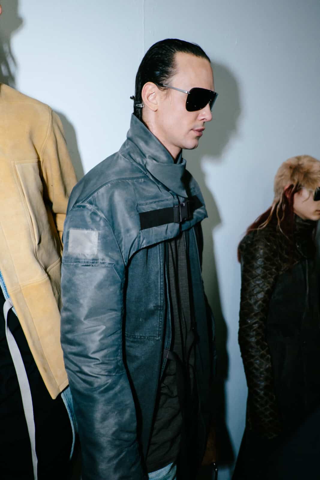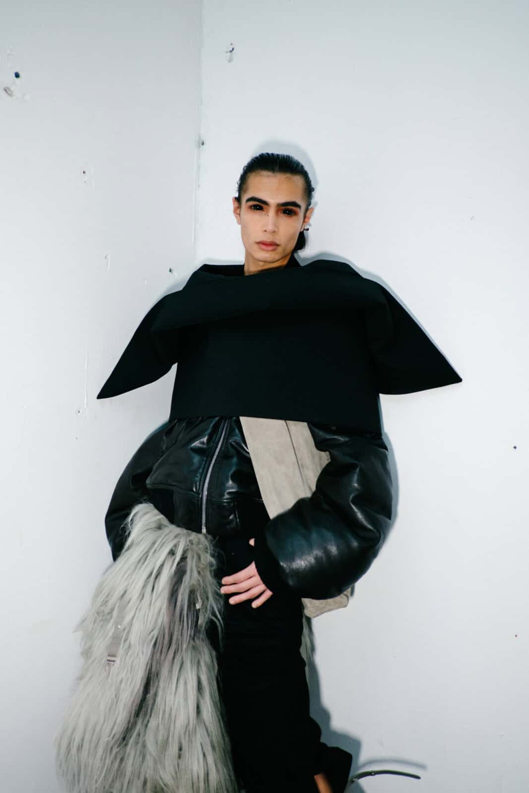 Owens shelved the romance of his recent Temple of Love era in favour of something tougher and more confrontational. Sack coats ballooned in brushed alpaca and boiled wool. Close-fitting coats wrapped the body in glossy bull leather or Kevlar canvas, the bullet-proof association left intentionally intact. Puffers became architectural shoulder capes that jutted out like blades. Long dusters dragged behind enlarged pockets, while muscle-cut leather vests and leather boleros layered over lightweight overcoats pushed attention to the neck and shoulders.