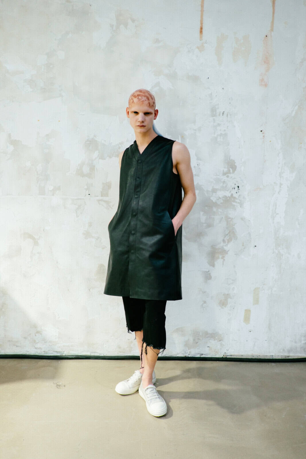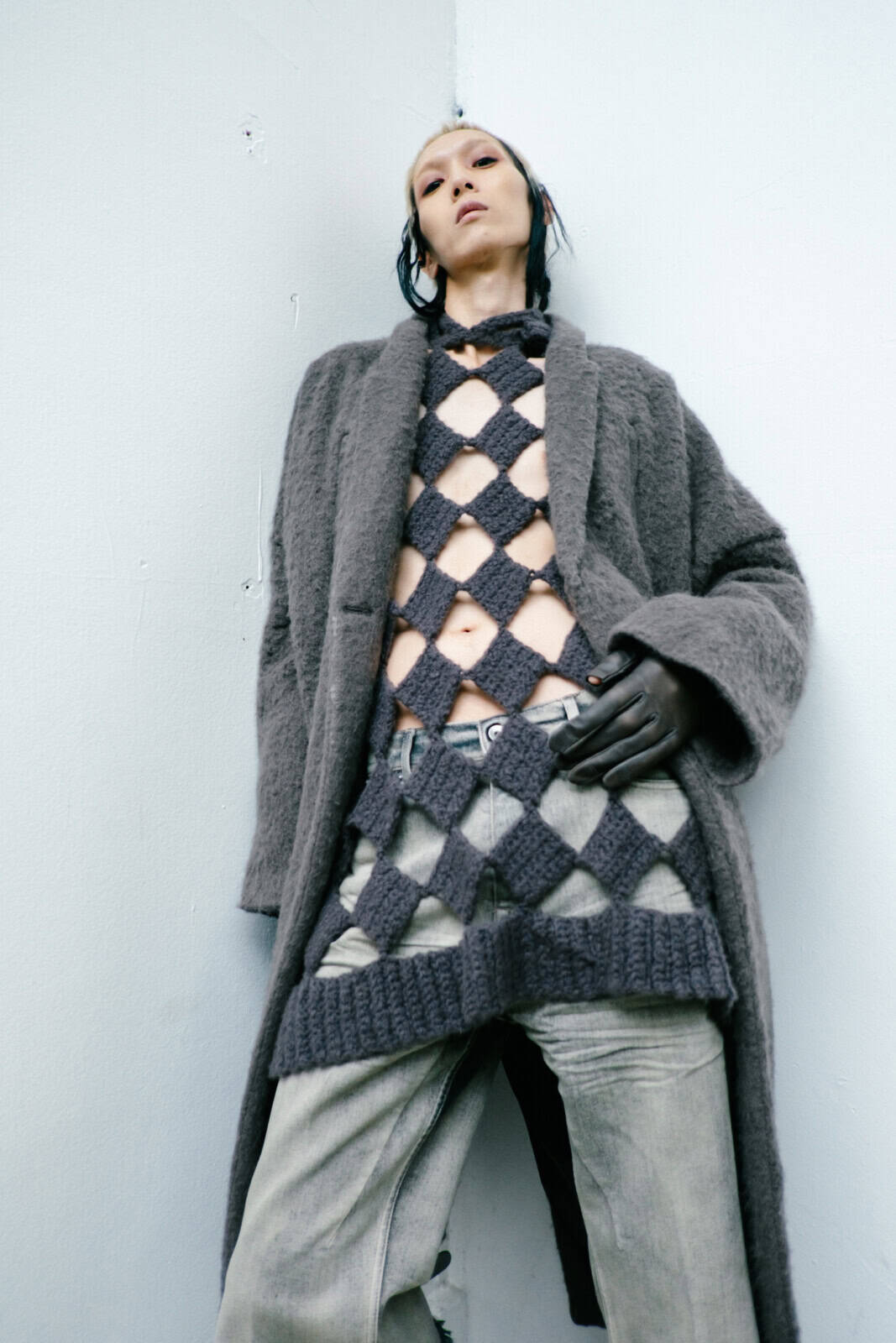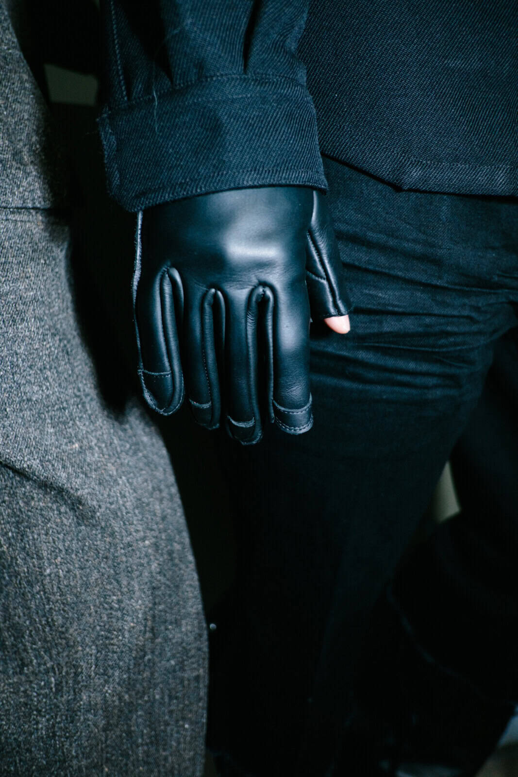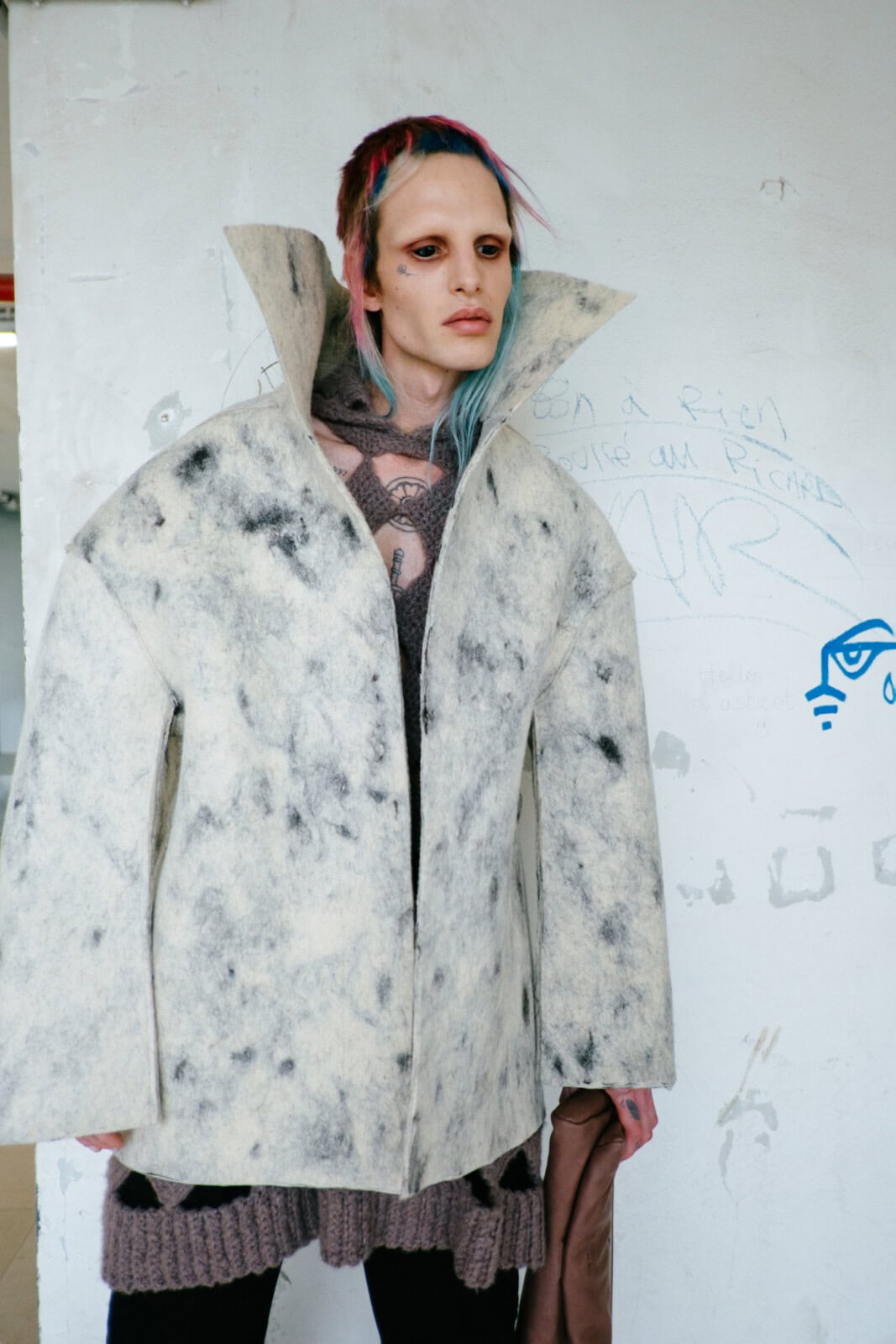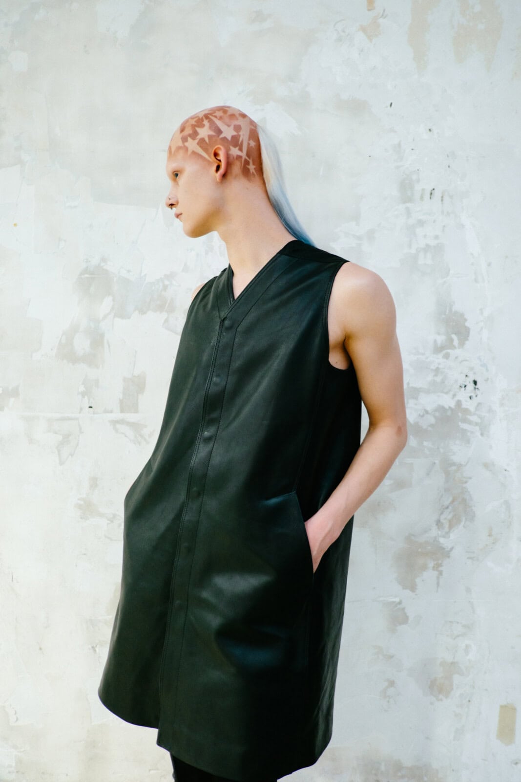 Owens shelved the romance of his recent Temple of Love era in favour of something tougher and more confrontational. Sack coats ballooned in brushed alpaca and boiled wool. Close-fitting coats wrapped the body in glossy bull leather or Kevlar canvas, the bullet-proof association left intentionally intact. Puffers became architectural shoulder capes that jutted out like blades. Long dusters dragged behind enlarged pockets, while muscle-cut leather vests and leather boleros layered over lightweight overcoats pushed attention to the neck and shoulders.
