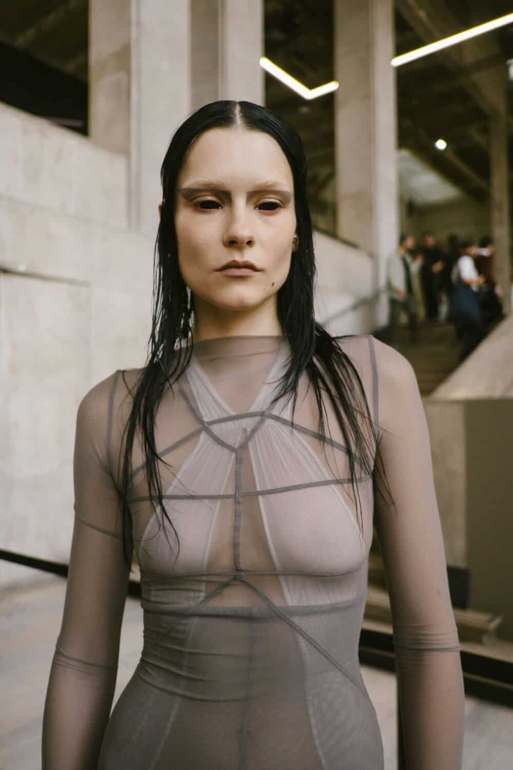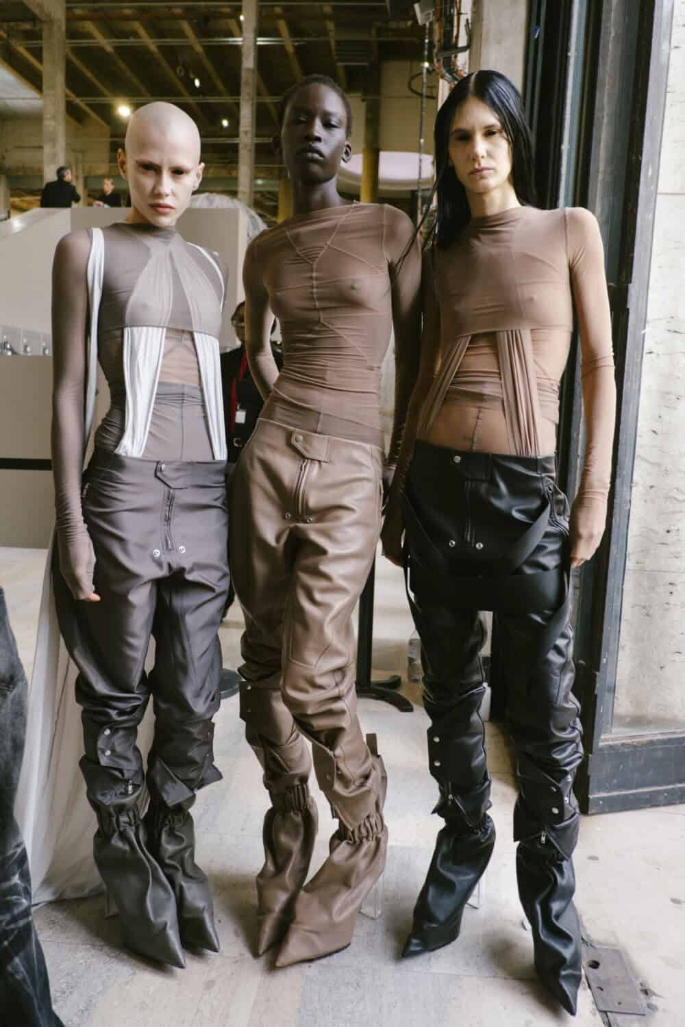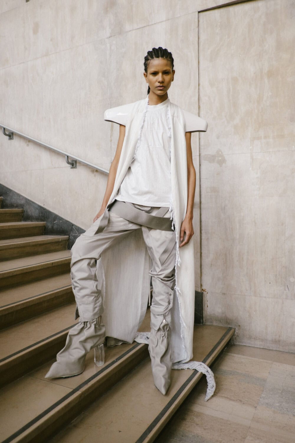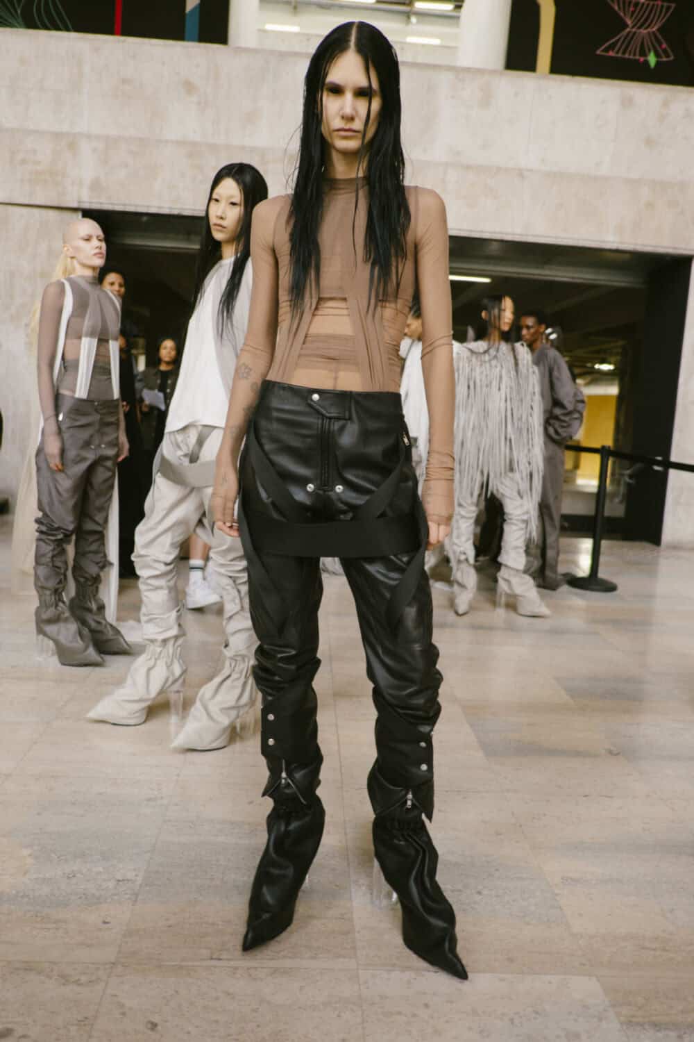 At Rick Owens’ SS26 show, models trekked down a massive scaffolding staircase before trudging through a calf-high pool of water at the Palais de Tokyo. The whole thing felt like a baptism in Owens’ world – dangerous in theory, but in practice? Hardly a single wobble. The Owens cult is unshakable, even in 12cm thigh-high hoof boots – because the higher the heel the closer to heaven, right?