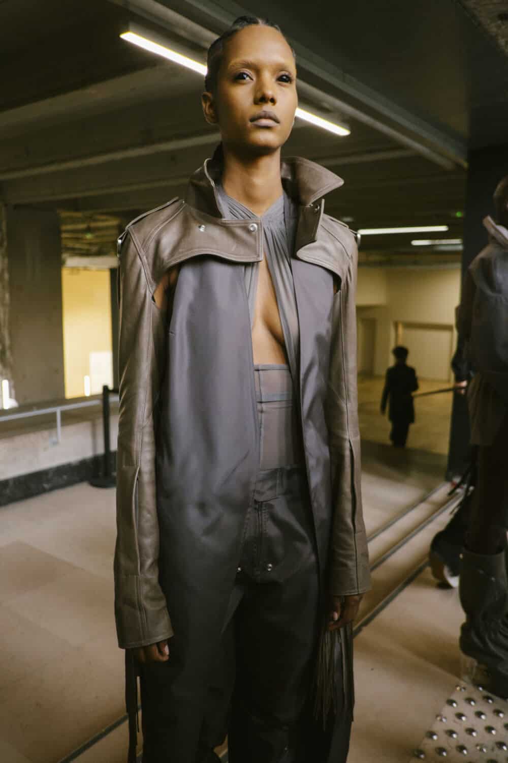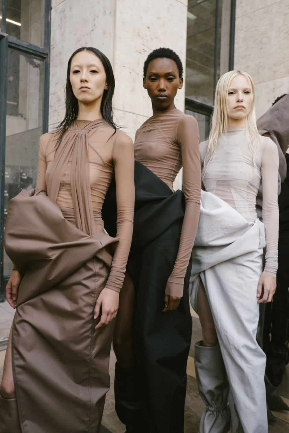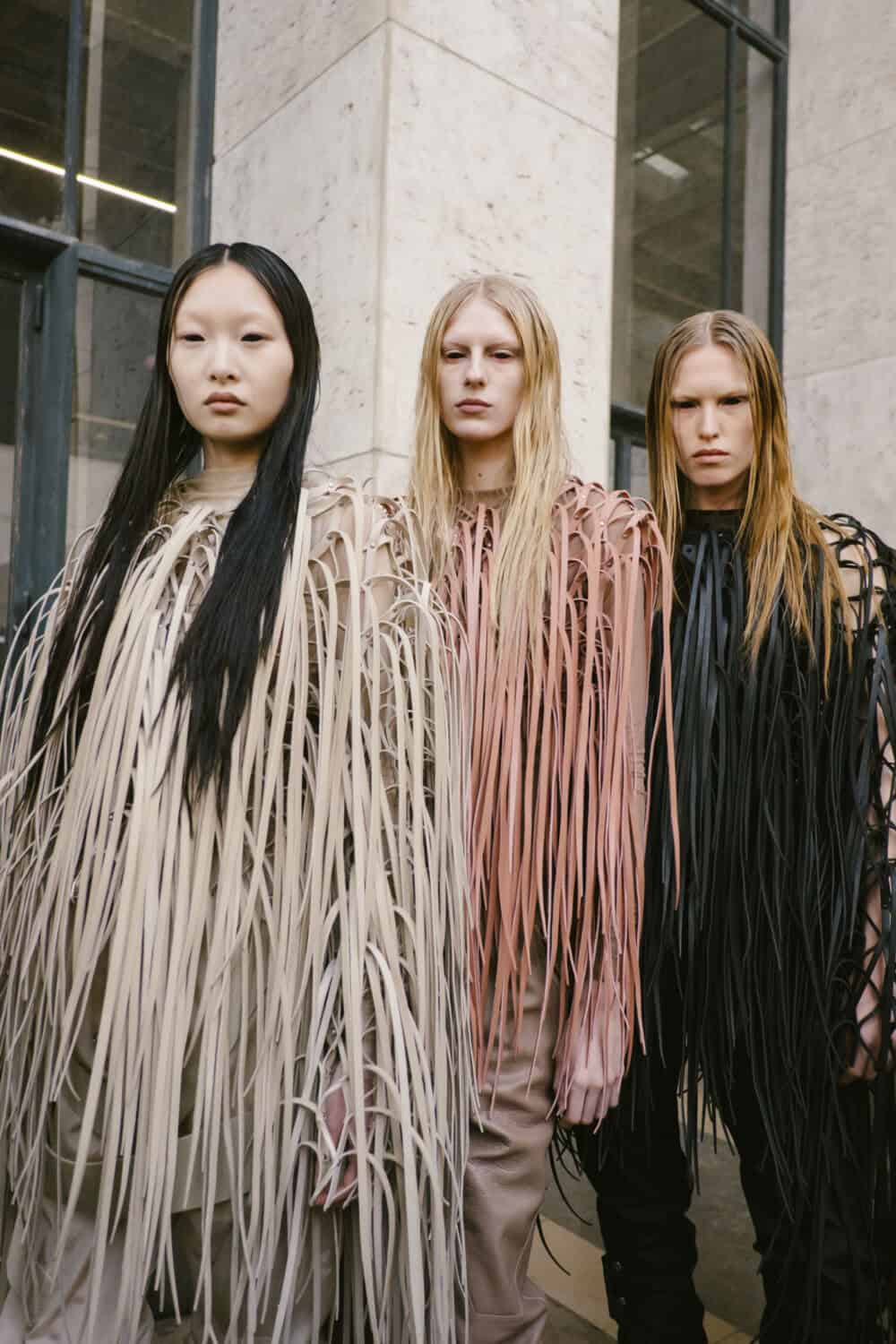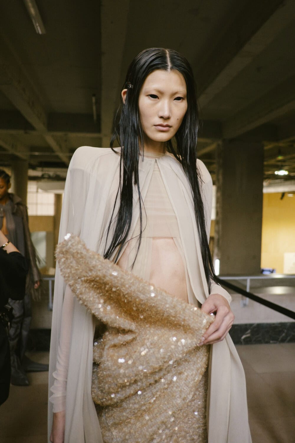 Leather itself got the full Rick treatment: slashed, spiked, fringed to porcupine-like excess and generally destroyed, but made to sway beautifully, courtesy of London’s Straytukay. Underneath, sheer layers clung in clean architectural lines – sexy in suggestion but stern in execution. And those shoulders? Reduced. This season they were hard, shiny, metallic little sculptures, holding up chiffon that drooped and swept like melted candlewax. Bras, courtesy of a collab with Paris lingerie brand Livy, peeked through.
