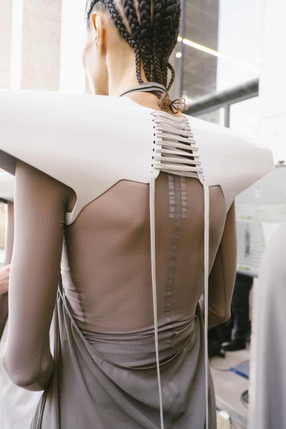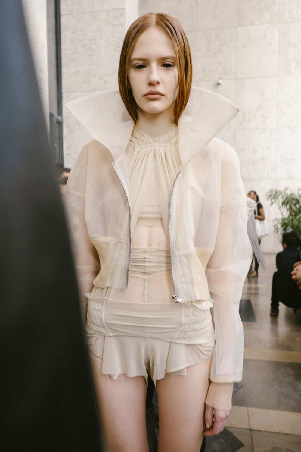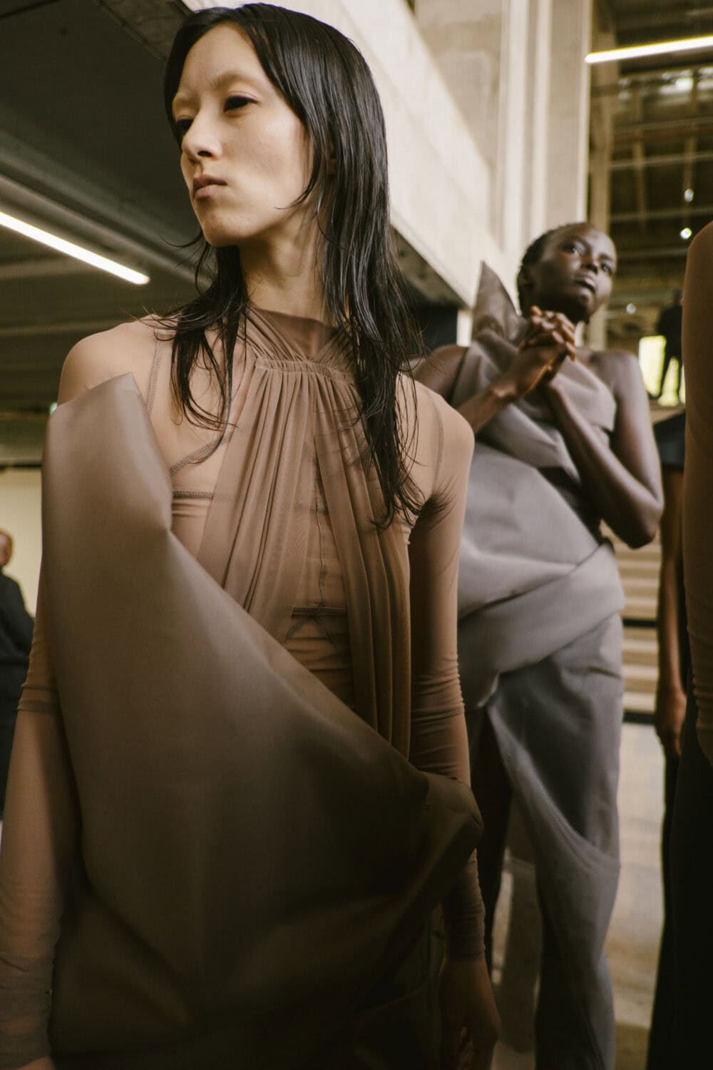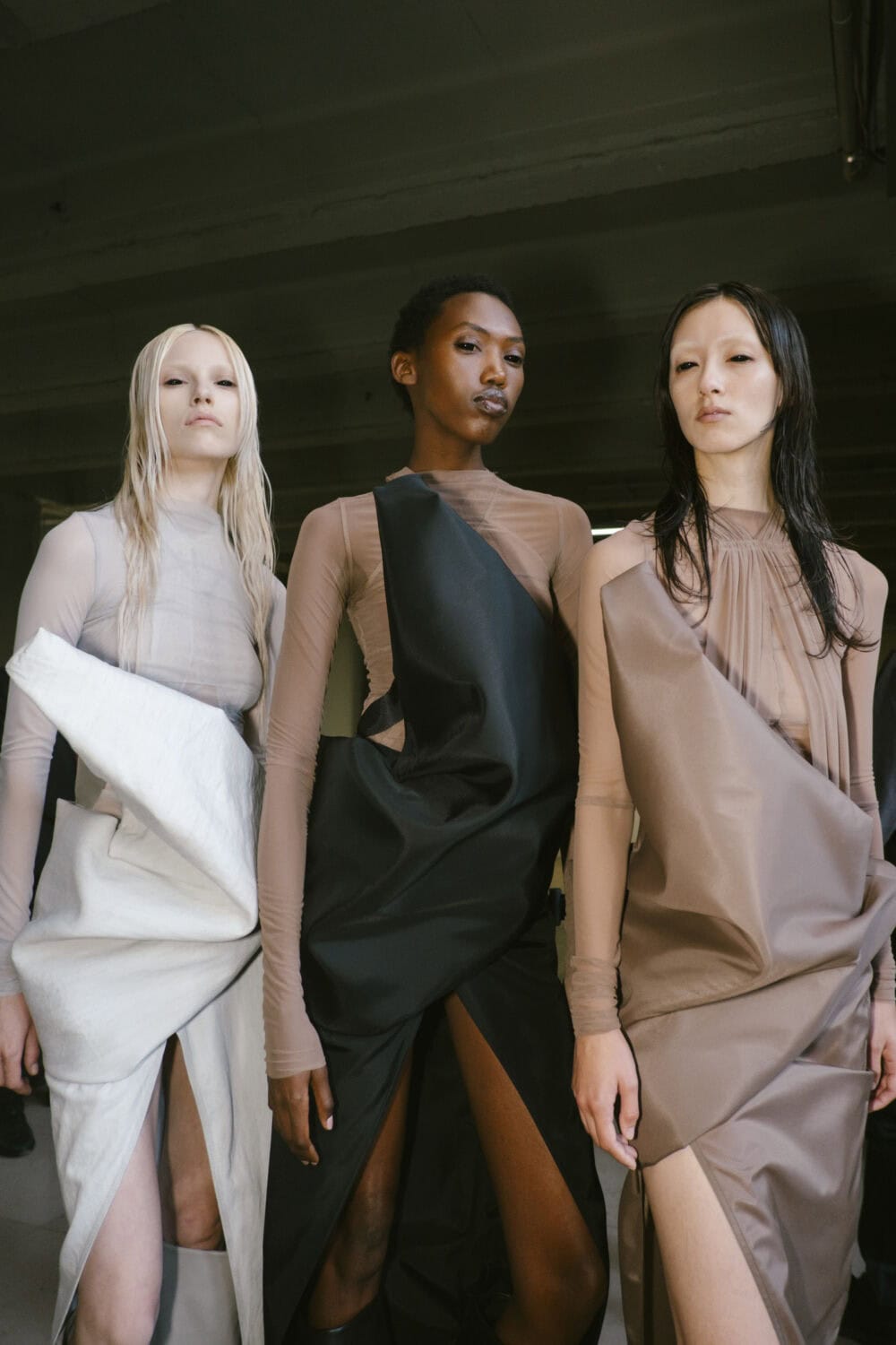 Leather itself got the full Rick treatment: slashed, spiked, fringed to porcupine-like excess and generally destroyed, but made to sway beautifully, courtesy of London’s Straytukay. Underneath, sheer layers clung in clean architectural lines – sexy in suggestion but stern in execution. And those shoulders? Reduced. This season they were hard, shiny, metallic little sculptures, holding up chiffon that drooped and swept like melted candlewax. Bras, courtesy of a collab with Paris lingerie brand Livy, peeked through.