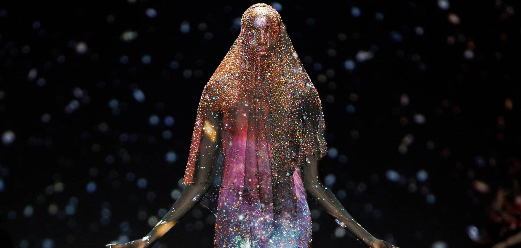 With the final four looks out, the human body decayed from skin to flesh to bones and soul – the latter depicted as a veiled gown with layers of tulle embroidered with passels of kaleidoscopic crystals. It was rather dazzling. Wun’s penchant for horror took shape as a 40 kilo ‘muscle’ dress completely covered in spiked bugle beads. The ‘bones’ took a more theatrical approach, with one including an ominous skeleton mask and shell whilst other looks were magnificent feats of savoir faire.