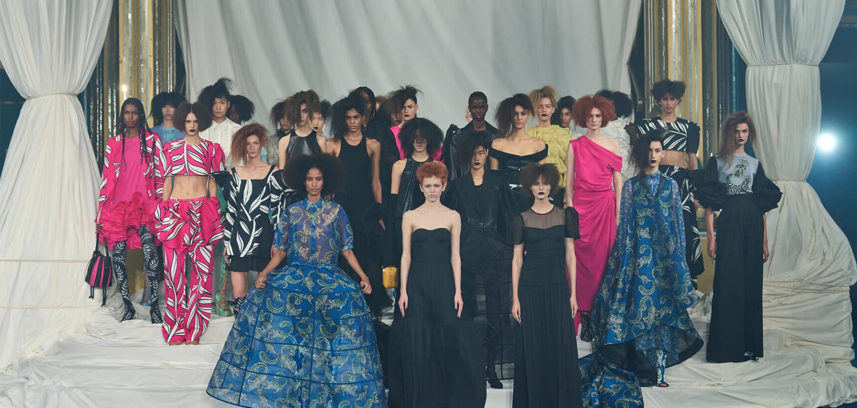 In these ephemeral hours, fresh, floral-adjacent gowns and twinsets emerge. Eccentric ruffles cascade up bed-bound bodies and drop back down to the dancefloor with all the drama of a party-going prima donna – the suggestive teased hair, sweat-smudged makeup and everything. Echoes of surrealist tenets are threaded into flouncy, tiered frocks with rose petal tutus and stratified capes rendered in an array of vivacious colours from fuchsia and curacao blue to golden yellow, silver and jet black. The collection feels subtly experimental, but like polished putty in creative director Charles de Vilmorin’s hands. While it may only be his third season at the Parisian maison, he has proven himself a material magician under the veil of such a decadent luxury label.