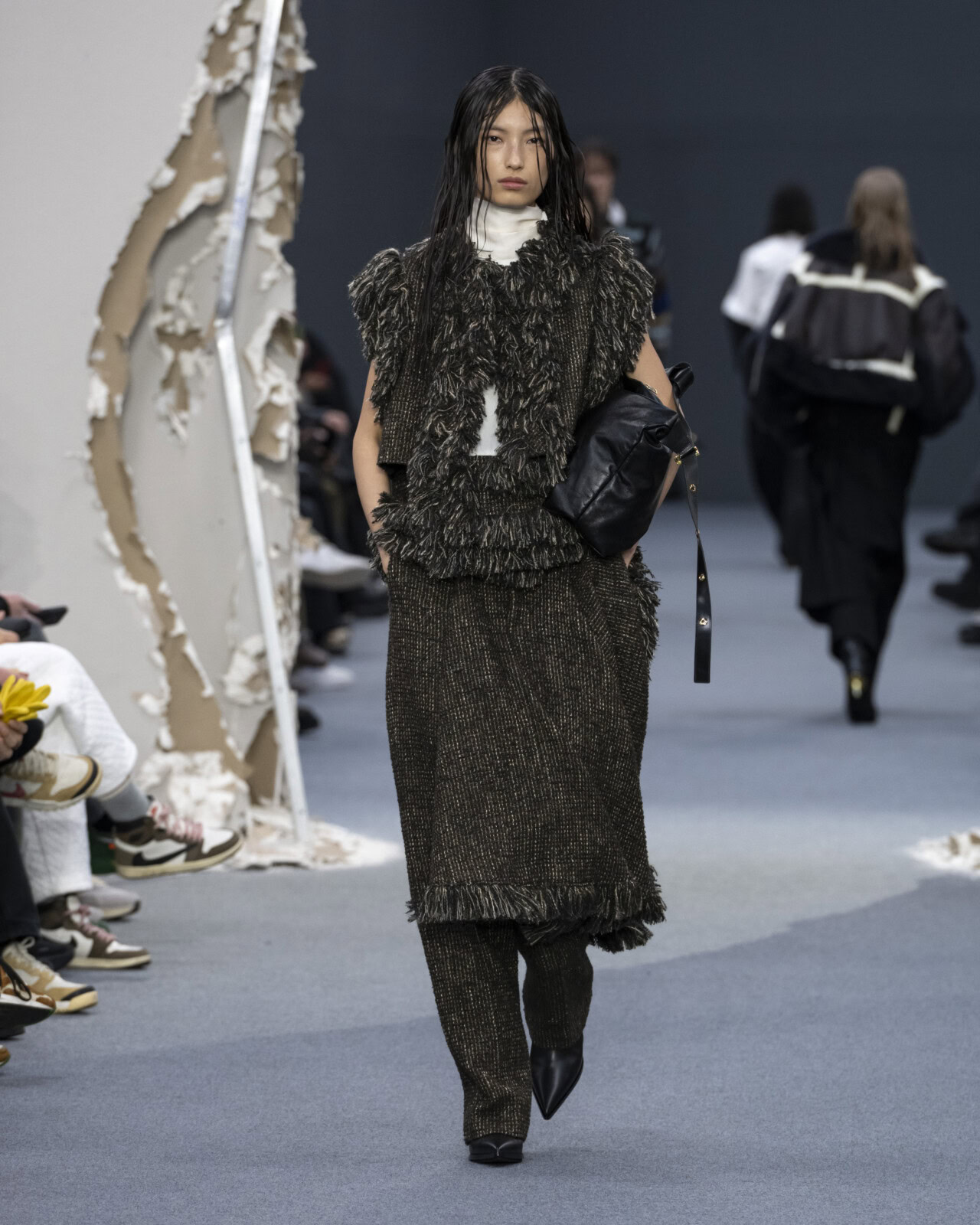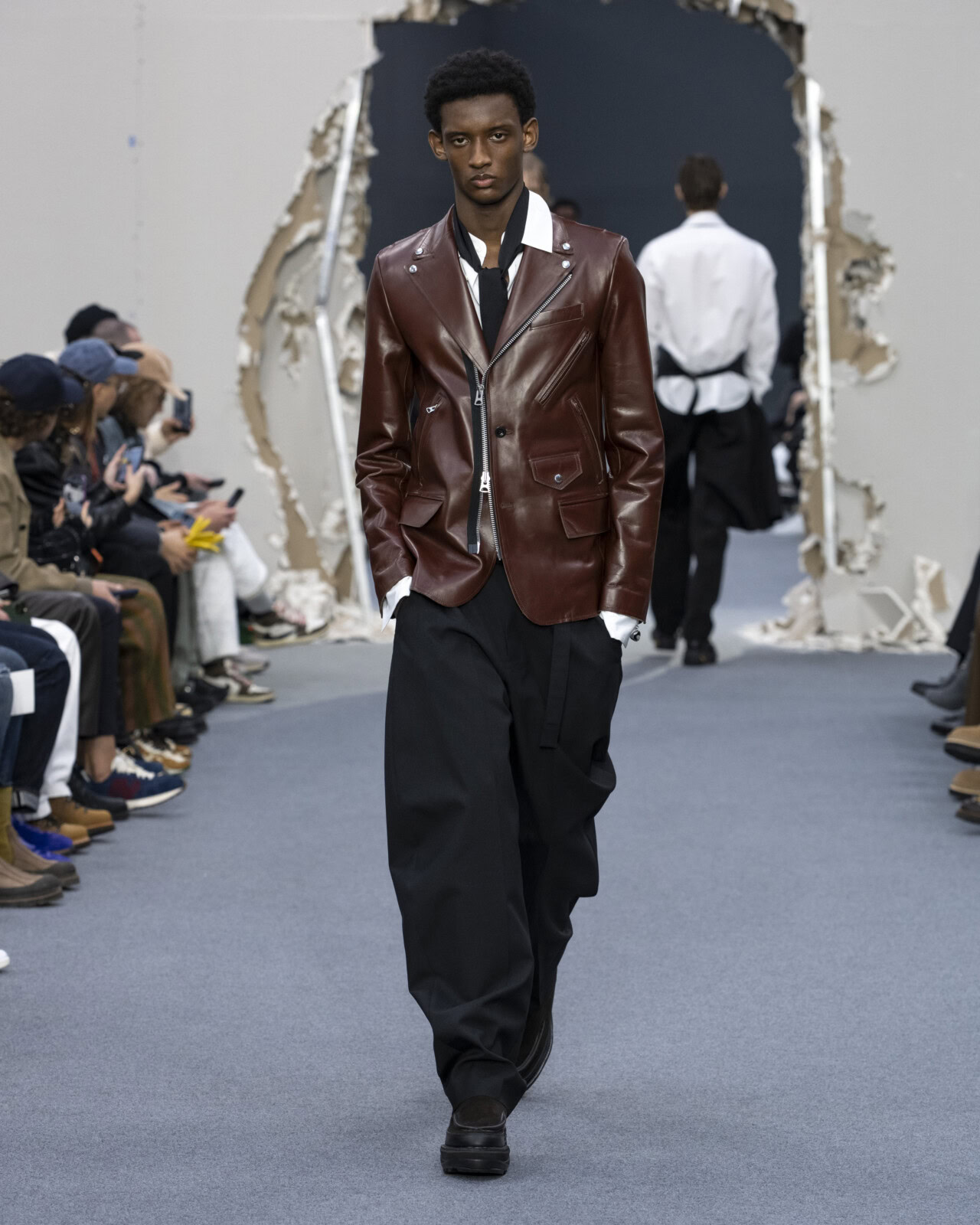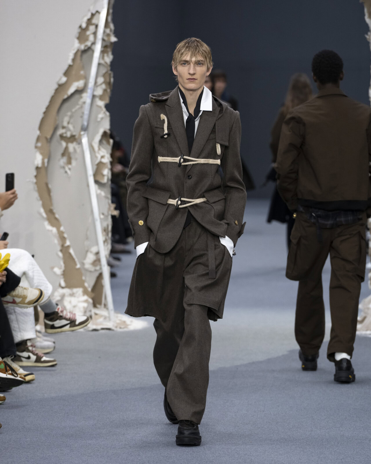 Michel Gaubert provided one of the week’s most memorable soundtracks, which bounced from Freddie Mercury bellowing “I want to break free” through to a menacing Charli xcx number from the Brat tour before a wholesome bit of Tears for Fears’s Everybody Wants To Rule The World to close things out. The chopping and changing played nicely with the collage of different design ideas. It began with the classic tuxedo, with jackets now sliced and pieced back together in interesting finishes. Then came an outerwear-heavy section including bombers that were elongated into trench coats and cloaked in shaggy fake fur and tweed-on-tweed looks that were plucked at to create an interesting fraying effect that bounced as the models walked.