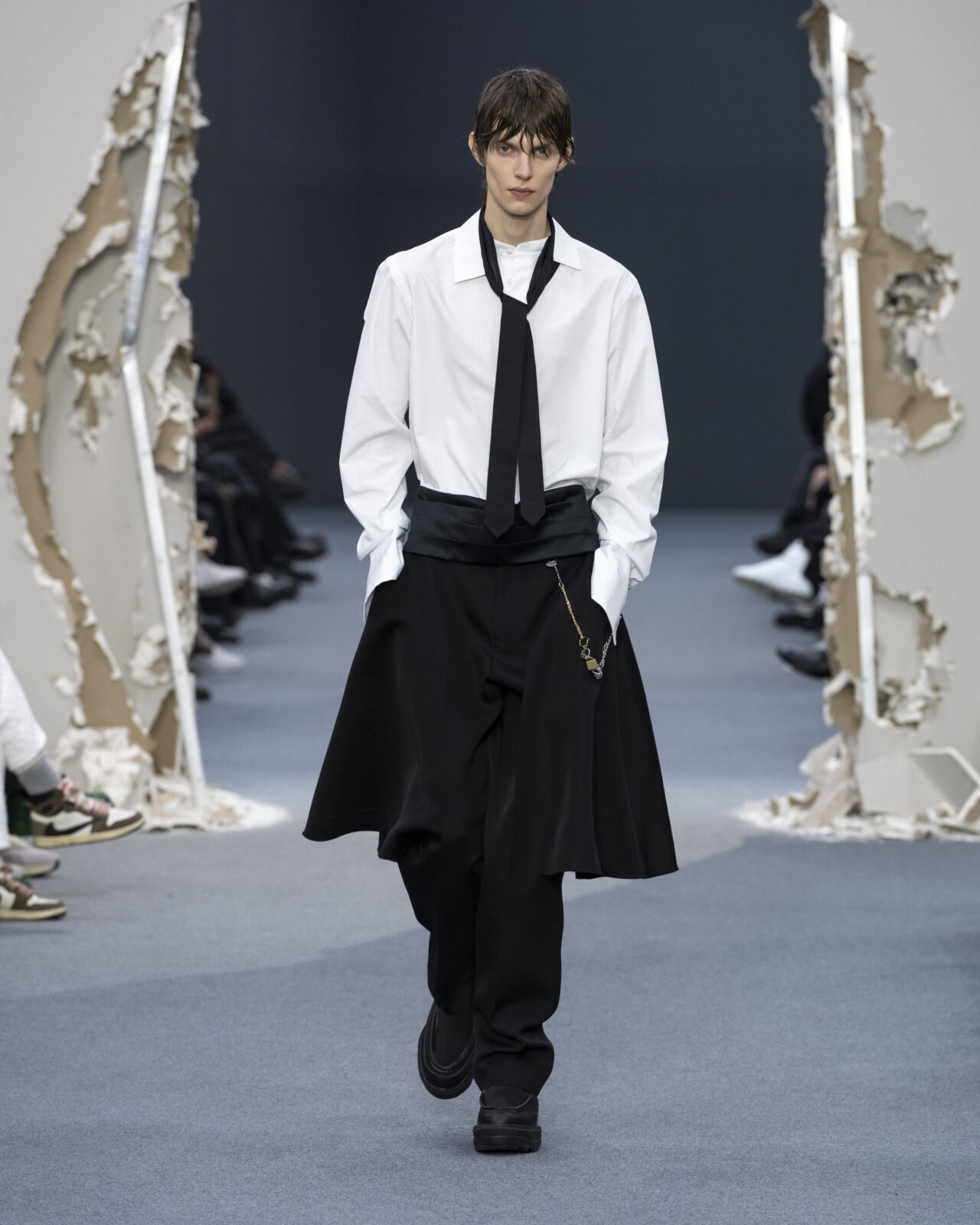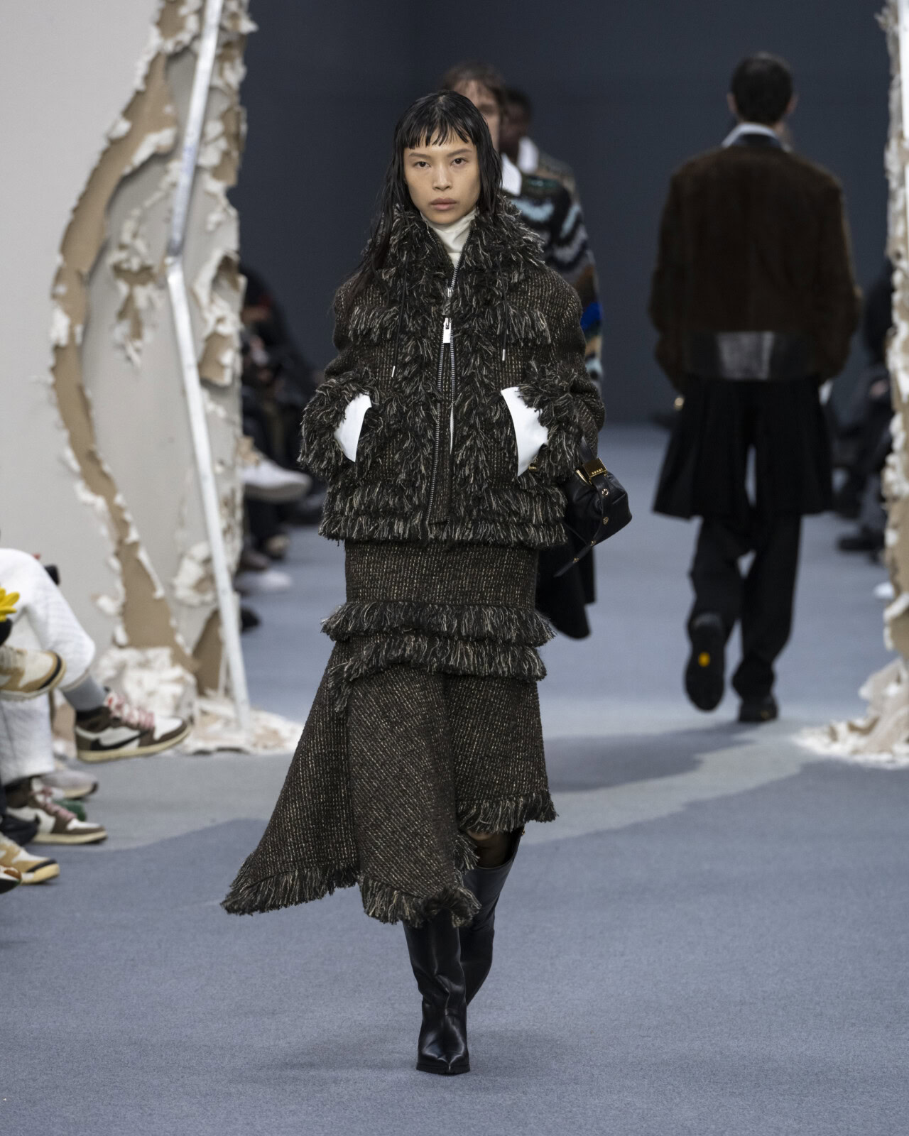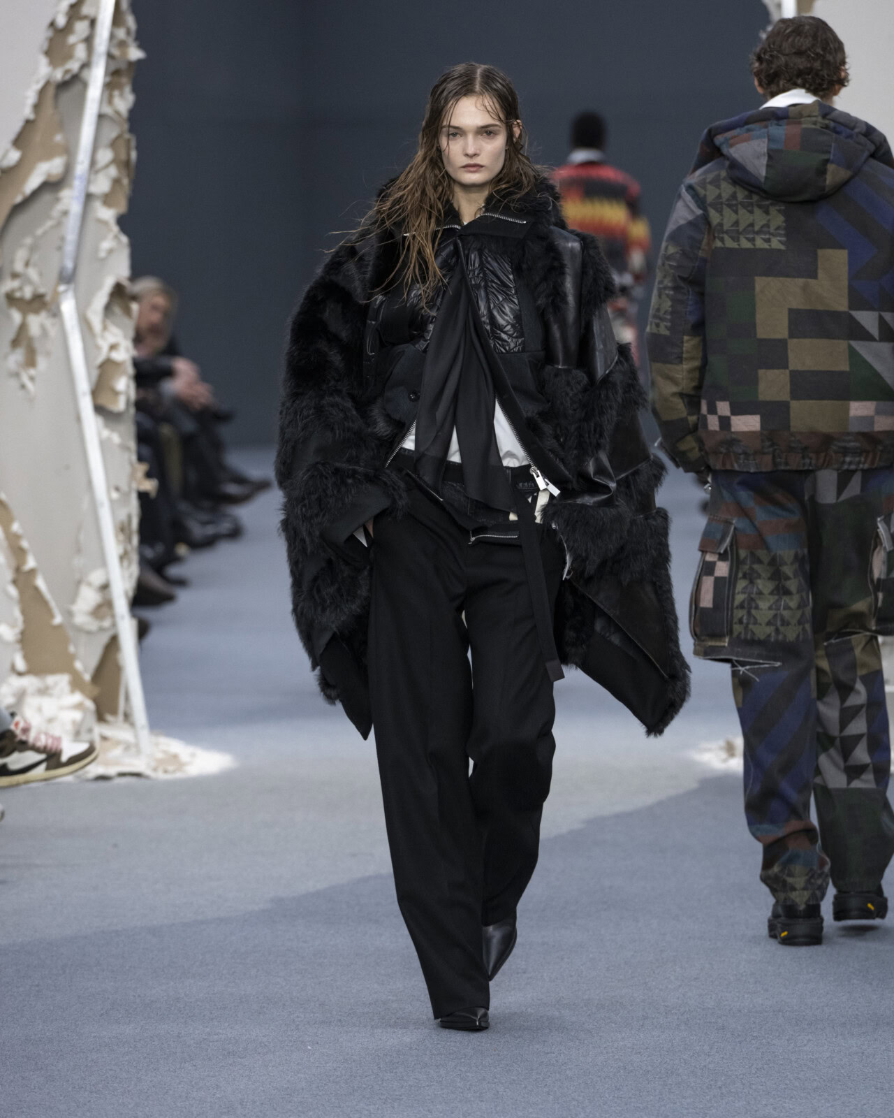 Michel Gaubert provided one of the week’s most memorable soundtracks, which bounced from Freddie Mercury bellowing “I want to break free” through to a menacing Charli xcx number from the Brat tour before a wholesome bit of Tears for Fears’s Everybody Wants To Rule The World to close things out. The chopping and changing played nicely with the collage of different design ideas. It began with the classic tuxedo, with jackets now sliced and pieced back together in interesting finishes. Then came an outerwear-heavy section including bombers that were elongated into trench coats and cloaked in shaggy fake fur and tweed-on-tweed looks that were plucked at to create an interesting fraying effect that bounced as the models walked.