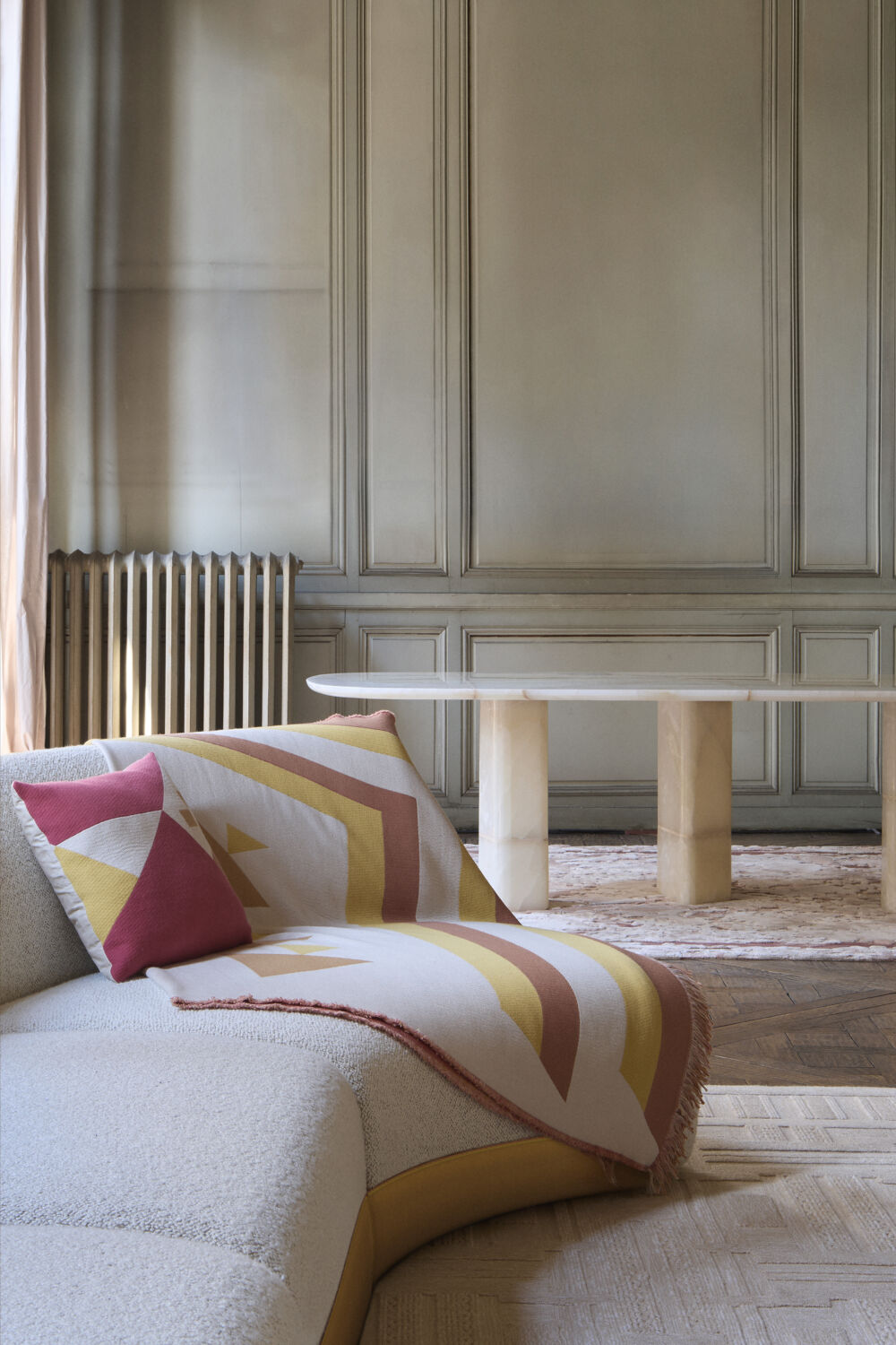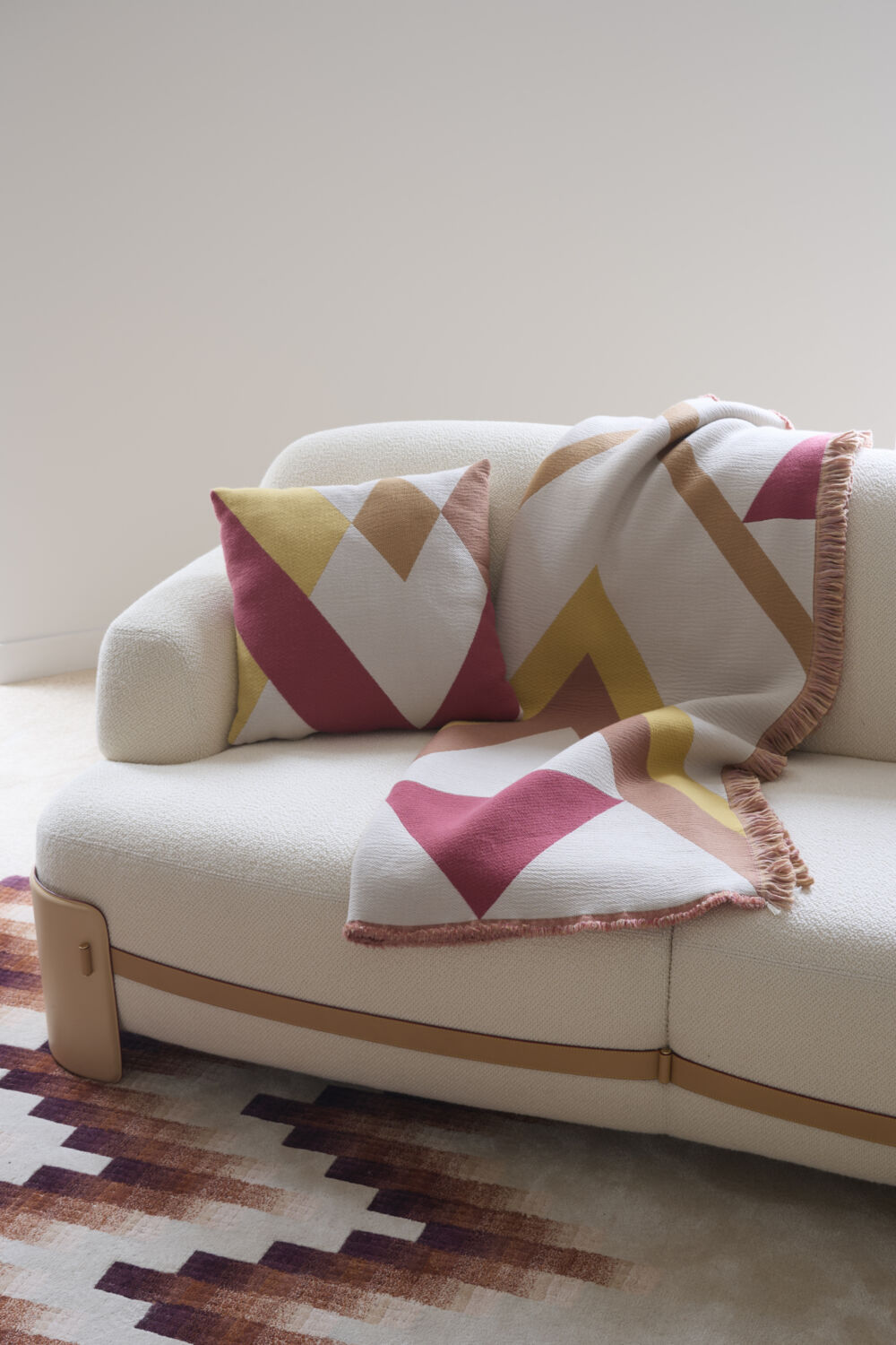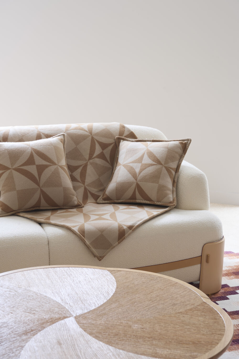 What would it feel like to live during the 70s and 80s in the home of a wealthy woman with a sharp eye for interiors? Loro Piana and Dimoremilano offered their answer through an immersive installation that blurred the line between reality and cinematic fiction. It felt like stepping into a moody drama. A porcelain set smashed to pieces, rooms in disarray, and a wardrobe turned completely upside down — it seemed as if a screen siren had just stormed out mid-breakdown. And yet, despite the chaos, a comforting sense of home lingered in the air, brought to life through familiar sounds like a phone ringing, a piano playing, or the soft patter of rain against the windows. That quiet atmosphere was interrupted by bursts of sound and sensory input — curated by music composer and multimedia artist Nicola Guiducci — adding a delicate tension between stillness and movement. What grounds it all back in the real world? The beauty of the new furniture pieces created by the design duo for Loro Piana Interiors. Think: Quarona poufs and coffee tables where curved wooden bands wrap around cushy seats clad in Cashmere Ladakh.
