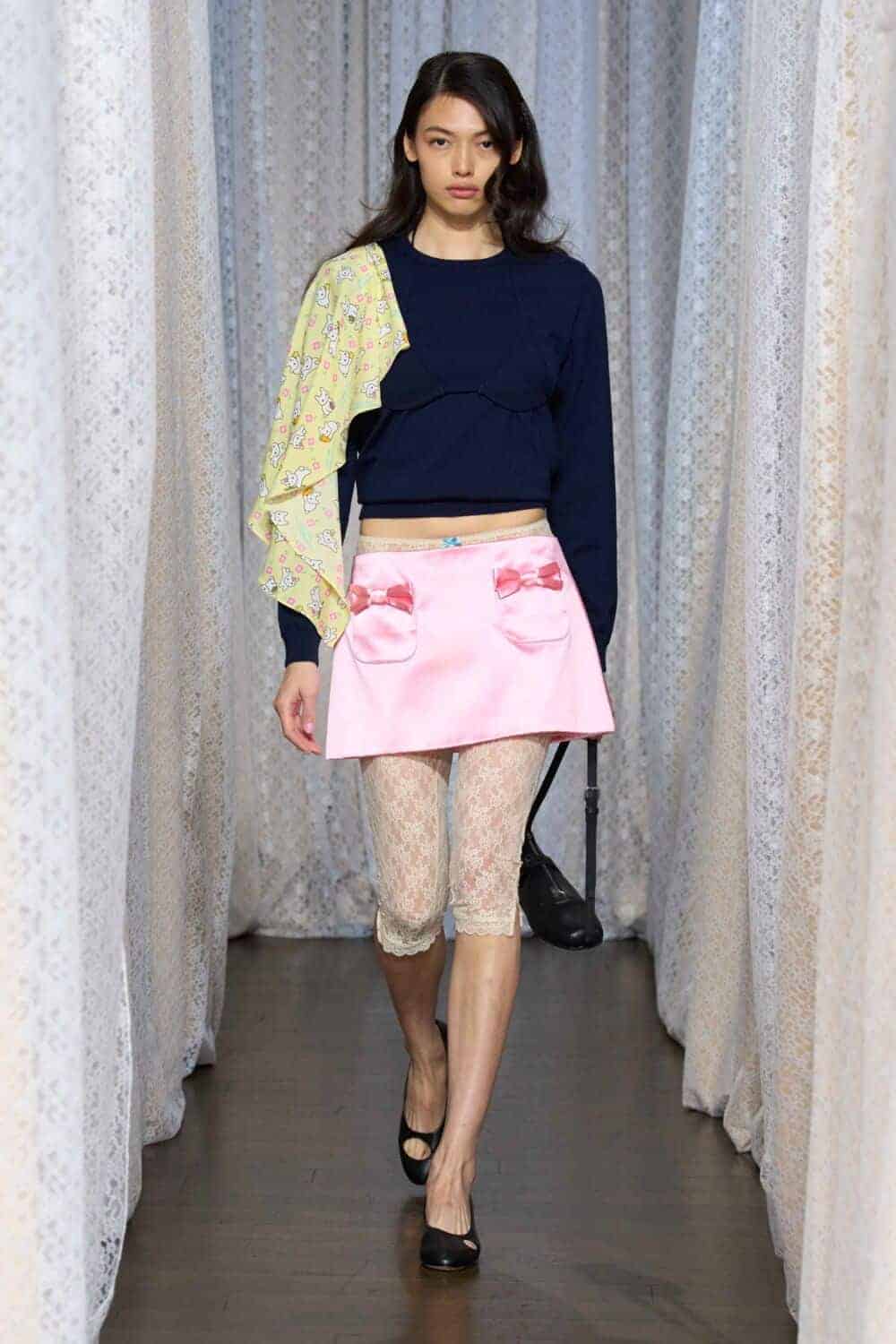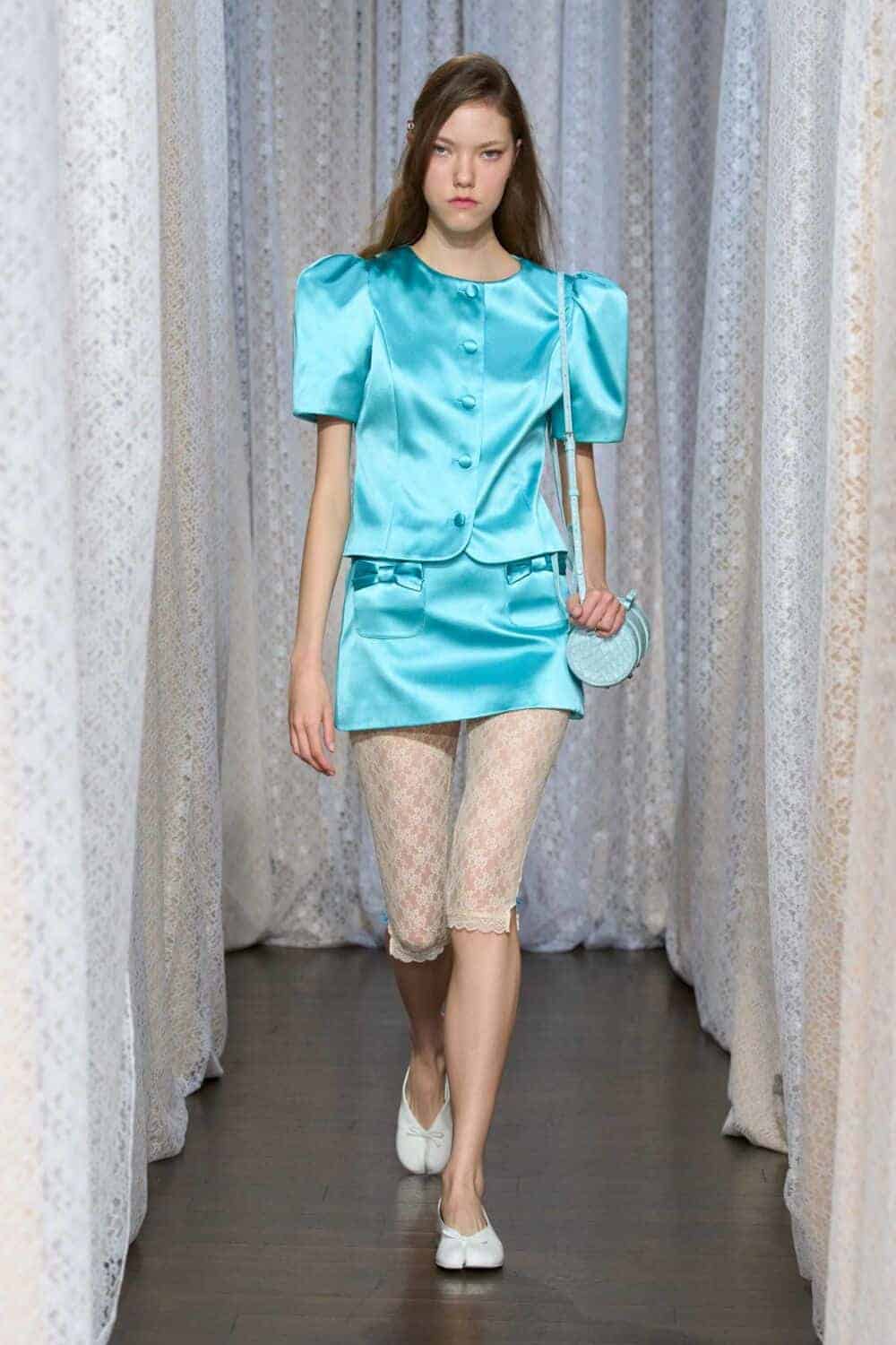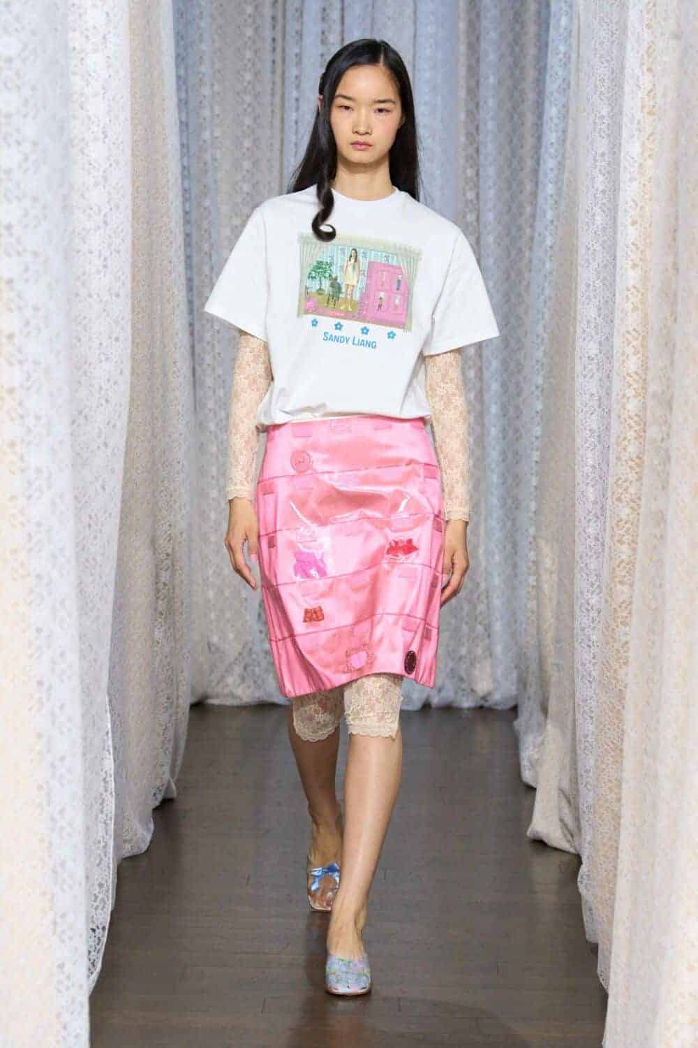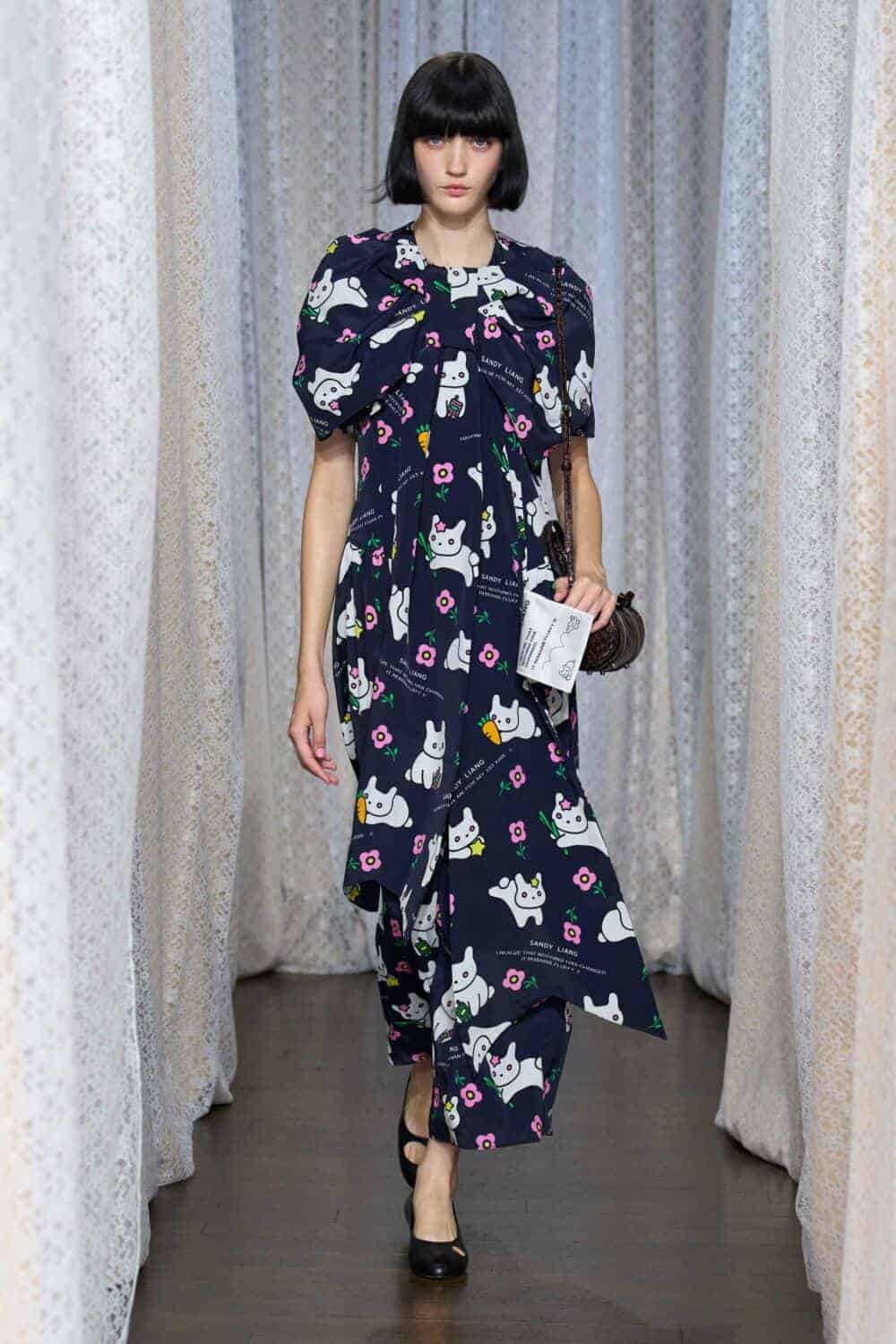 However, this collection may hint that this reverence to the past is not entirely idyllic. The blanket-like prints found throughout included notes apologizing to first kisses. There were also visible care tags blown up to phone-sized proportions that asked the wearer to be present and kind to themselves. This is an acknowledgement that it is hard to be totally carefree when your heart is on your sleeve. On the streets, Sandy Liang looks chic when cut by accessories and fabrics that hint at a harder edge, and a more complex life. As the years encompassing childhood fly by, it will be interesting to see which of these items make a mark on the soul and stick. Liang’s collection has given the tools but can only imagine who you will become and what life you’ll lead in these looks and amongst these charms.