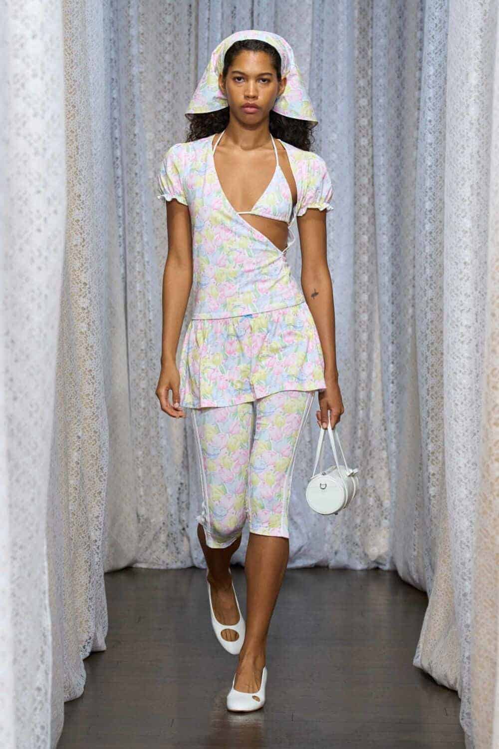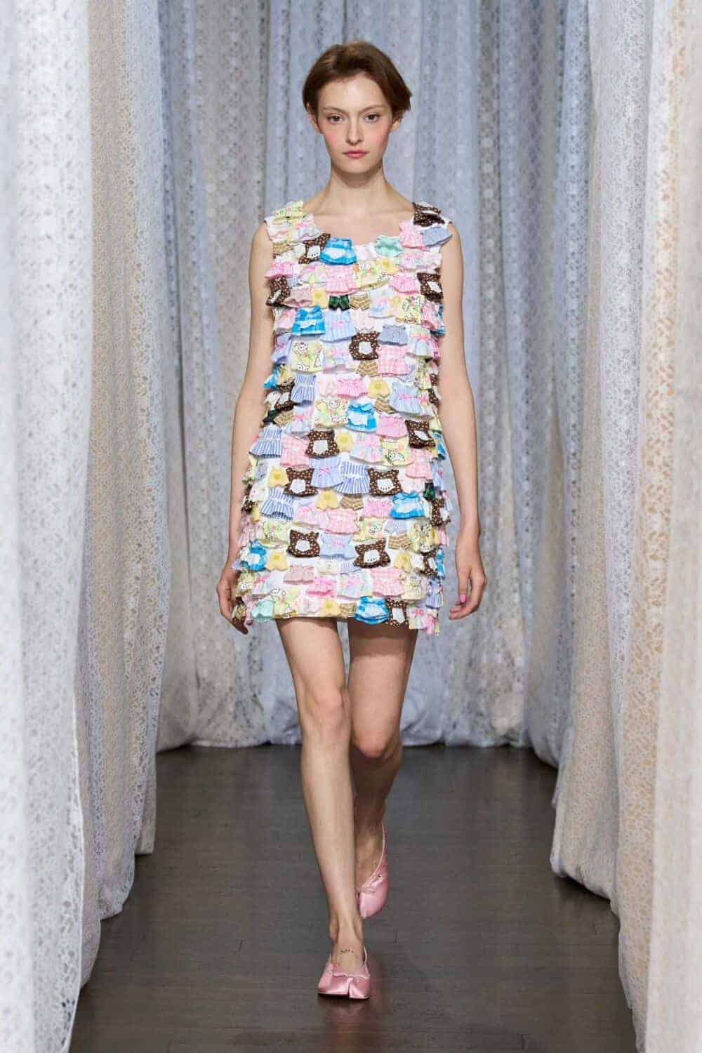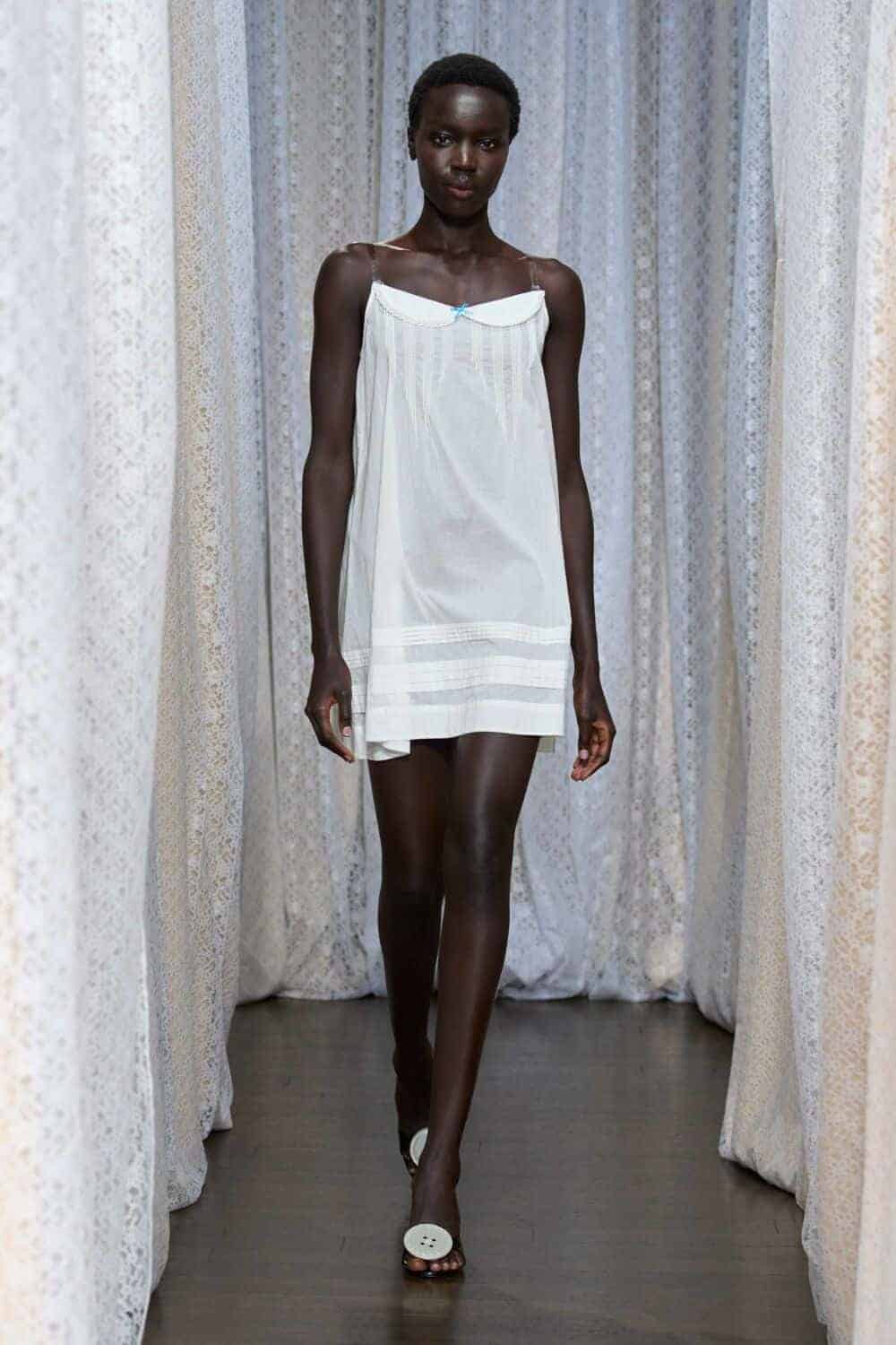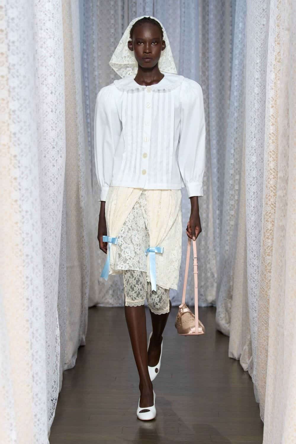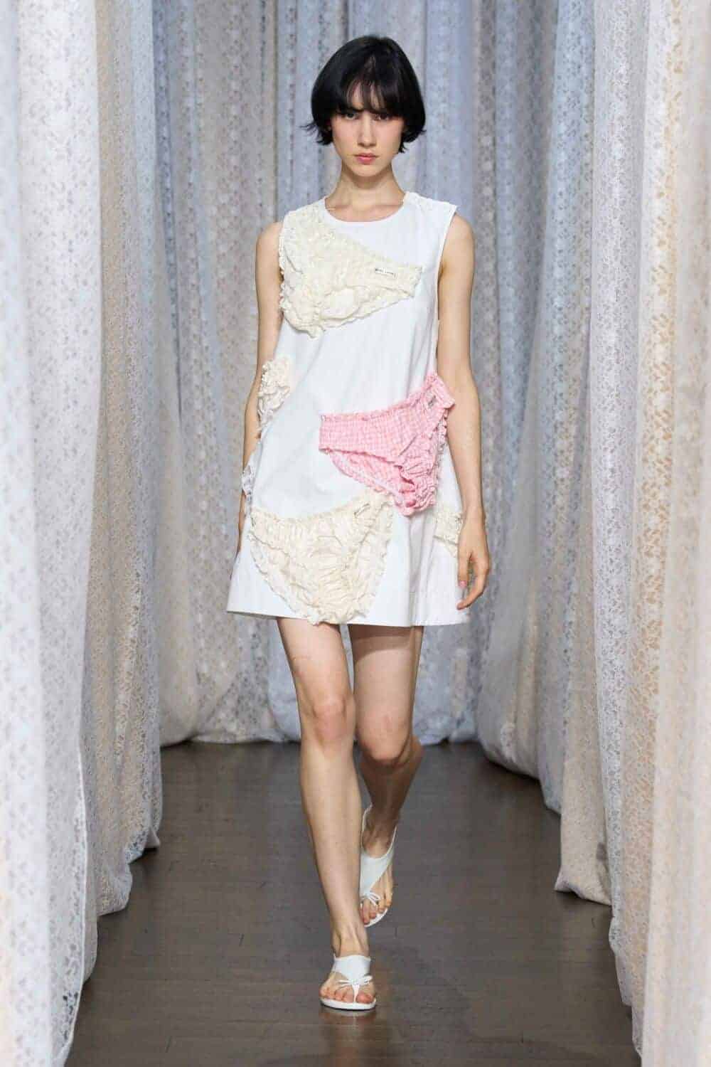 However, this collection may hint that this reverence to the past is not entirely idyllic. The blanket-like prints found throughout included notes apologizing to first kisses. There were also visible care tags blown up to phone-sized proportions that asked the wearer to be present and kind to themselves. This is an acknowledgement that it is hard to be totally carefree when your heart is on your sleeve. On the streets, Sandy Liang looks chic when cut by accessories and fabrics that hint at a harder edge, and a more complex life. As the years encompassing childhood fly by, it will be interesting to see which of these items make a mark on the soul and stick. Liang’s collection has given the tools but can only imagine who you will become and what life you’ll lead in these looks and amongst these charms.