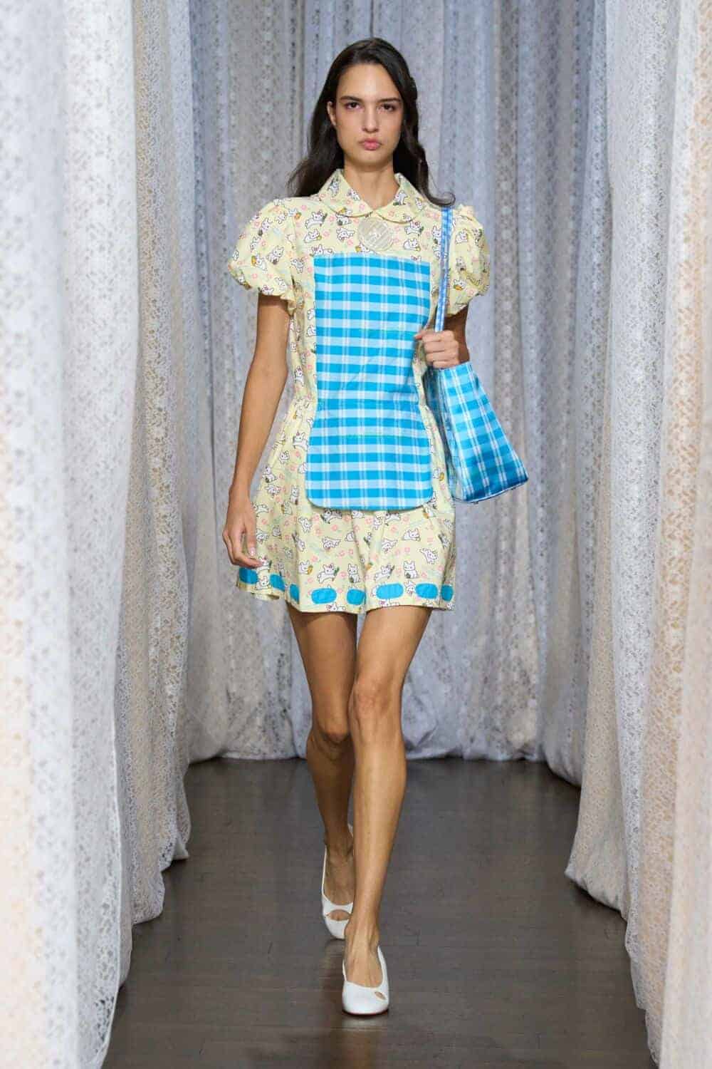 For spring 2026, Sandy Liang continues mining an idealized childhood to consider how personhood comes from our relationships to objects and the memories we’ve made alongside them. Over Hillary Duff’s “What Dreams Are Made Of” from The Lizzie McGuire Movie, models wore princess dresses, church-ready satin a-line skirts, flowery pajama print capris overlaid with skirts, and a fluorescent Ozian blue gingham like Dorothy goes to Bedford Avenue. There was a flurry of charming accessories like oversized buttons on sandals, USB earrings, and purses shaped like ballet flats that took the brand to new levels of the uncanny.