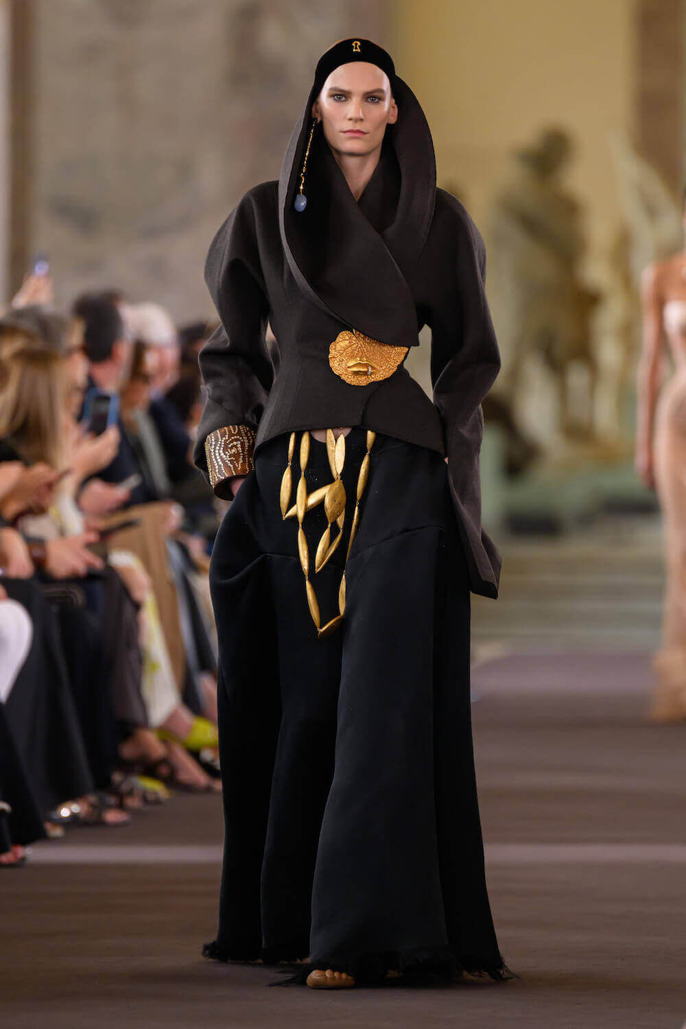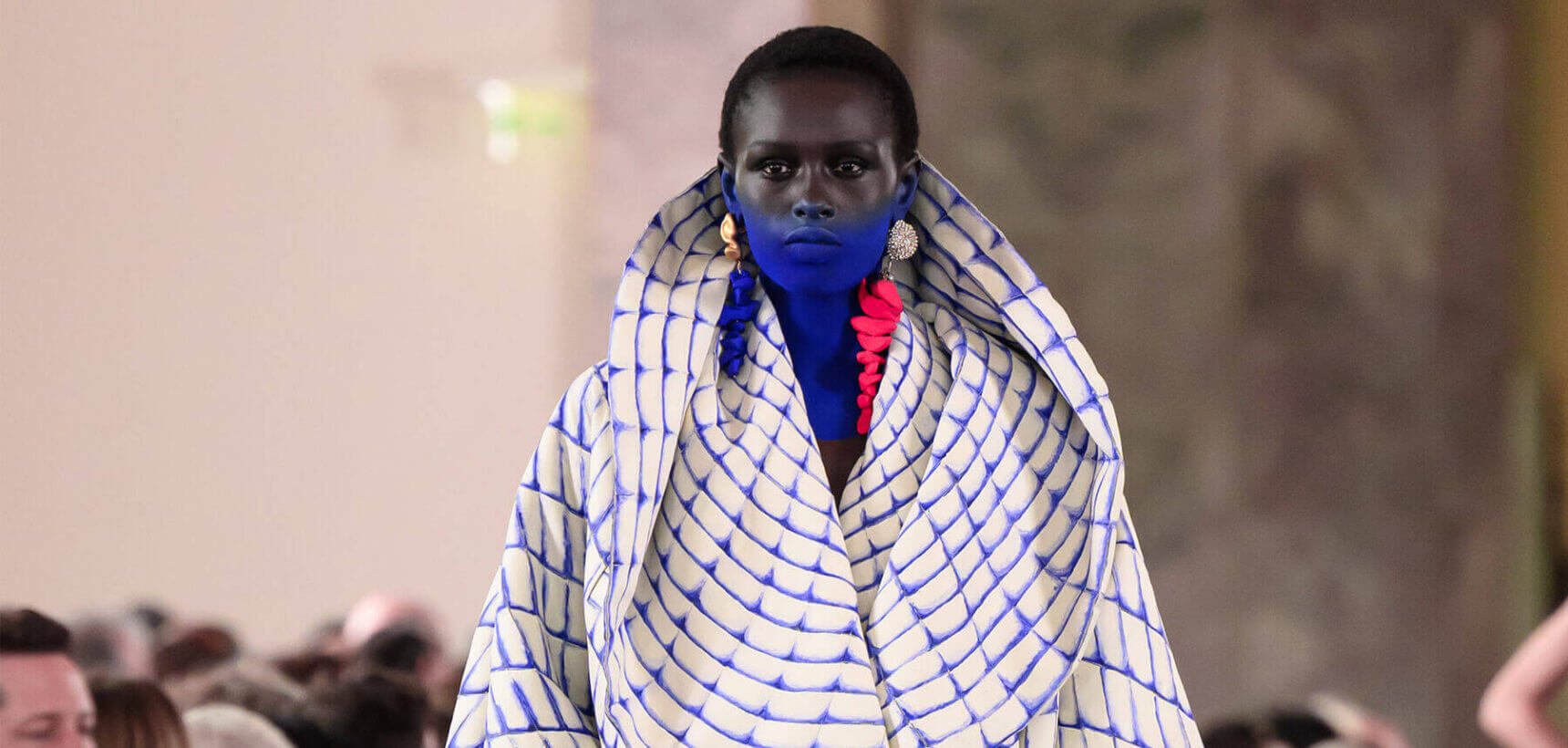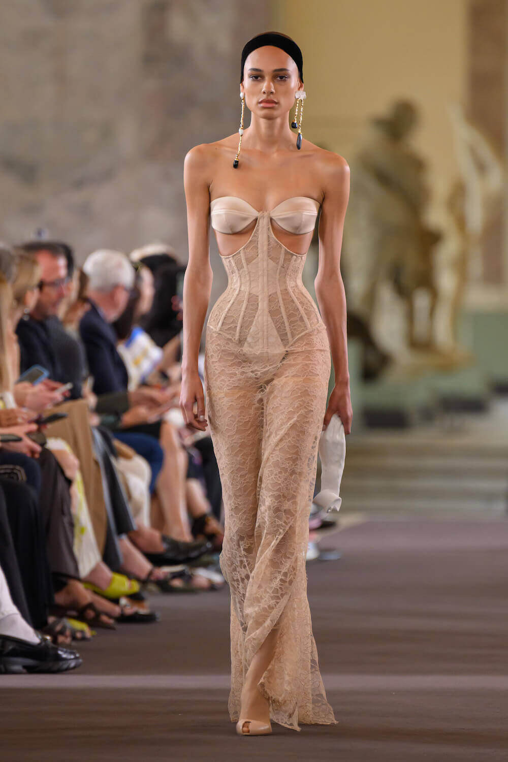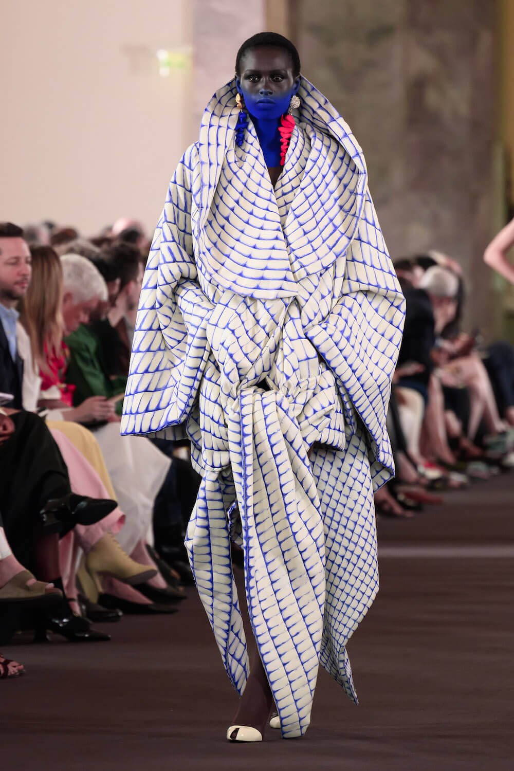 Whilst his previous outings have leant heavily into the surrealist foundations of the house, this couture collection saw a more spontaneous side to Roseberry. Dresses came fashioned from painterly swirls, whilst Yves Klein blue migrated from skater skirts to the necks and torsos of models. Elegant duvet coats proved a highlight, as did a parade of sensually draped corseted frocks with goddess-like qualities. “I wanted this collection to be aggressively, unmistakably human – and to be rooted in artistic references that feel timeless. To dress, decorate, but most importantly, to create, is as primitive as any instinct we have.”