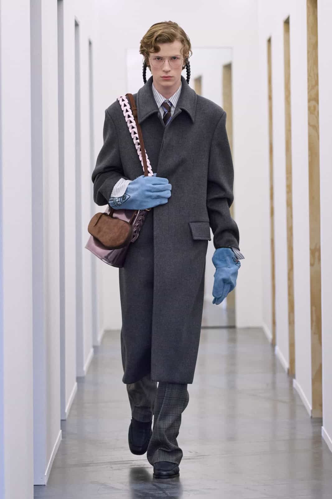Classic menswear codes were interrupted by unexpected workwear elements, with chesterfield overcoats styled with wool and cotton jumpsuits, and sweatpants mixed with structured pinstriped shirts and leather loafers.