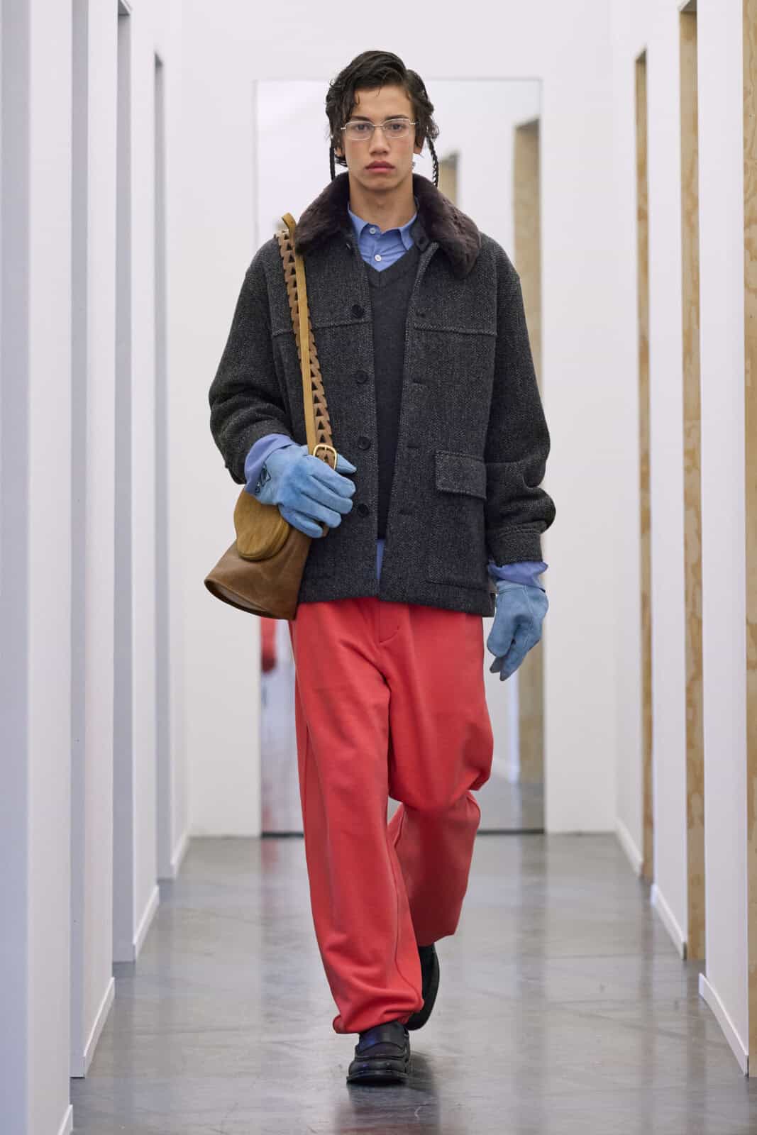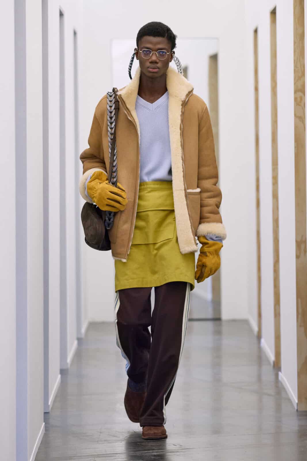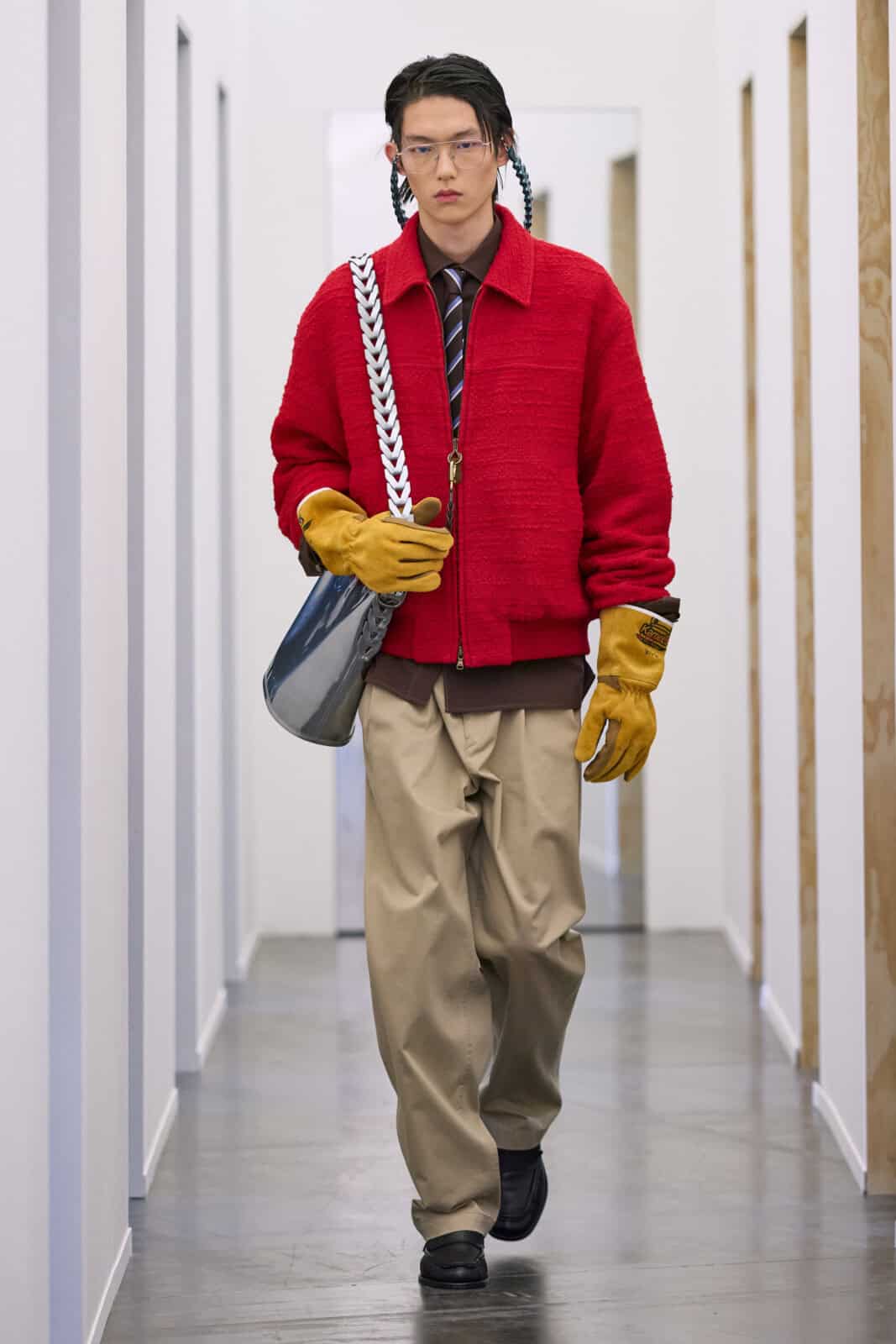Throughout, office winter dressing met utilitarian workshop attire, as heavy hardware aprons and work gloves enriched elegantly tailored tweed suits. The colour palette similarly embraced this dance of restraint and release, with almond milk, dust grey and shadowed tones forming the base for vibrant pops of electric blue, ginkgo yellow and scarlet.