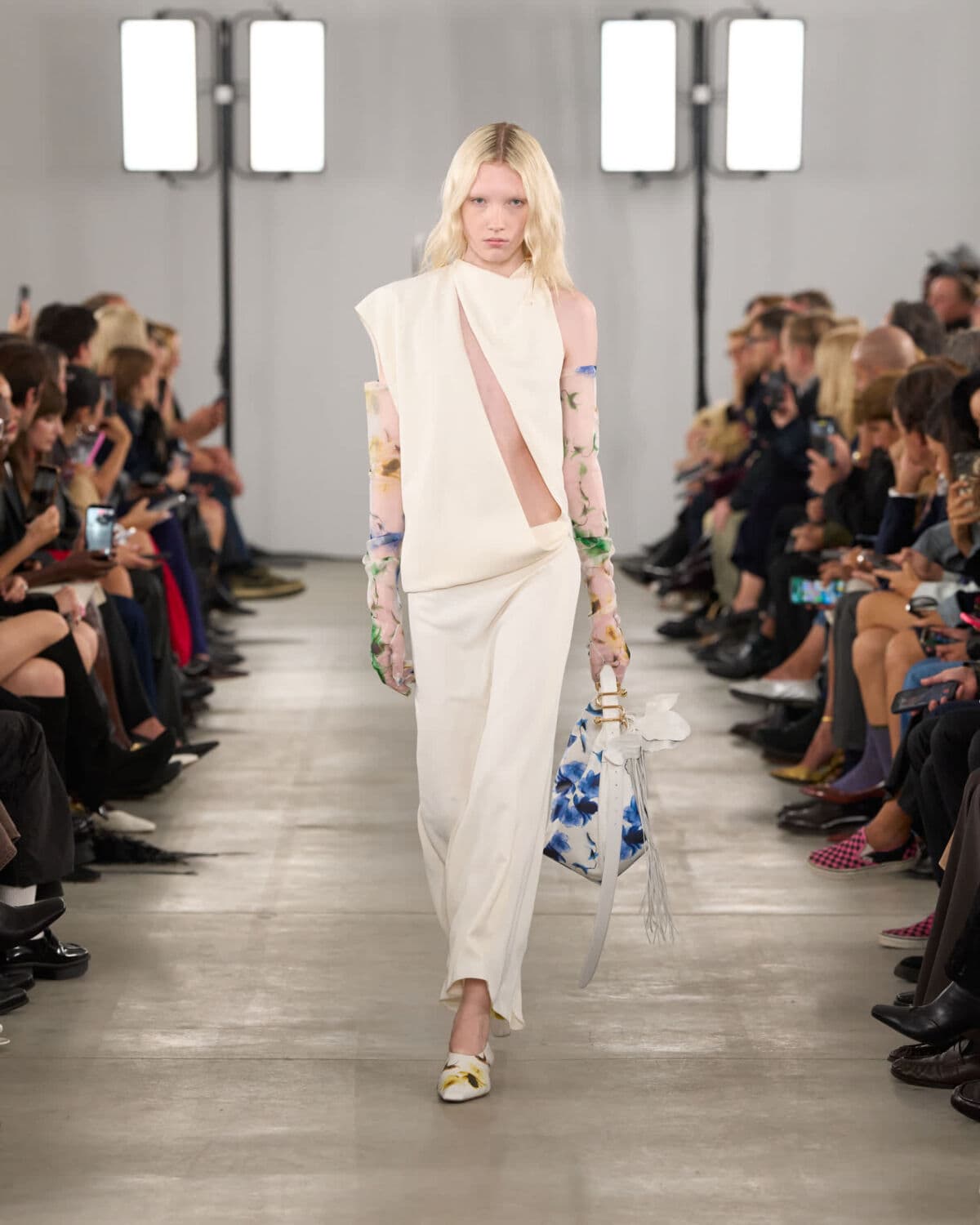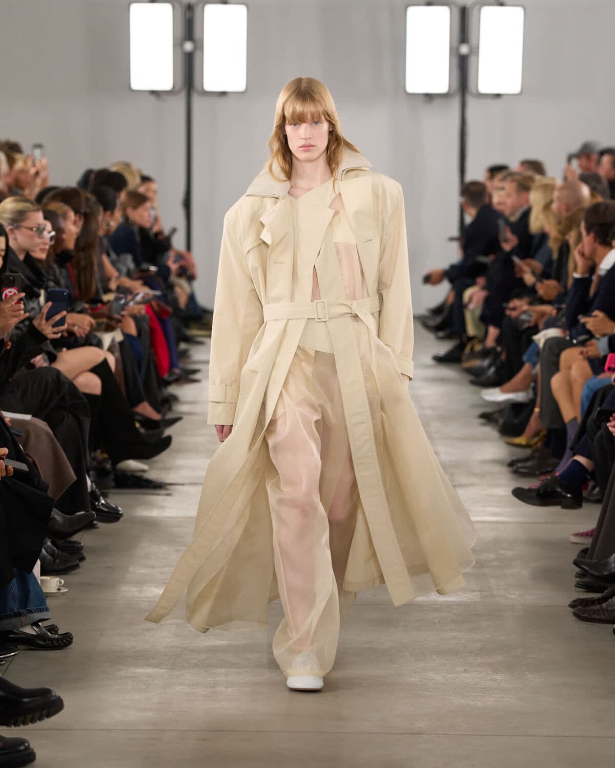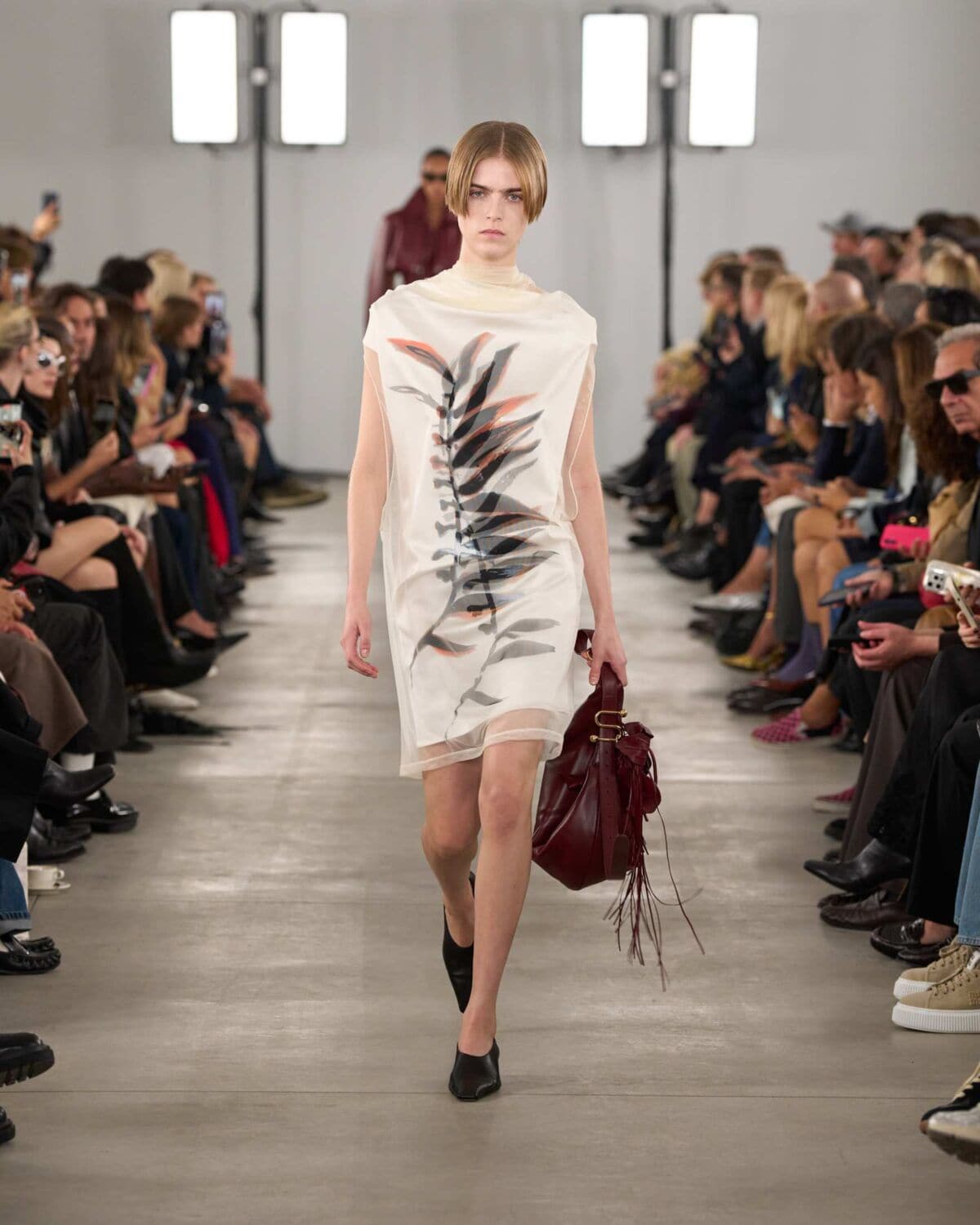 Organza featured prominently and was worked into classic shapes like trenches and tailored trousers, giving them an unexpected lightness. Doublé wool and soft glove leather grounded the collection, bringing weight and form to otherwise fluid silhouettes. Botanical prints – conceived from drawing painted using Japanese lipsticks and nail polishes – appeared in layered sheers, offering subtle movement and colour without overwhelming looks.