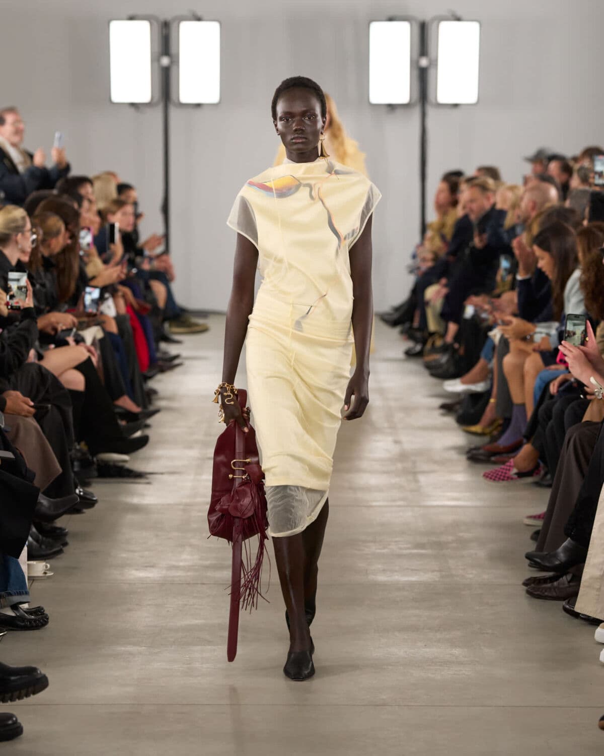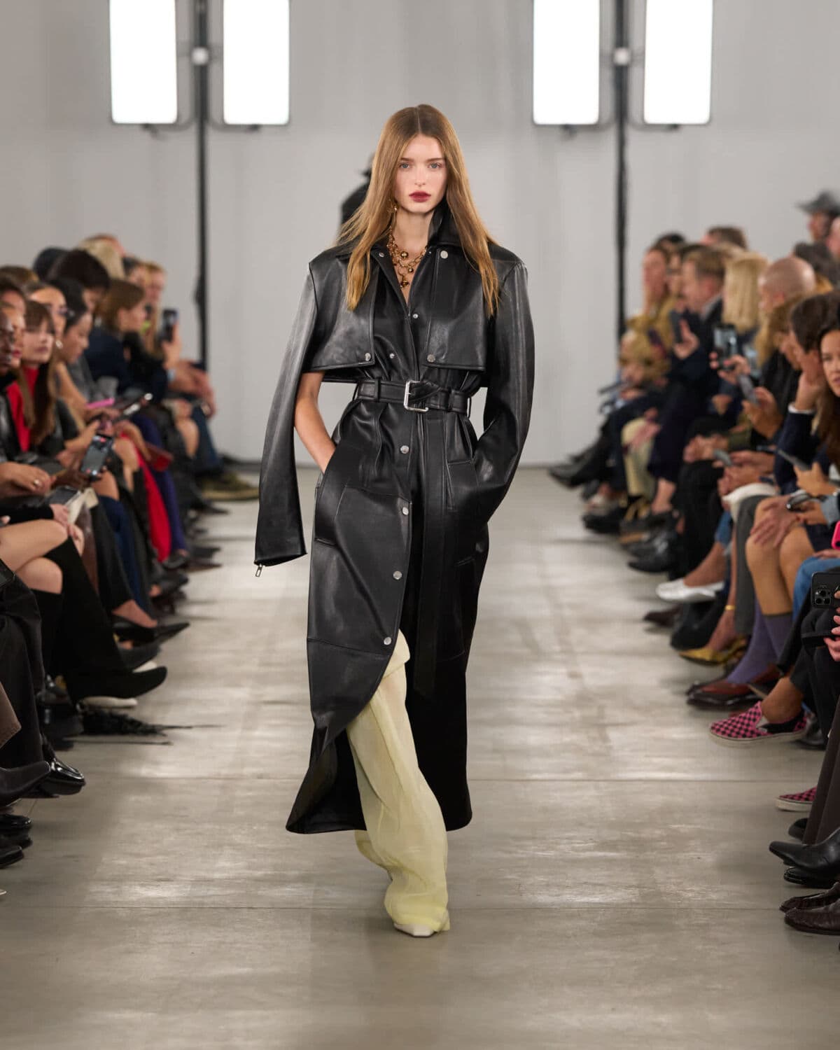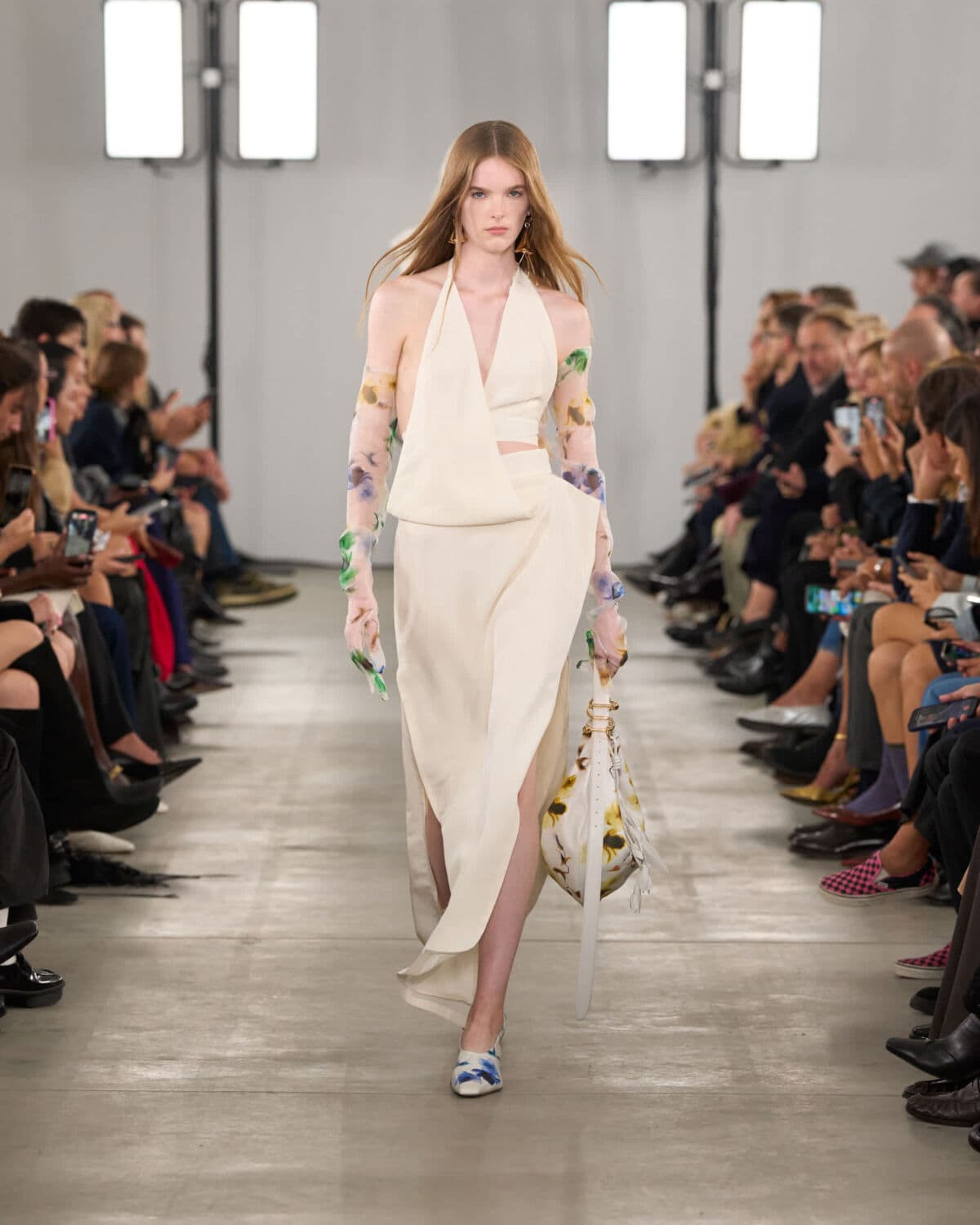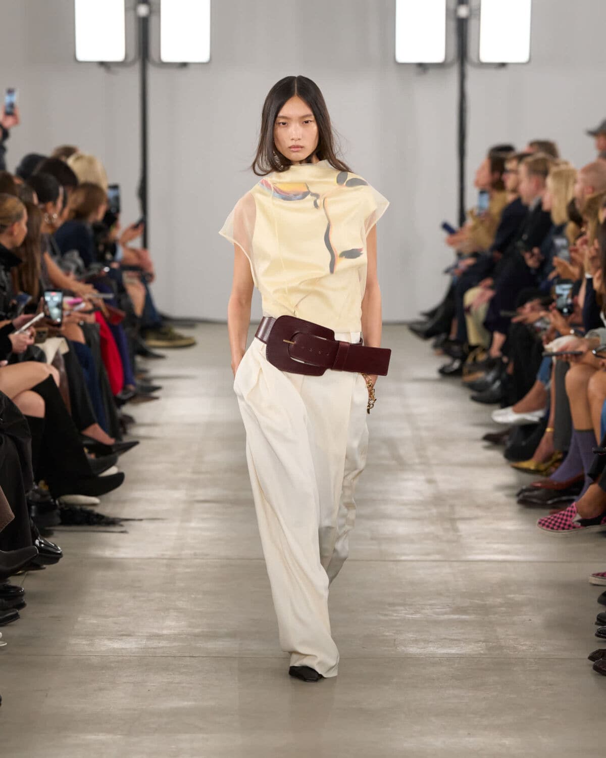 Organza featured prominently and was worked into classic shapes like trenches and tailored trousers, giving them an unexpected lightness. Doublé wool and soft glove leather grounded the collection, bringing weight and form to otherwise fluid silhouettes. Botanical prints – conceived from drawing painted using Japanese lipsticks and nail polishes – appeared in layered sheers, offering subtle movement and colour without overwhelming looks.