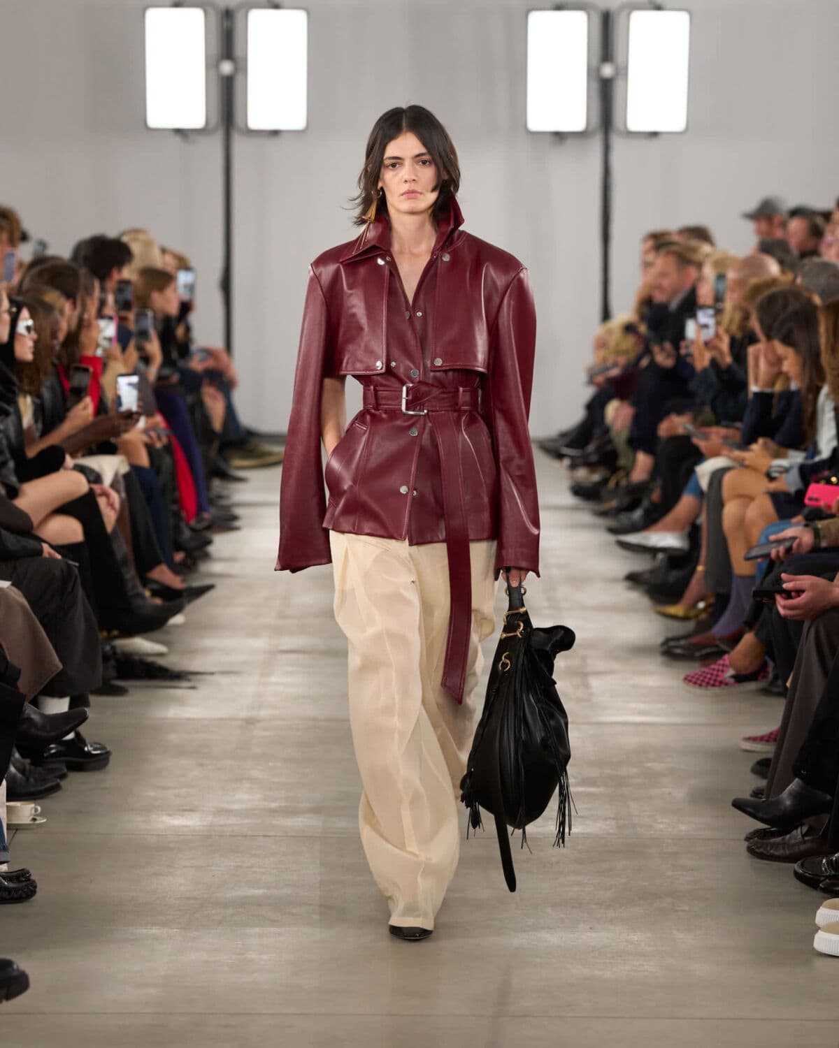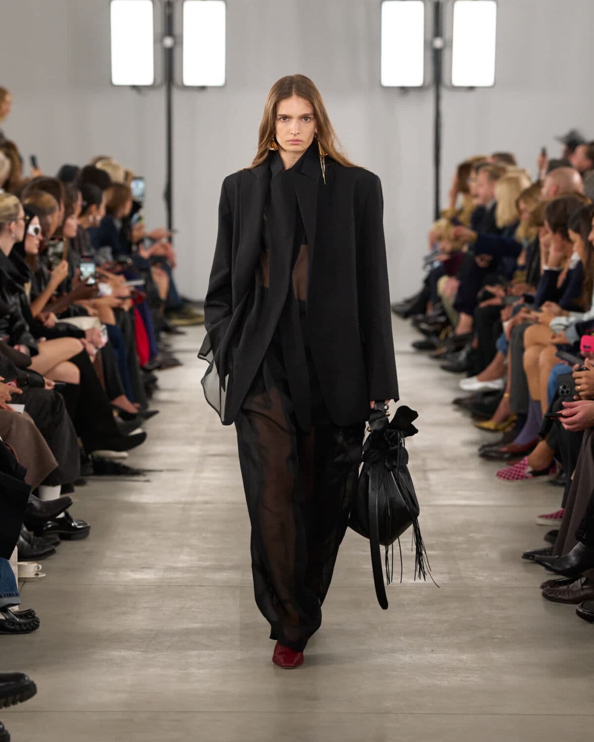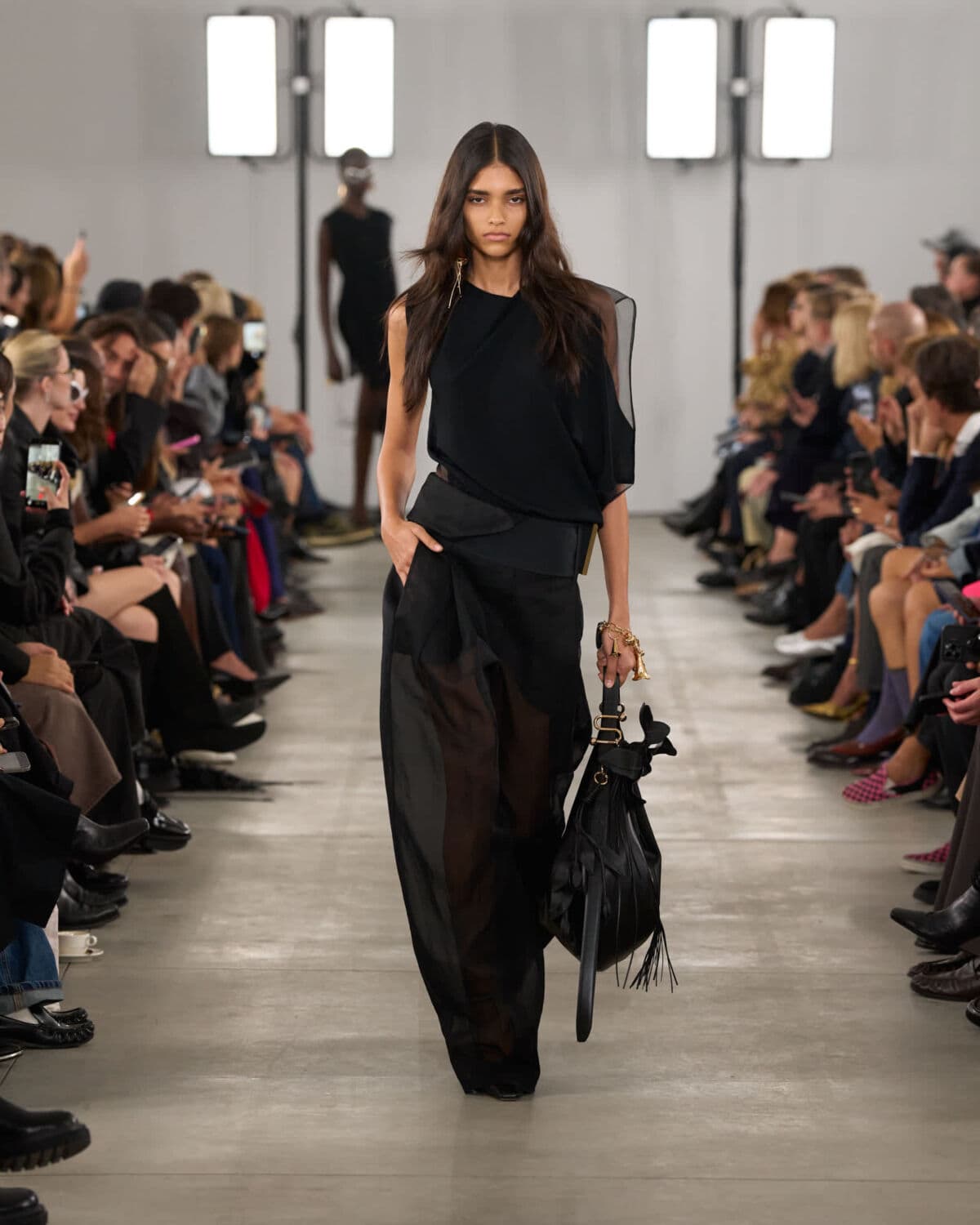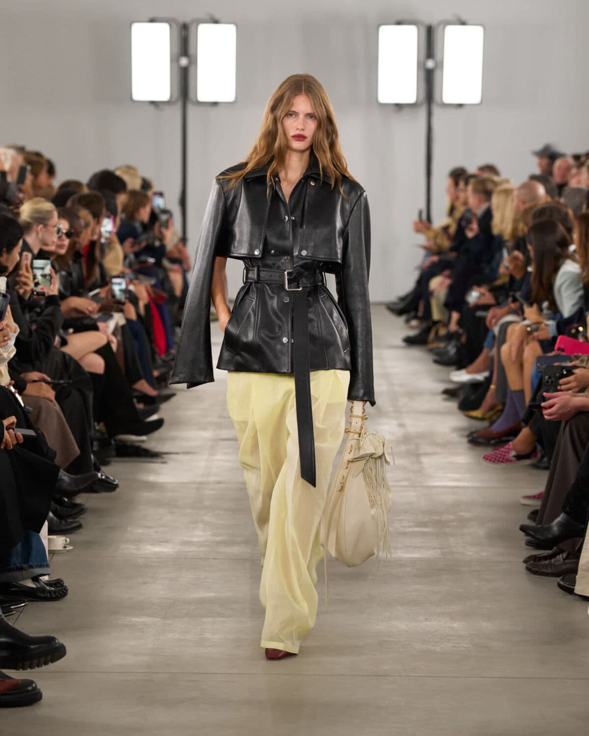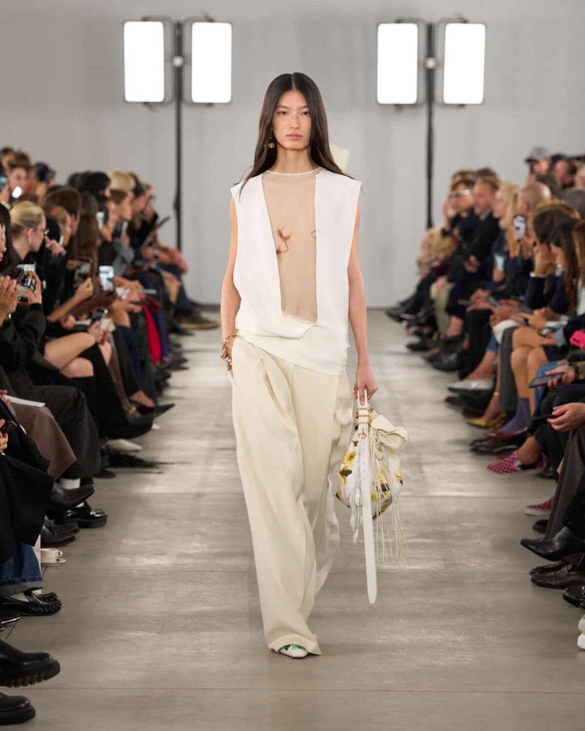 Gilets and bra tops were styled as versatile base layers, worn both under and over, playing with transparency and proportion. Accessories stayed close to the body: kitten-heeled mules and soft S-hardware bags adorned with small leather flower charms.