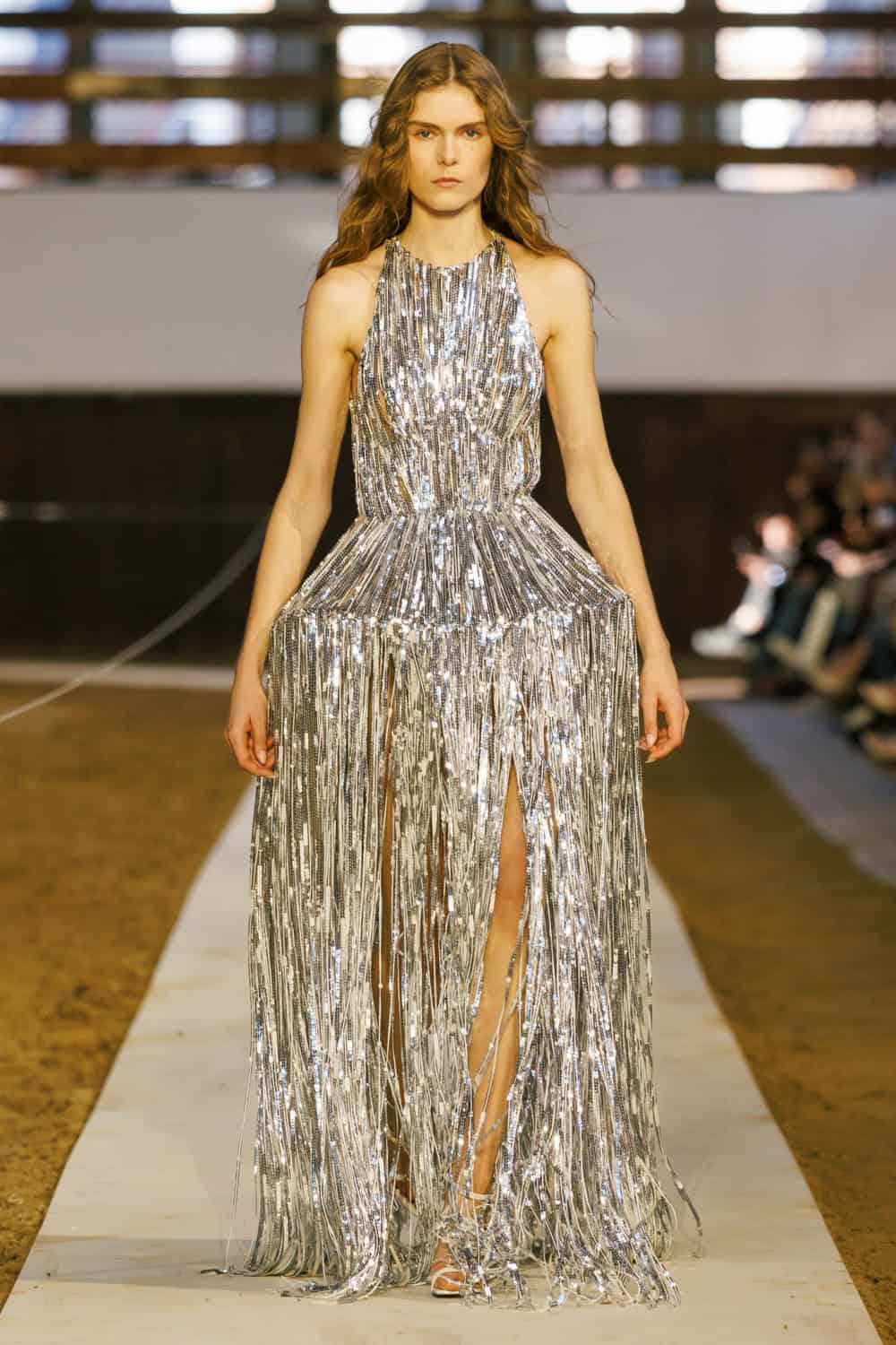 French horse whisperer and rescuer Jean-Francois Pignon returned to the runway, leading on from McCartney’s AW23 show which then saw seven Camargue steeds galloping and rolling around to Depeche Mode’s Personal Jesus. This time around about a dozen black or white horses cantered in formation, at times dropping to the ground to perform impressive rolls, sparking a series of yips and cheers from the fash pack. It was a spectacle with substance – a reminder of McCartney’s long-held commitment to animal welfare and her refusal to use leather, fur or skins since launching her brand in 2001.