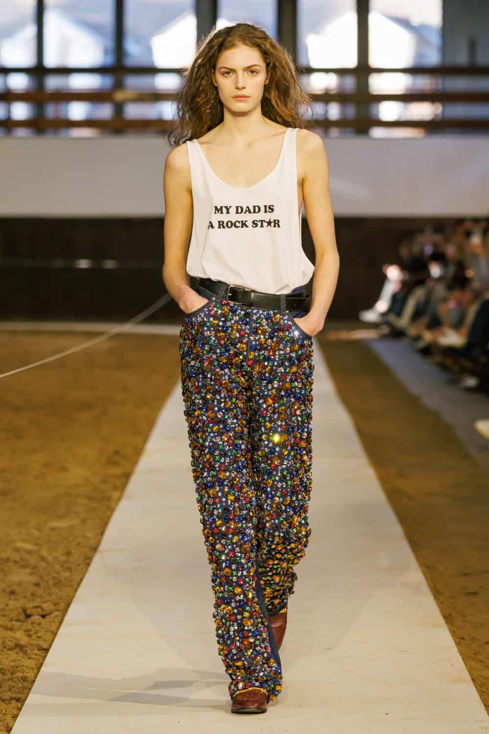 A palette of primaries and rust was grounded by camel, chocolate and grey. There were flashes of vintage lace and moiré, recycled denim with cargo zips and lead-free crystals, equestrian detials, preppy striped polos and a returning ‘My Dad Is A Rockstar’ tank. At 93 per cent sustainable materials, it felt like a celebration of freedom – personal, ethical and hard won. Horse girls unite.