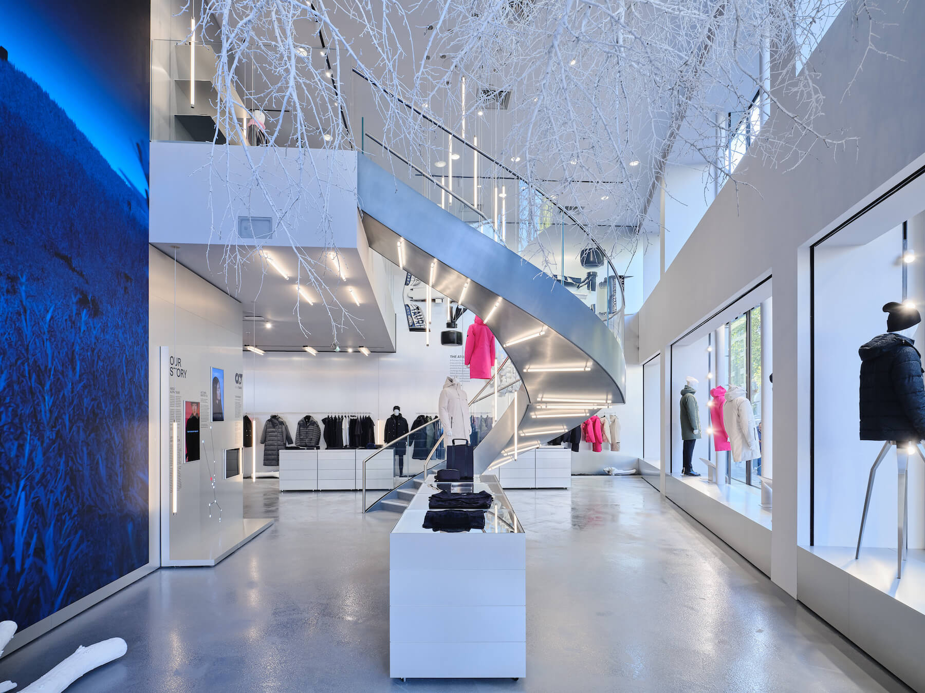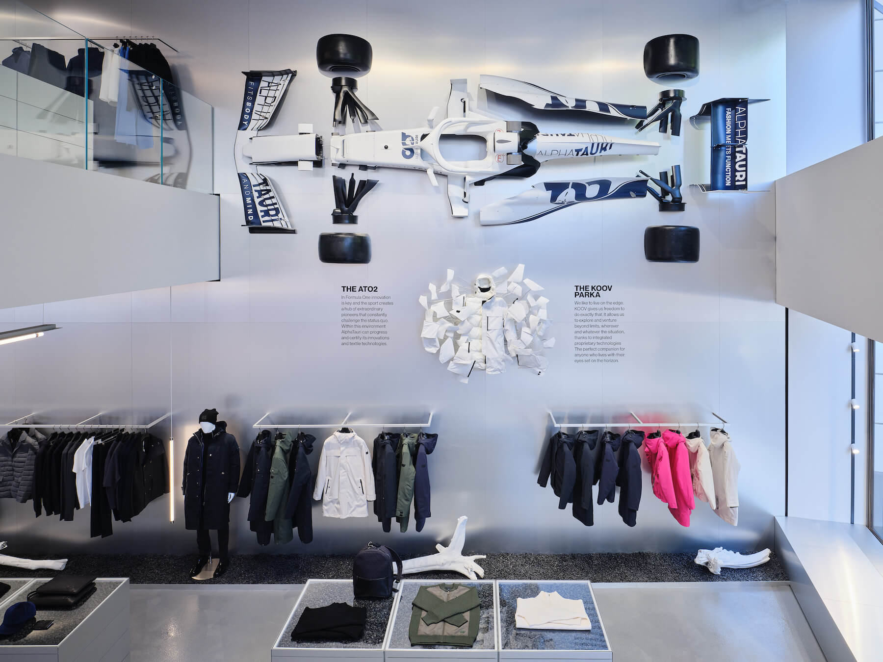 Get your butt down to Knightsbridge cause AlphaTauri just set up shop. The Red Bull founded premium fashion label’s new flagship boasts an exceptional interior set up designed by Studio Riebenbauer. Think slick monochrome walls made of brushed aluminium, white full-size trees hanging upside down from the ceiling, interspersed natural materials, specially designed lights and more. There’s even a unique Formula 1 racing car model, assembled from original parts by the Scuderia AlphaTauri racing team, plastered to one wall, which serves as an unmissable reminder of the brand’s deeply rooted links to F1 and the gassed-up universe of motorsports.