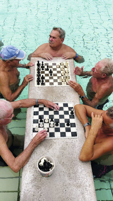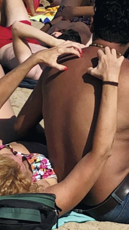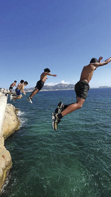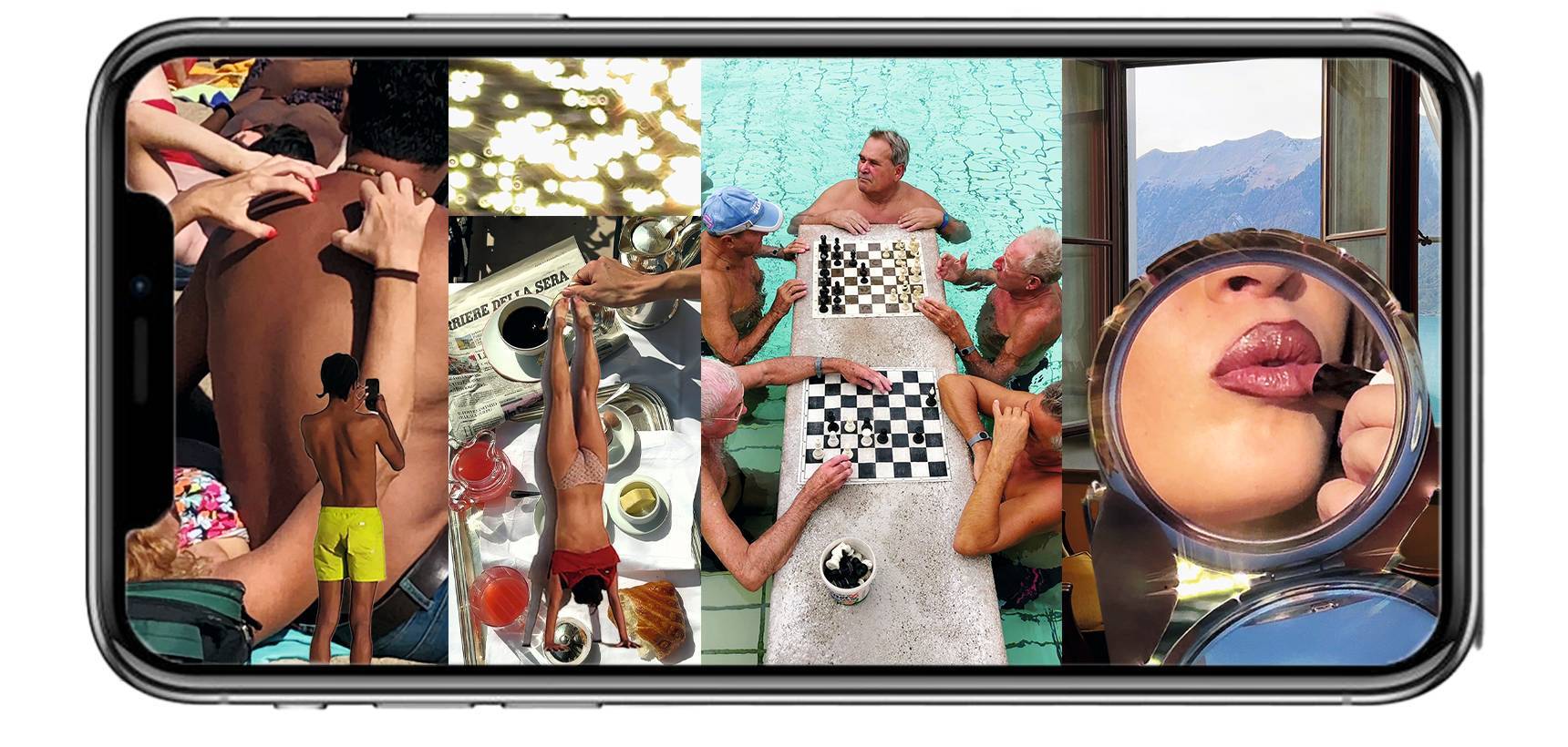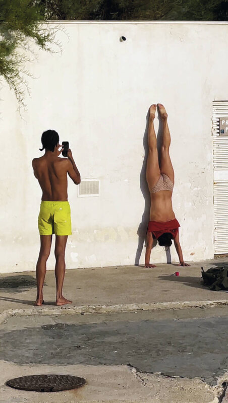 Designed to mirror the in-real-time, in-real-life format of Instagram Stories, Somewhere kicks off with pages featuring sunrises over the aquatic gardens of Xochimilco in Mexico City and wraps up with images shot at dusk, including of a cat at sunset in Essaouira, Morocco. Youkilis painstakingly combed through old clips to select frames to include in the book. Metadata stored in his phone’s photo library helped curate themes around time of day (“7.07 a.m.” or “12.33 p.m.”), color (one diptych shows a woman’s fire-truck-red swimsuit next to the ruddy complexion of a Mediterranean holidaymaker), and human behavior (“gestures of romance”). “Sometimes it’s like I can see the images in the book as though they’re moving, even though they’re stills,” he says. “I know which frames aren’t there.”