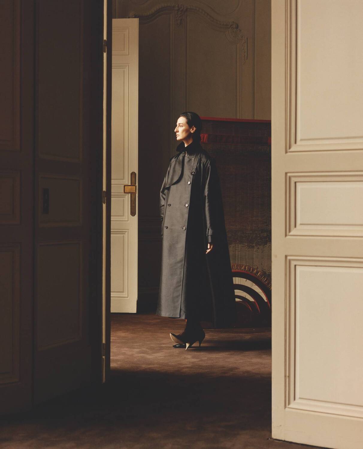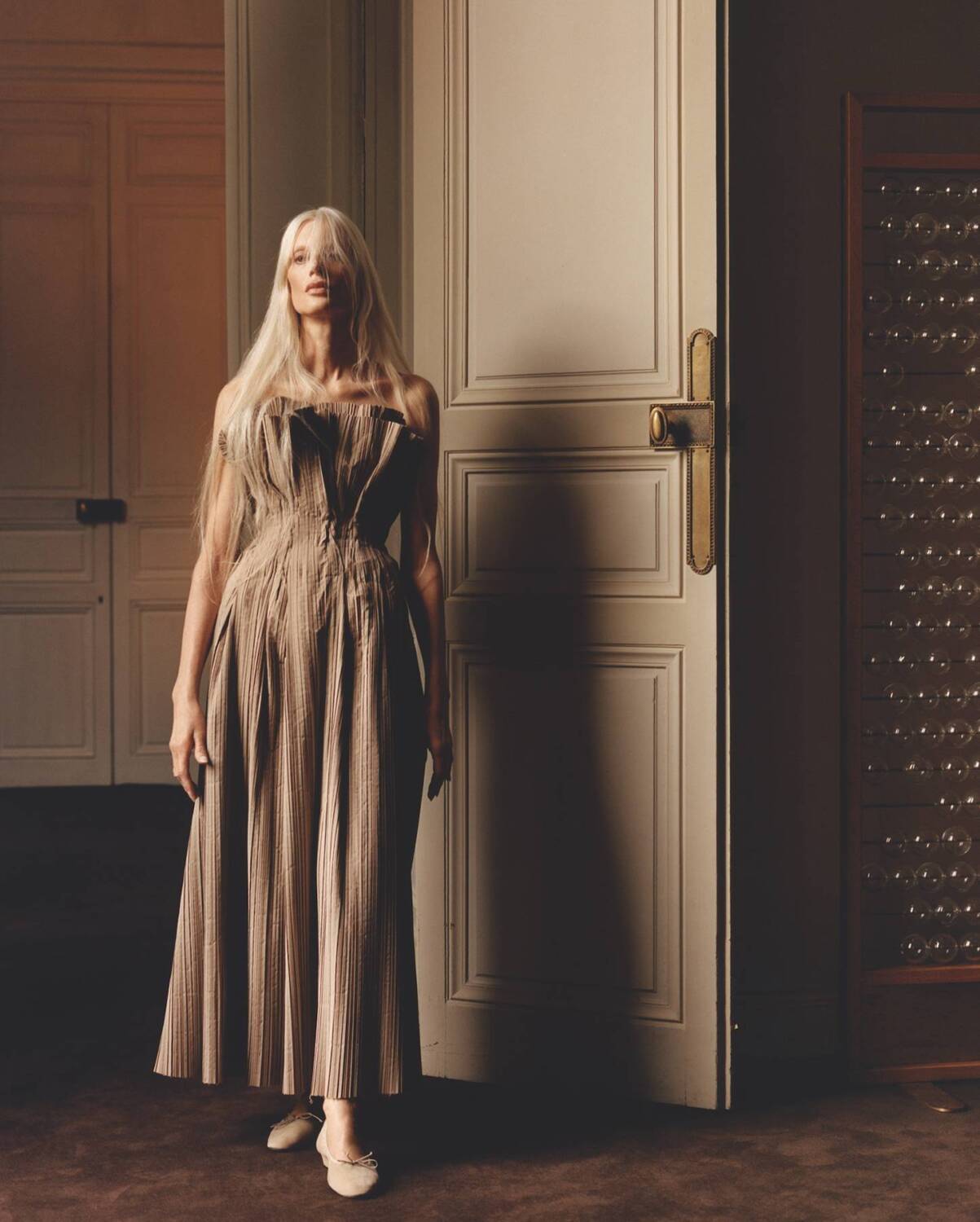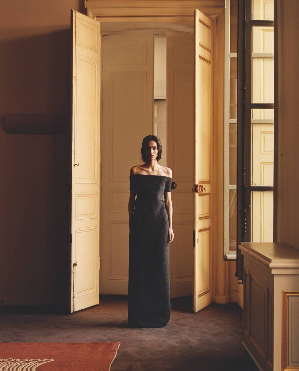 The Row’s FW24 show took place amid the rococo interiors of a villa on the Rue des Capucines in Paris, with some attendees no doubt surprised that a no-phone policy was being applied to proceedings. The label’s founders, Mary-Kate and Ashley Olsen, wanted their audience to fully immerse themselves in their design machinations, and who could blame them? The parade of perfectly constructed coats paired with bodice dresses and the models who were wearing them deserved everyone’s undivided attention. Our forever favorite Kristen McMenamy strutted in a structured, pleated beige gown, her signature snow-white locks flowing behind her, while Mica Argañaraz and Rianne Van Rompaey wore long wool coats effortlessly draped in that very Olsen-esque manner. The casting director Ashley Brokaw had added some newer faces to the lineup too. Particular standouts were the Chilean model Sara Caballero in a long black off-the-shoulder dress and Awar Odhiang in a silver-bell headpiece. As we reach the apex of social media usage, quieting our phones to live in the Olsens’ world for a moment isn’t such a bad thing.