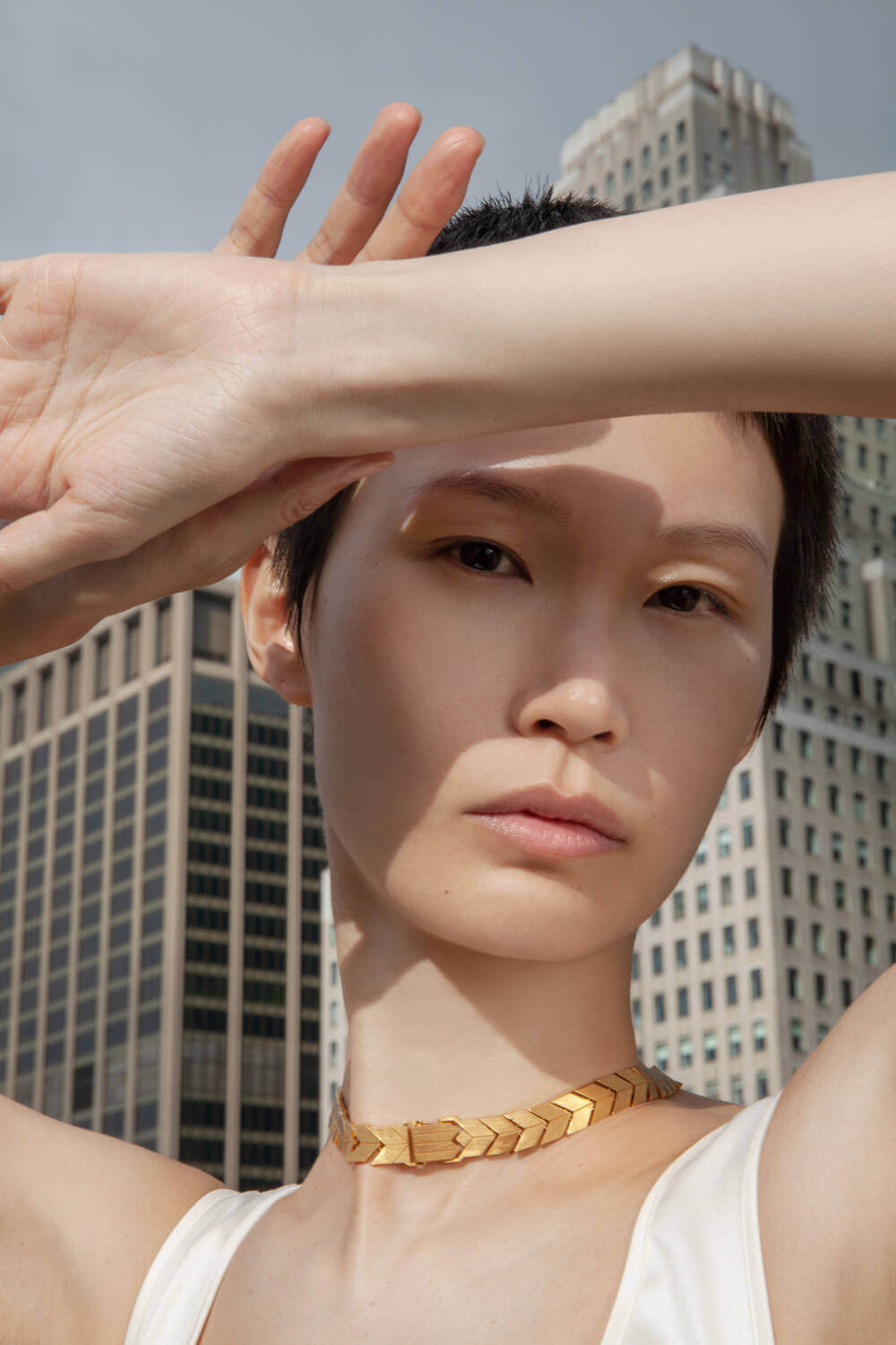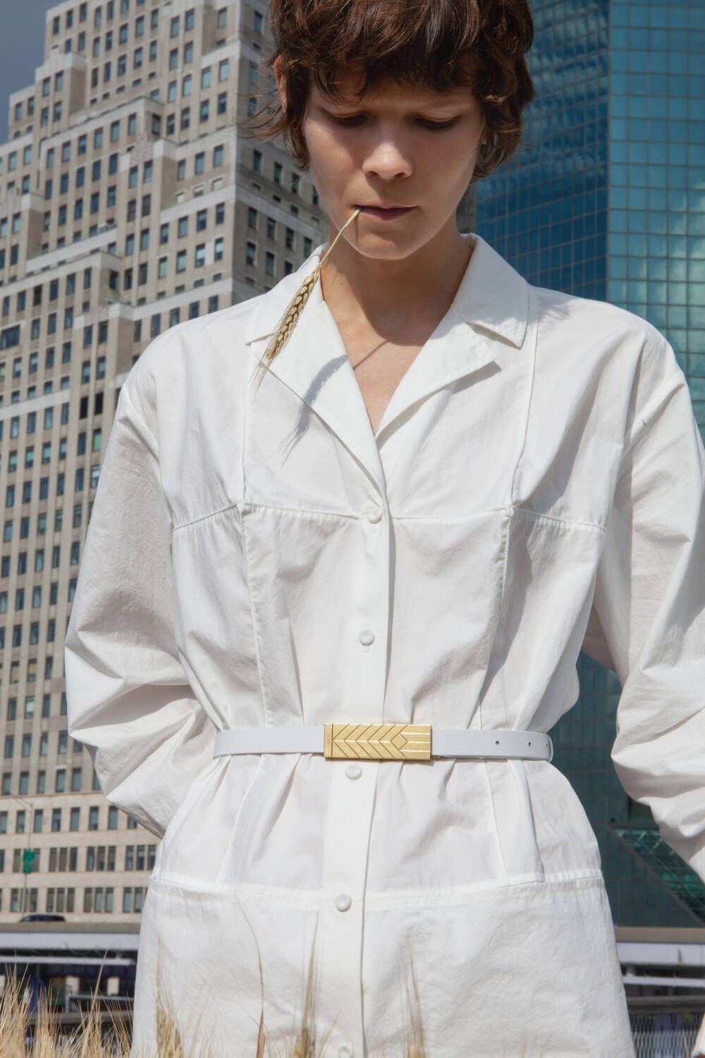 Known globally for its Spikelet jewellery, the chevron-esque line is a central pillar of the Bevza brand. First shown in New York in 2019, the Spikelet motif – inspired by wheat – was a way of translating a story about the beauty of Ukrainian landscapes, referring in particular, to the Eastern European country’s status as one of the top exporters of grains worldwide. Since the start of the war, the Spikelet has become a sartorial symbol that represents what Ukrainians are fighting for – freedom, the preservation of their culture and history, and peace. “The land that we defend feeds a lot of other countries,” she says. “For us, wheat has always been a sacred symbol and is the core symbol for Bevza.” Spikelet necklaces especially – though it also appears across belts, bags, bracelets and earrings – became popular rather quickly, not only amongst the women that had to flee Ukraine following the tumultuous institution, and bitter ugliness, of the Russian war on the country, but also among women all over the world. Women felt drawn to Spikelet’s beauty and its powerful connection to Ukrainian heritage, its fertile land and its people’s bravery and dedication to hard work.